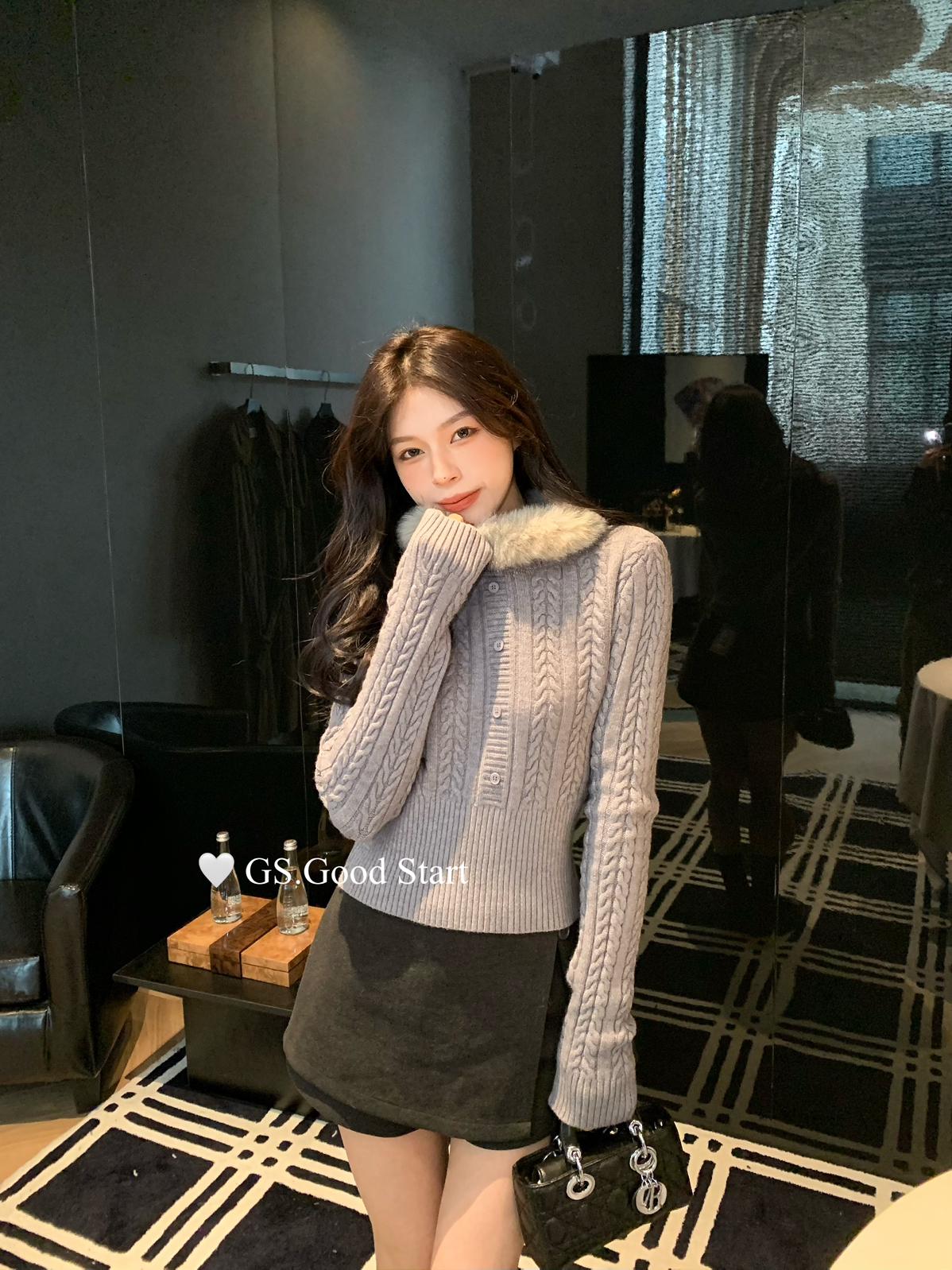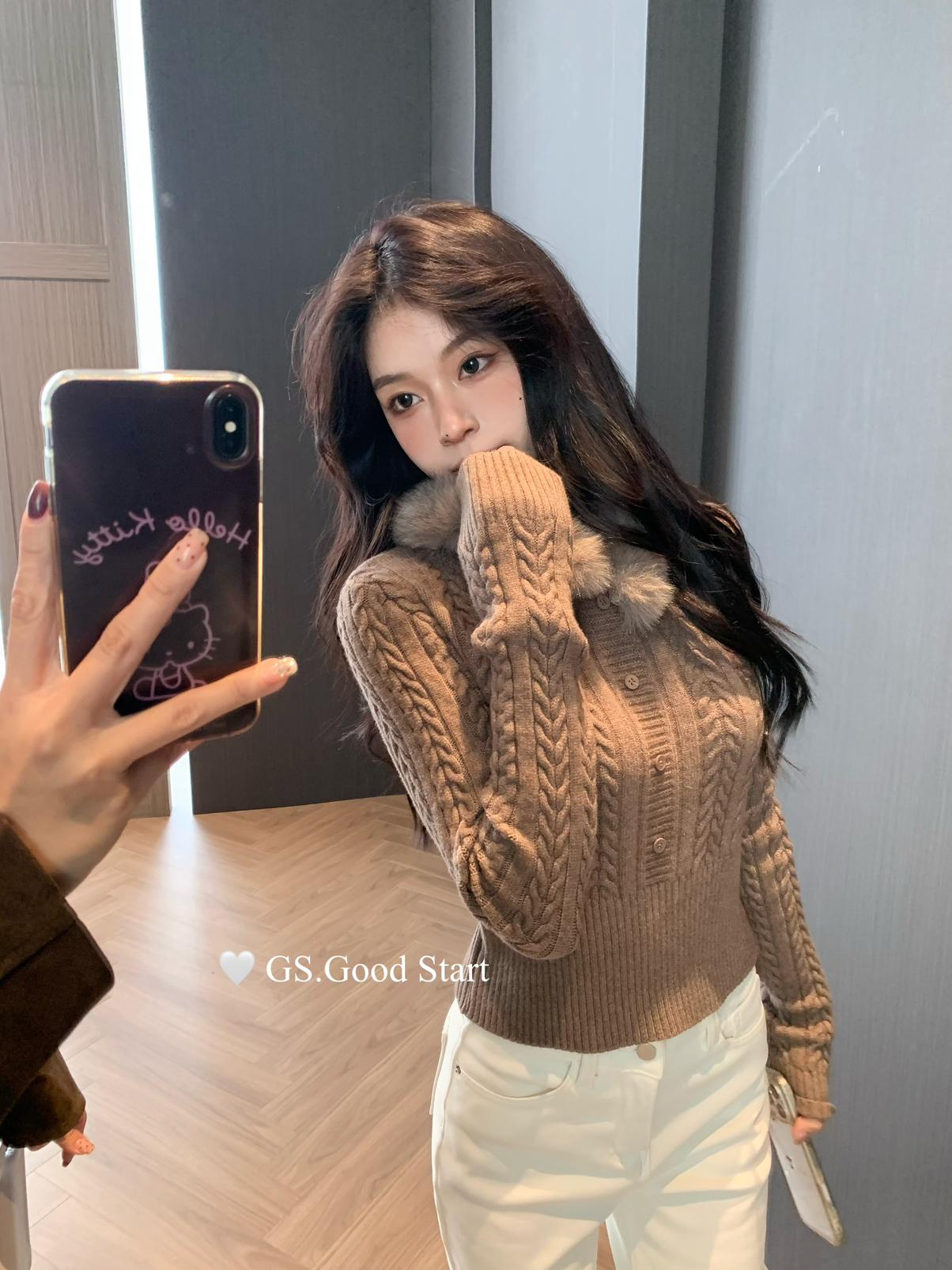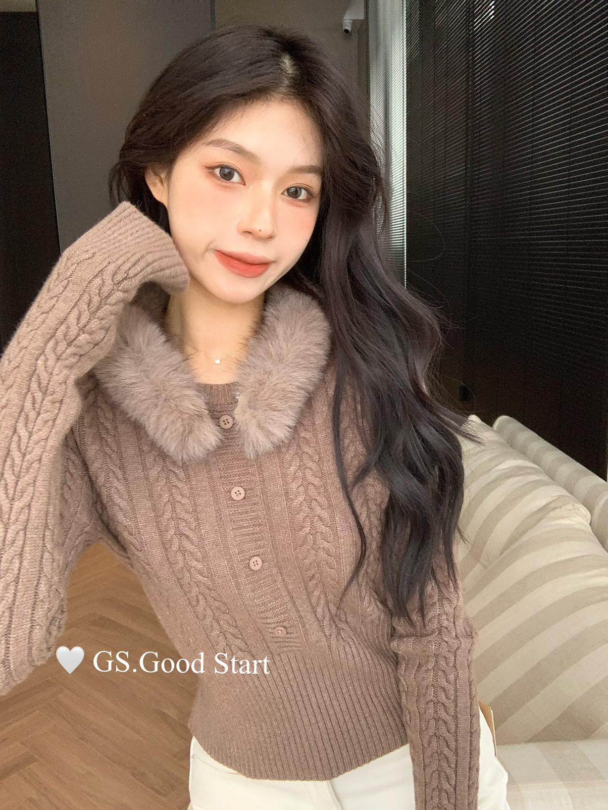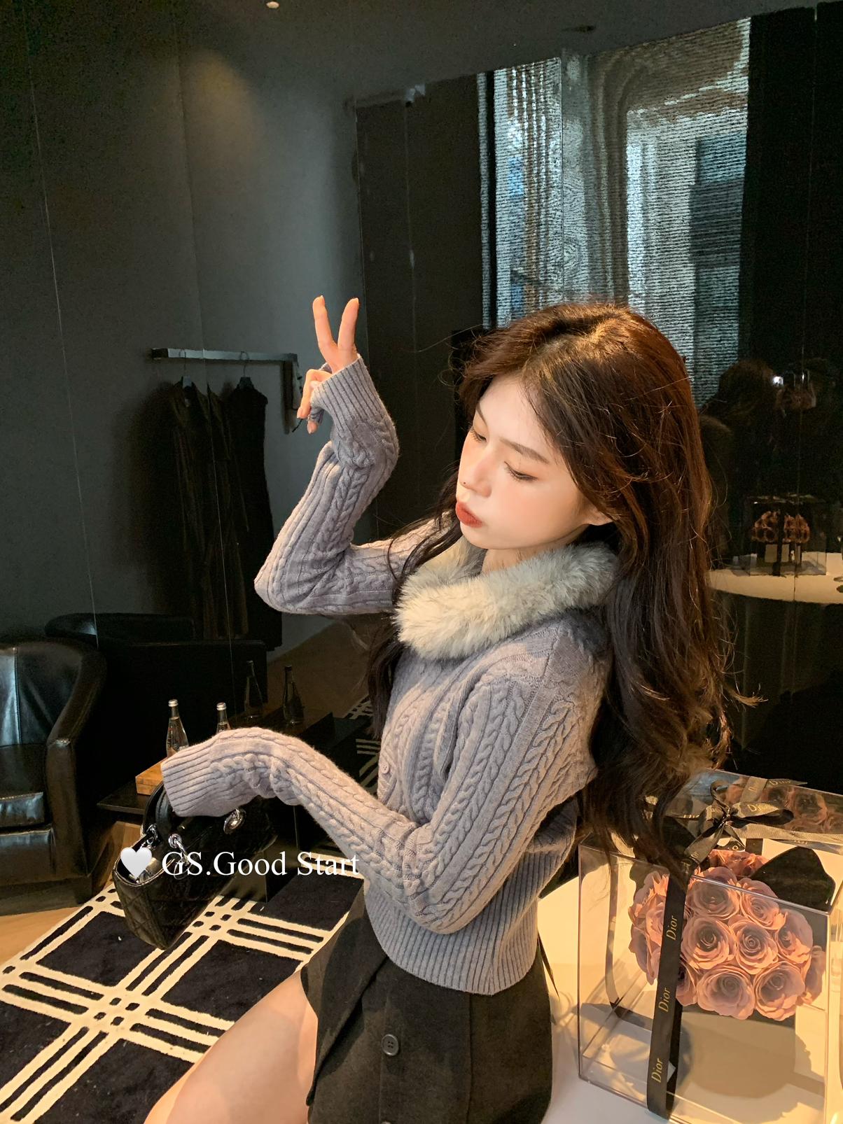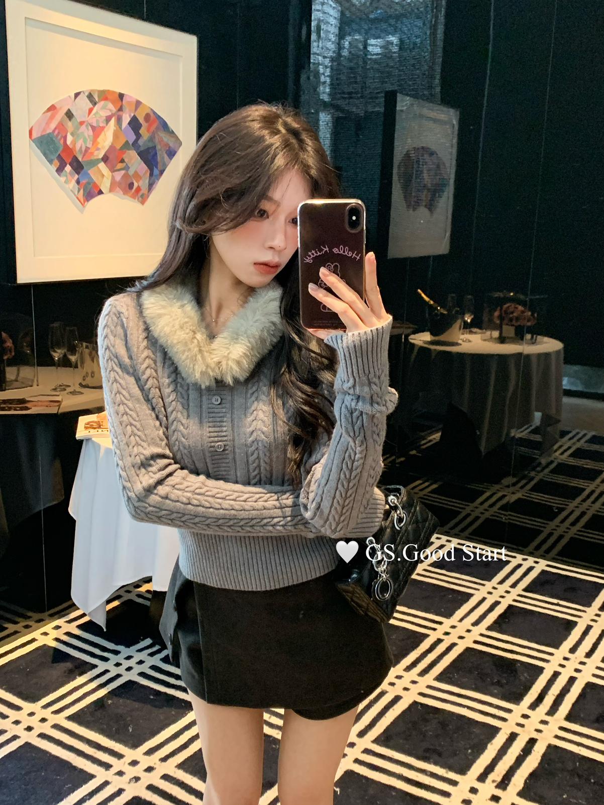 【C7942】被問爆啦~高顏時髦選手*全店自留!秋冬復古純欲毛毛領麻花針織小衫(配可拆卸毛領)