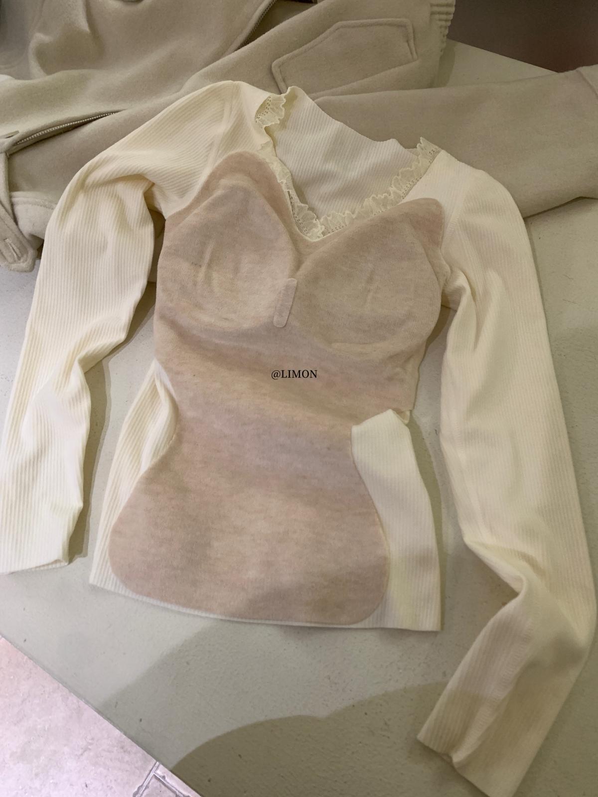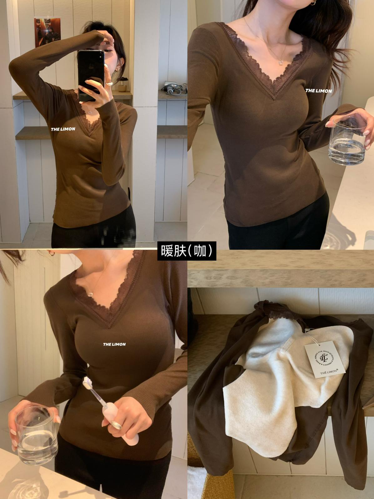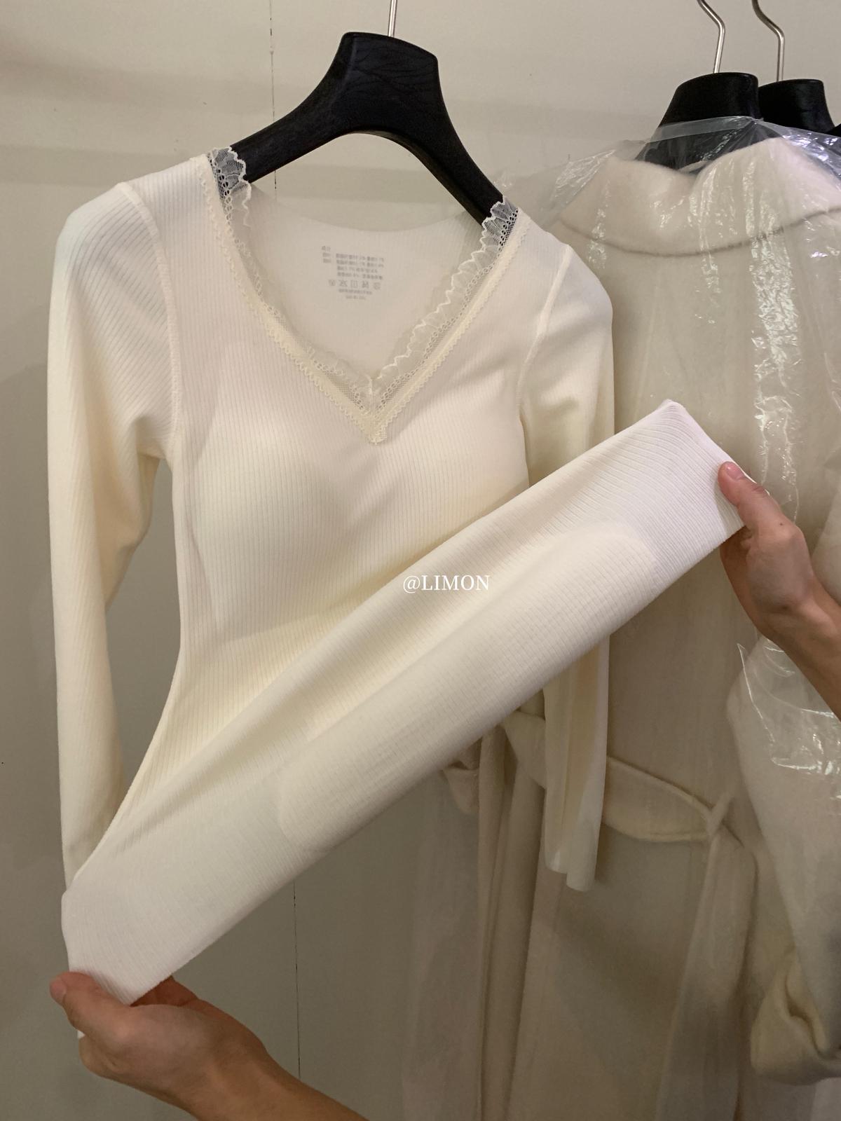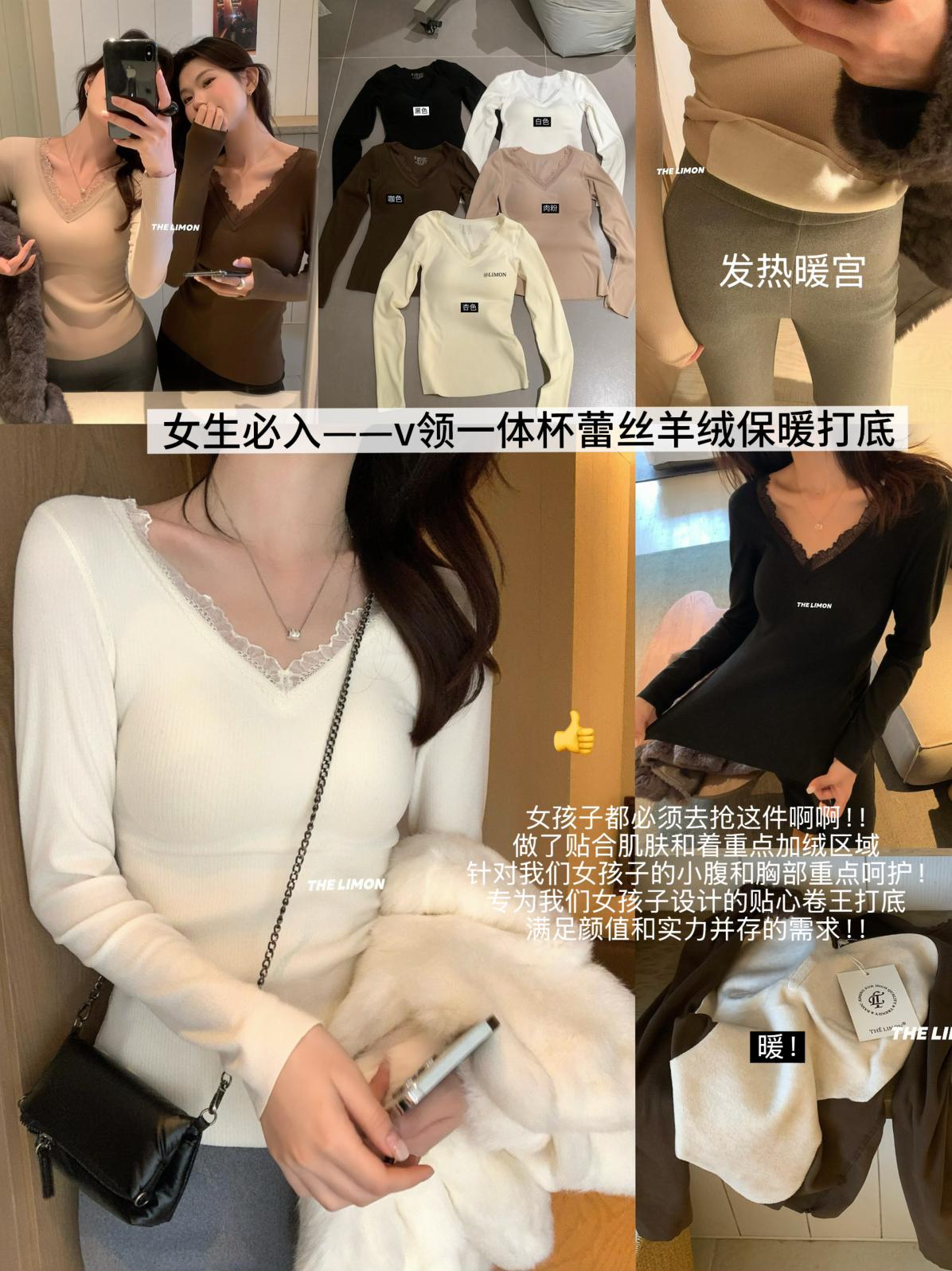 【C7948】高彈蕾絲V領保暖一體杯自發熱內搭外穿加絨打底衫