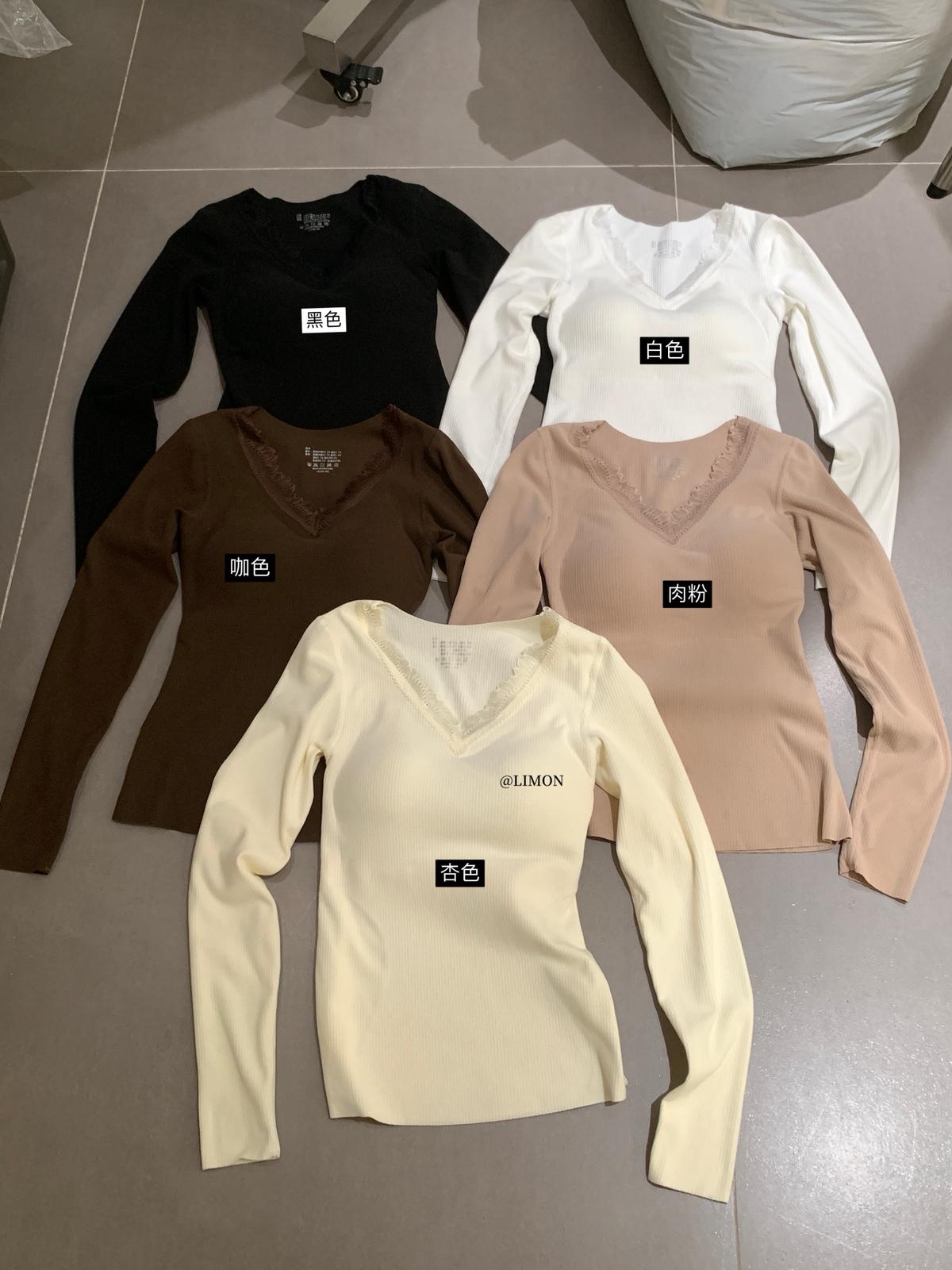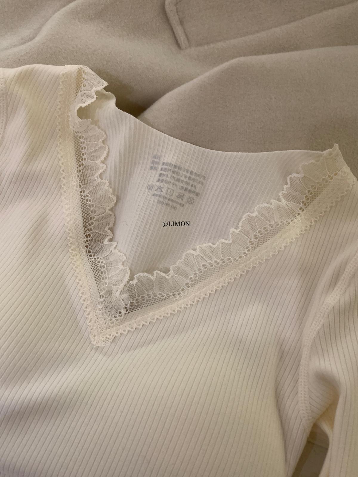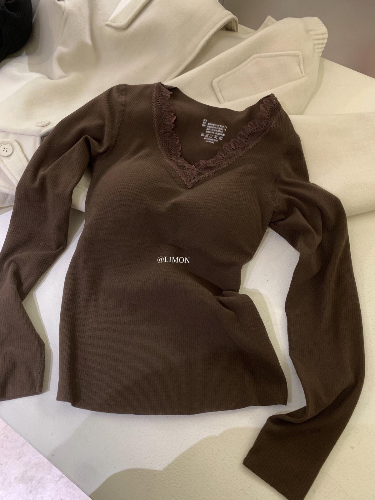 【C7948】高彈蕾絲V領保暖一體杯自發熱內搭外穿加絨打底衫