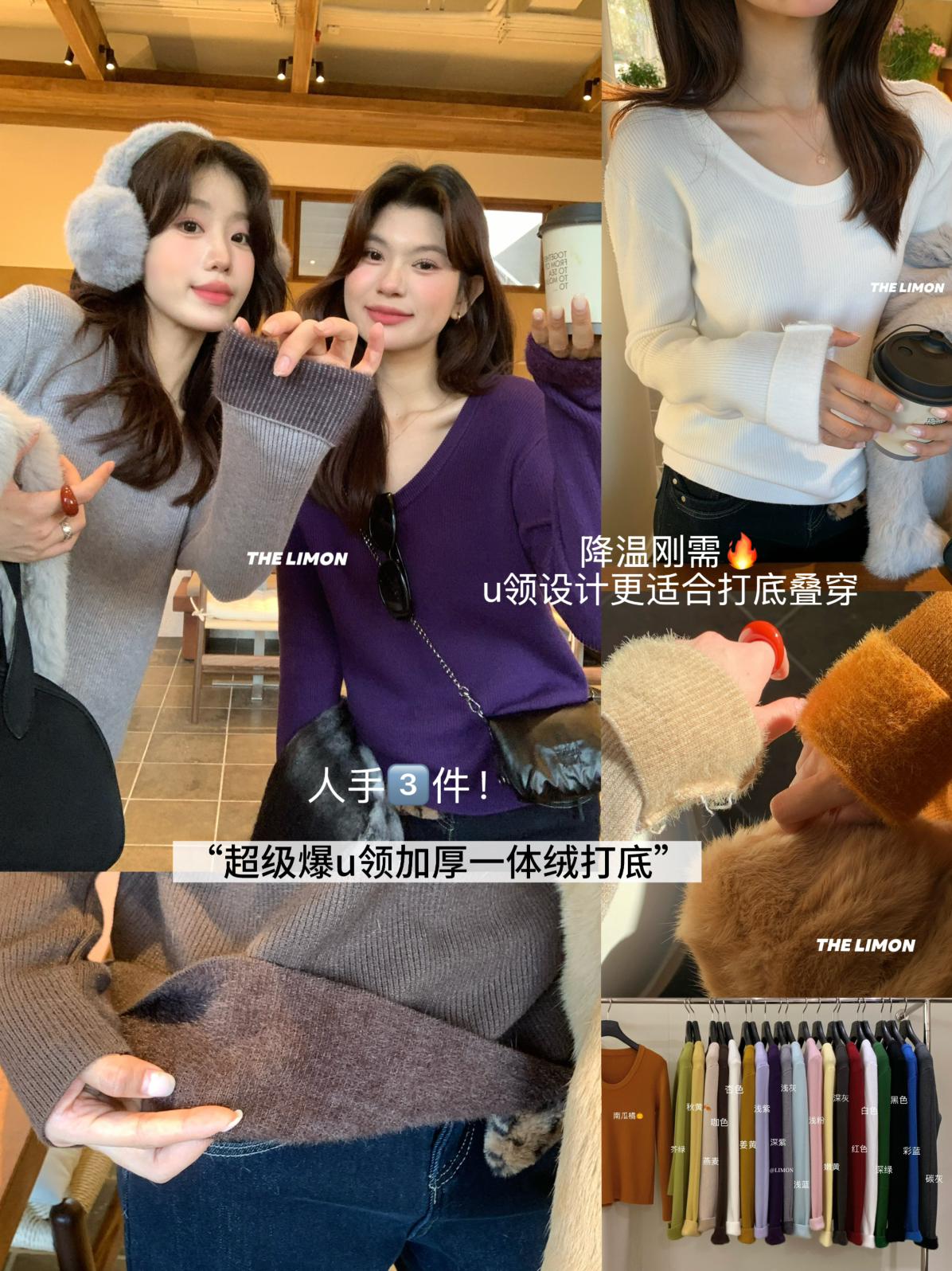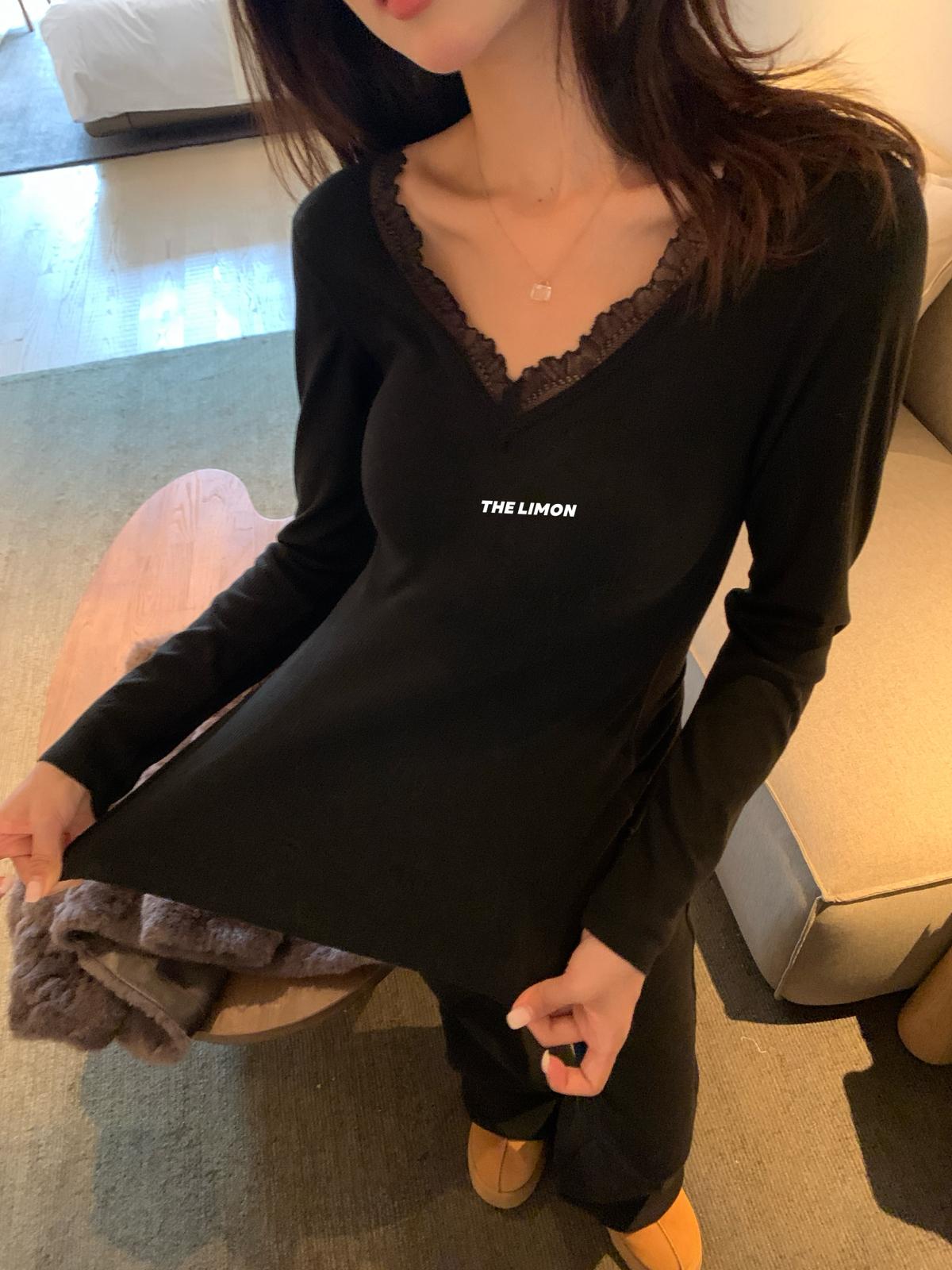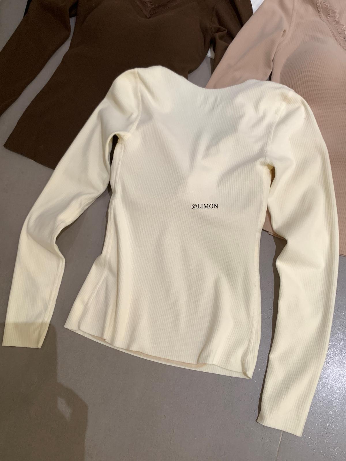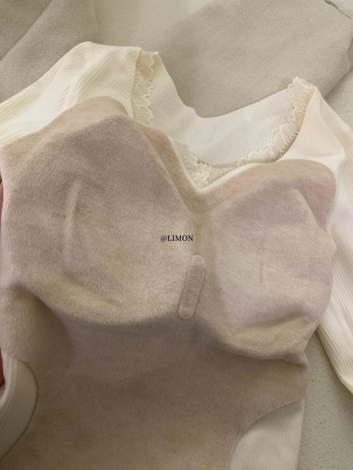 【C7948】高彈蕾絲V領保暖一體杯自發熱內搭外穿加絨打底衫