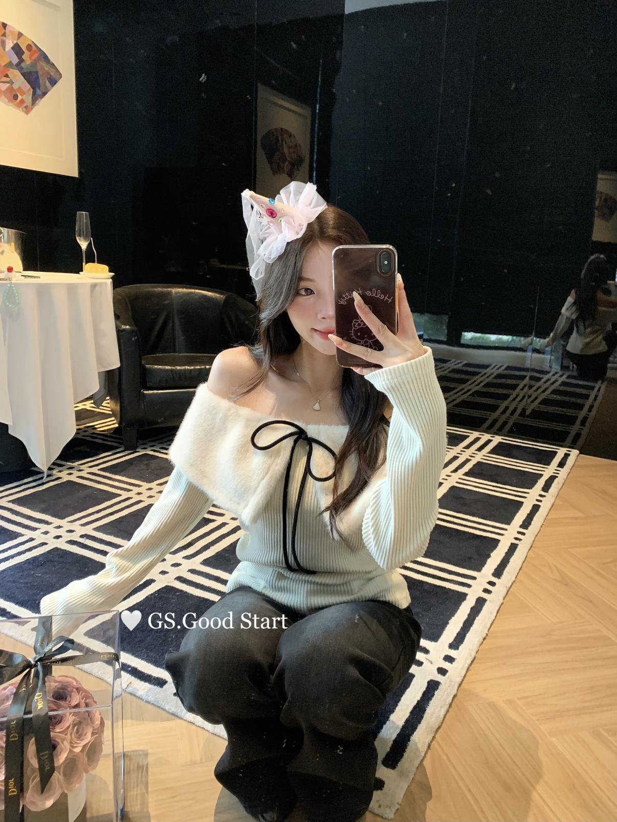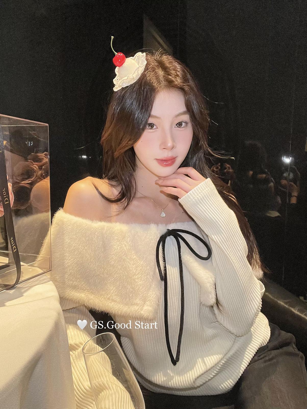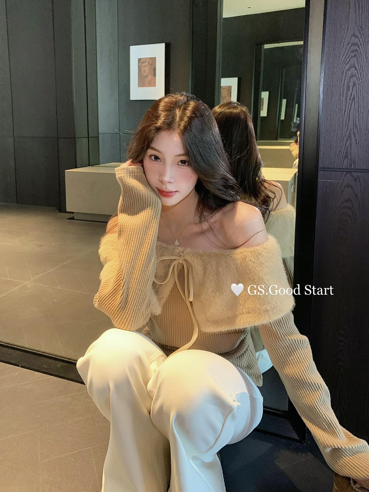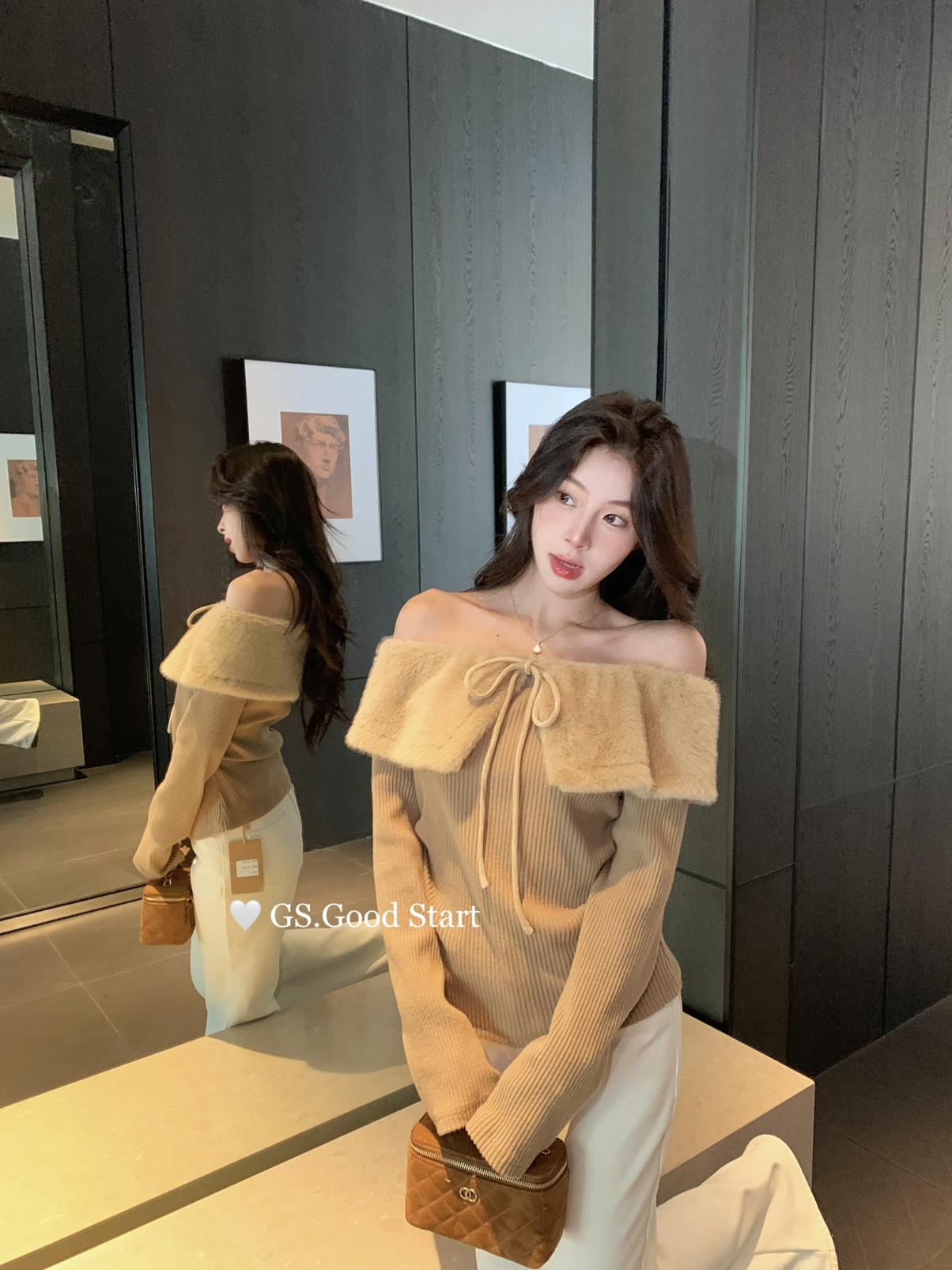 【C8011】按頭安利!香香軟軟嘟*少女感十足~秋冬季純欲氛圍感毛絨一字肩小衫