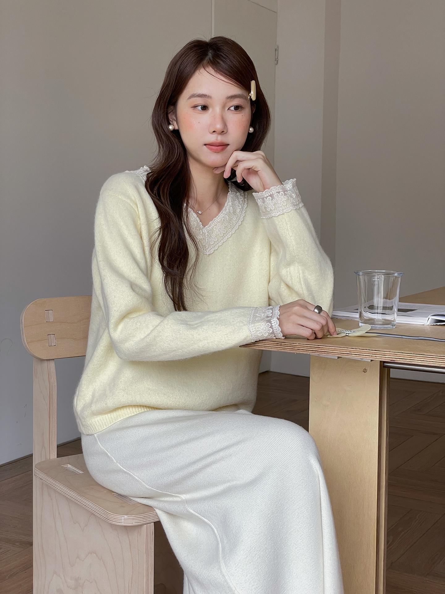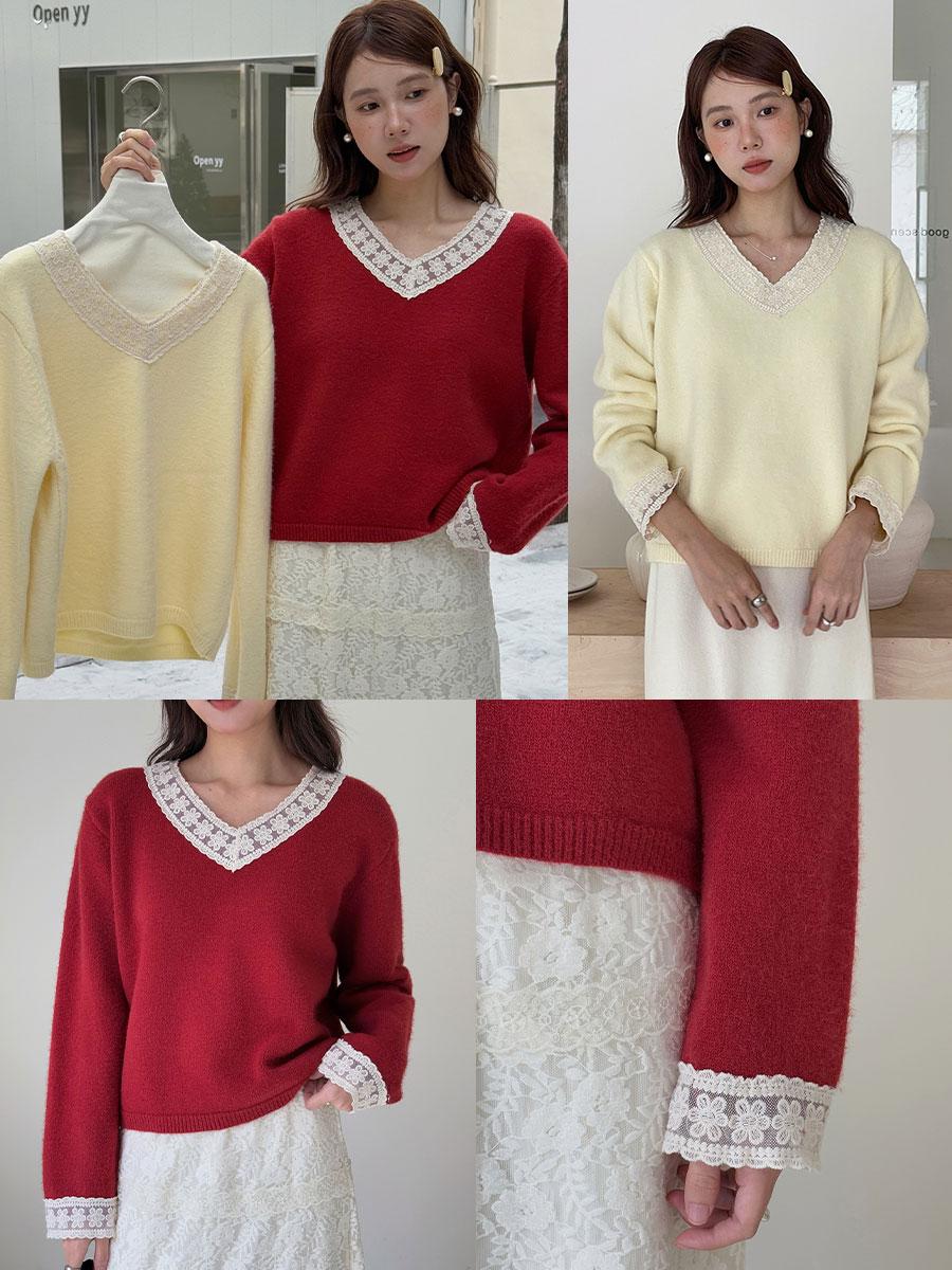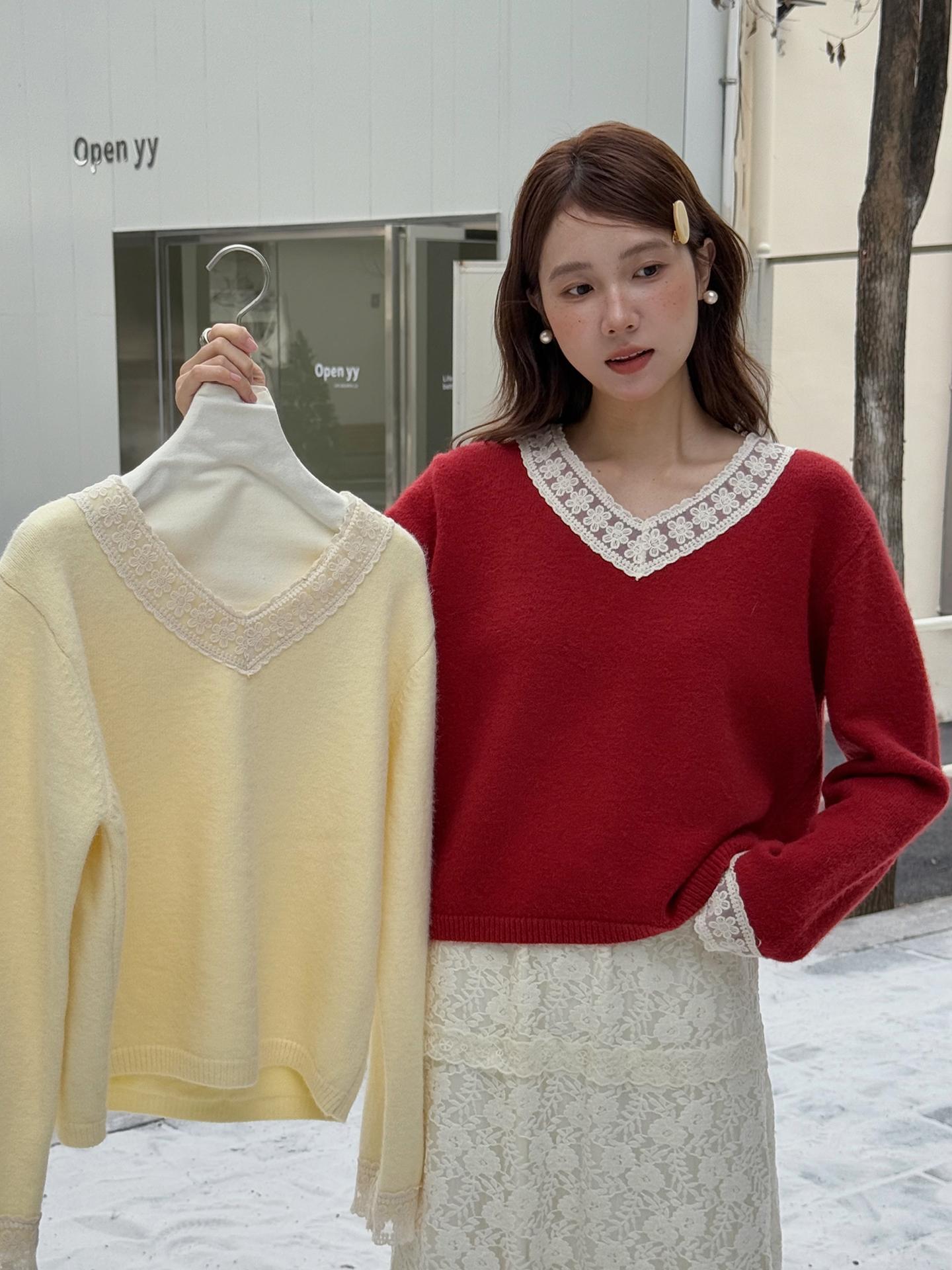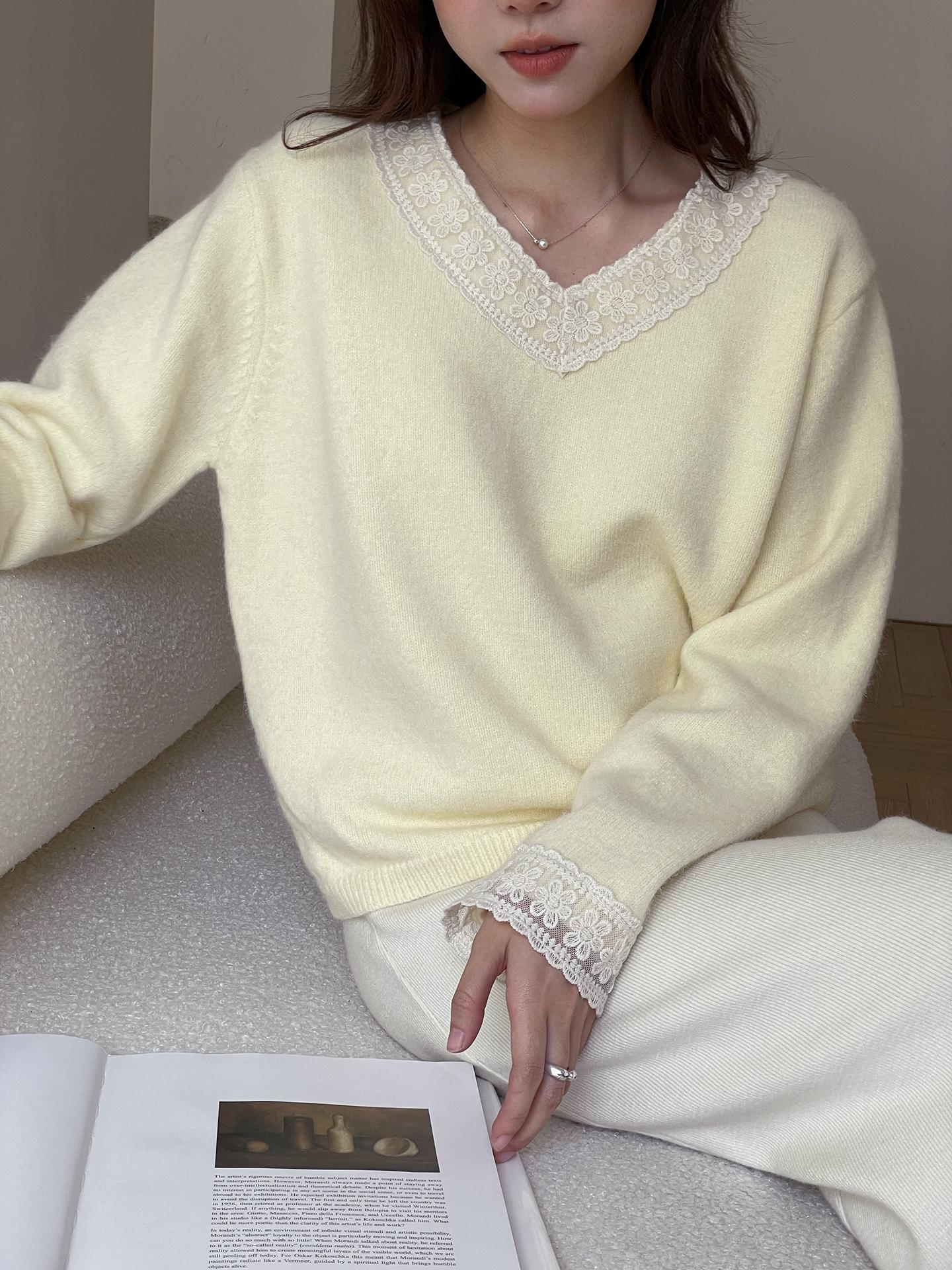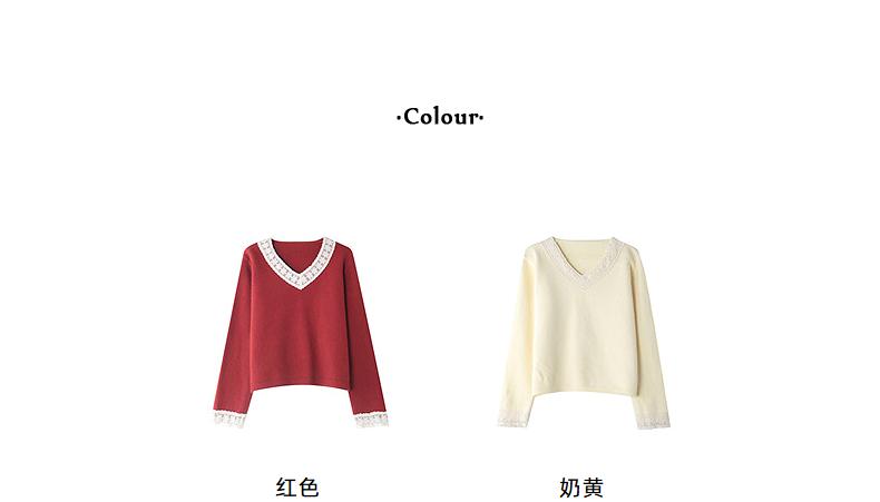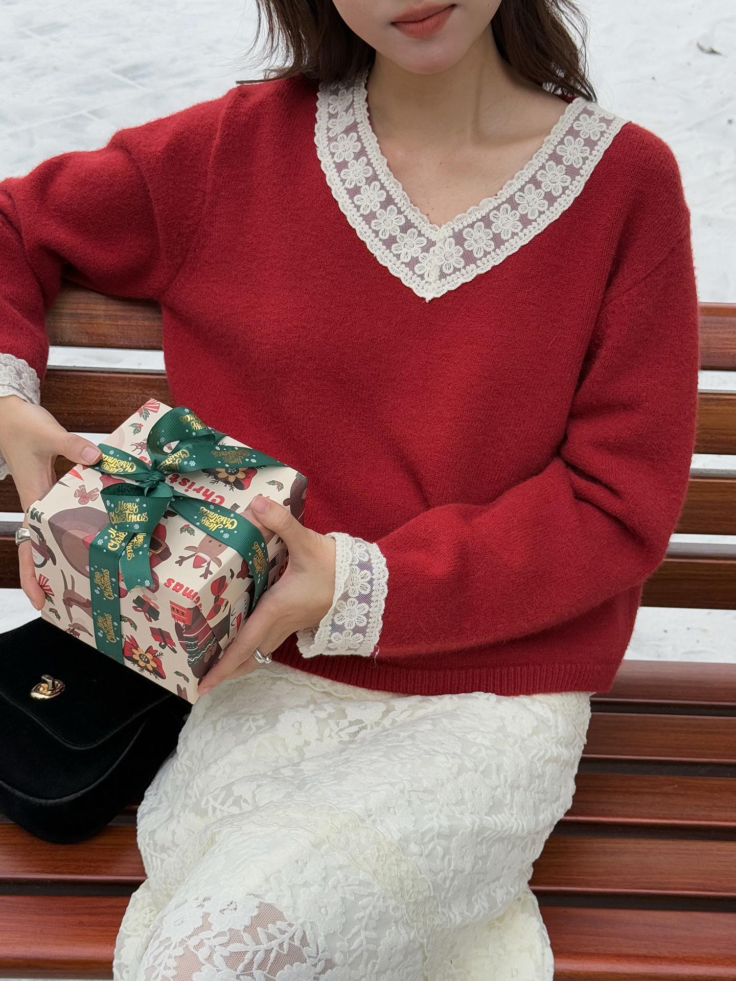 【C7957】冬上新!法式撞色蕾絲拼接V領套頭保暖毛衣