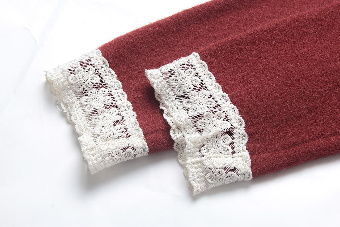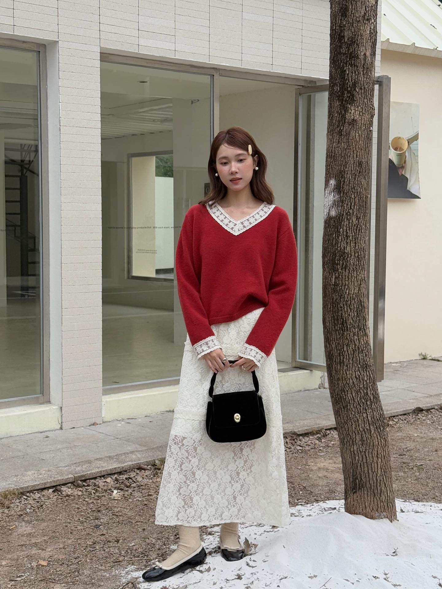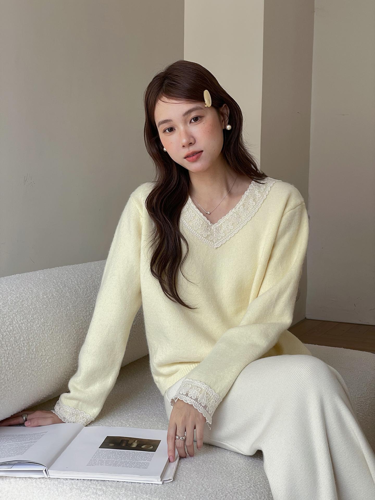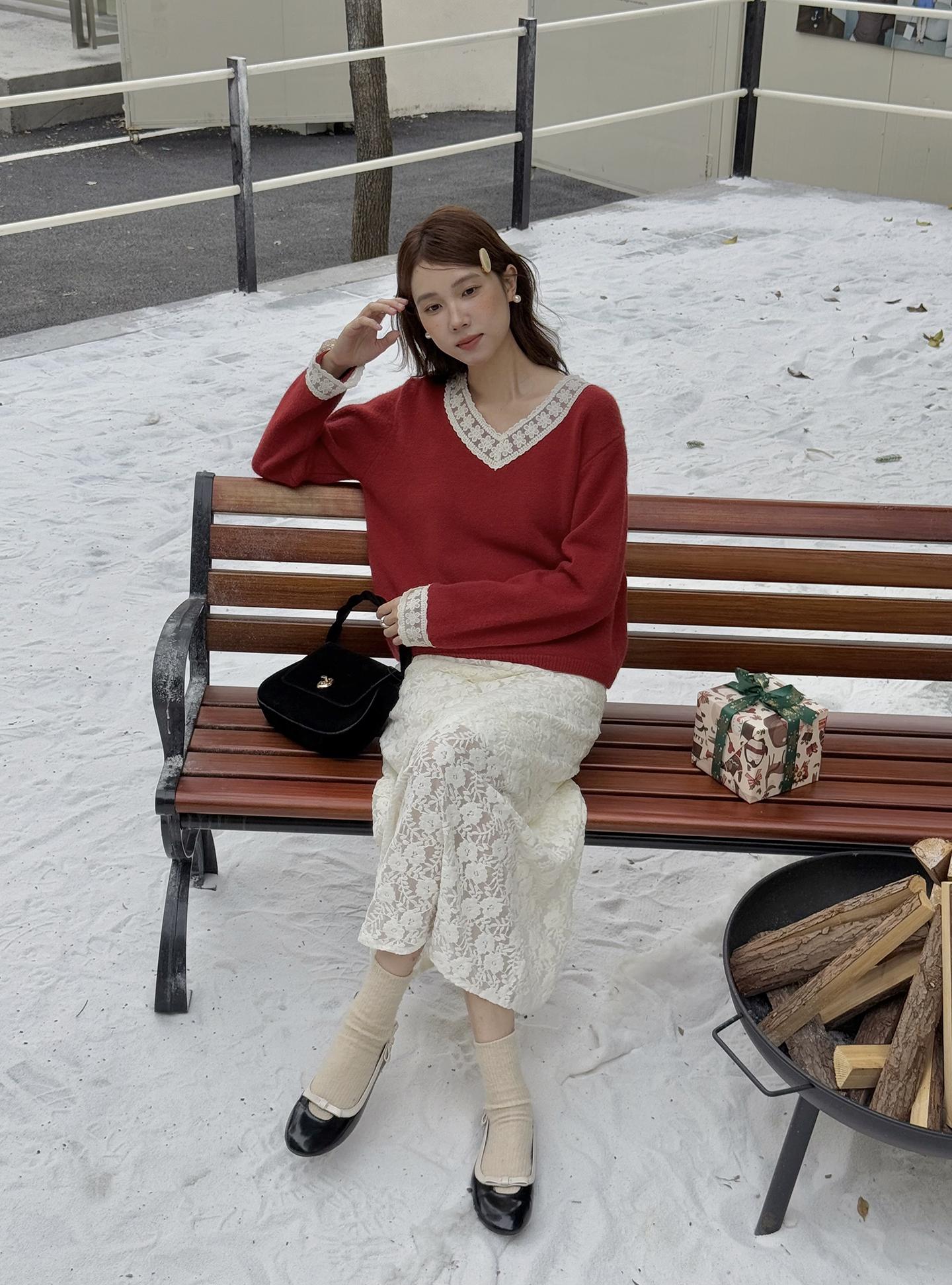 【C7957】冬上新!法式撞色蕾絲拼接V領套頭保暖毛衣