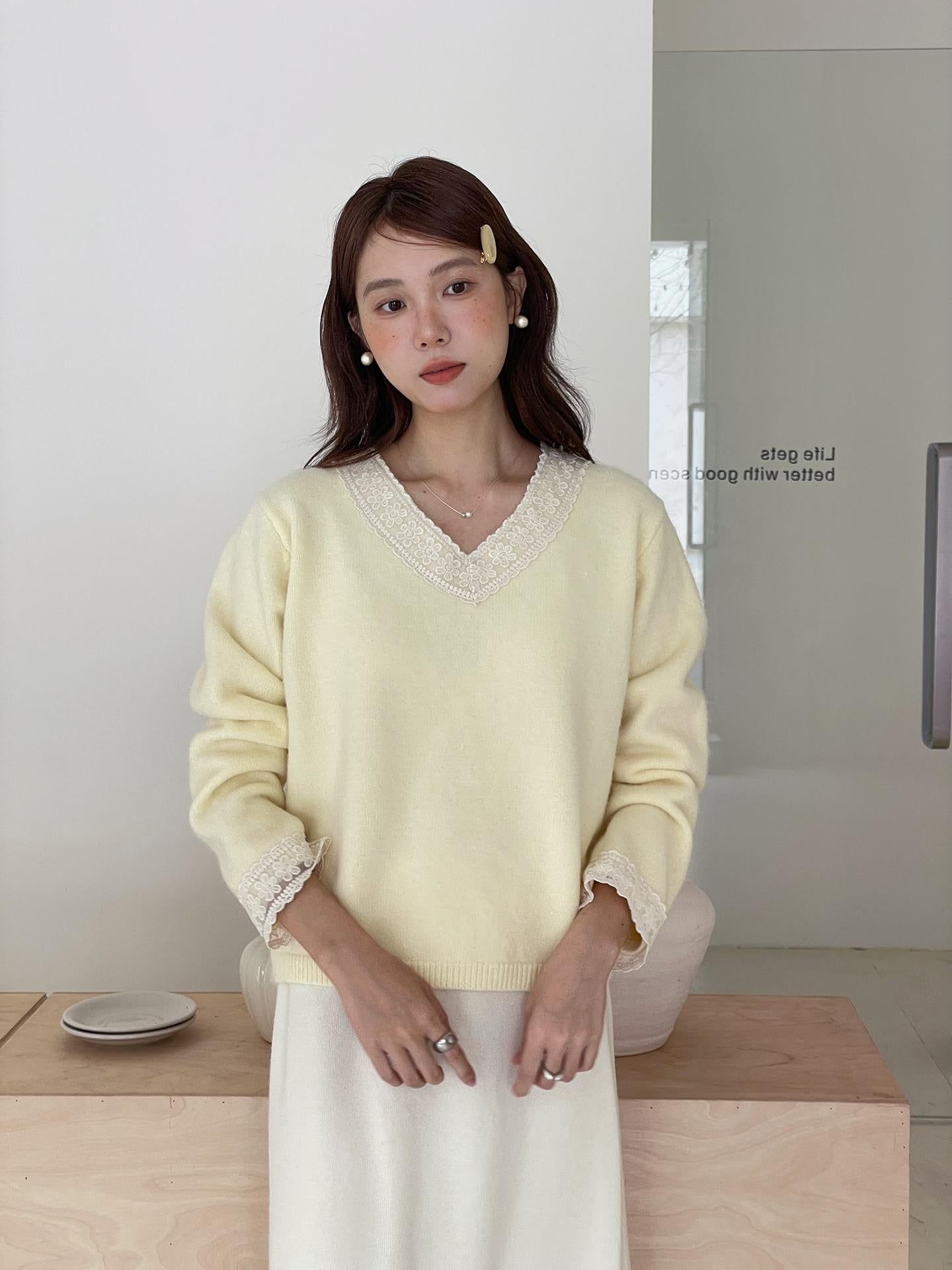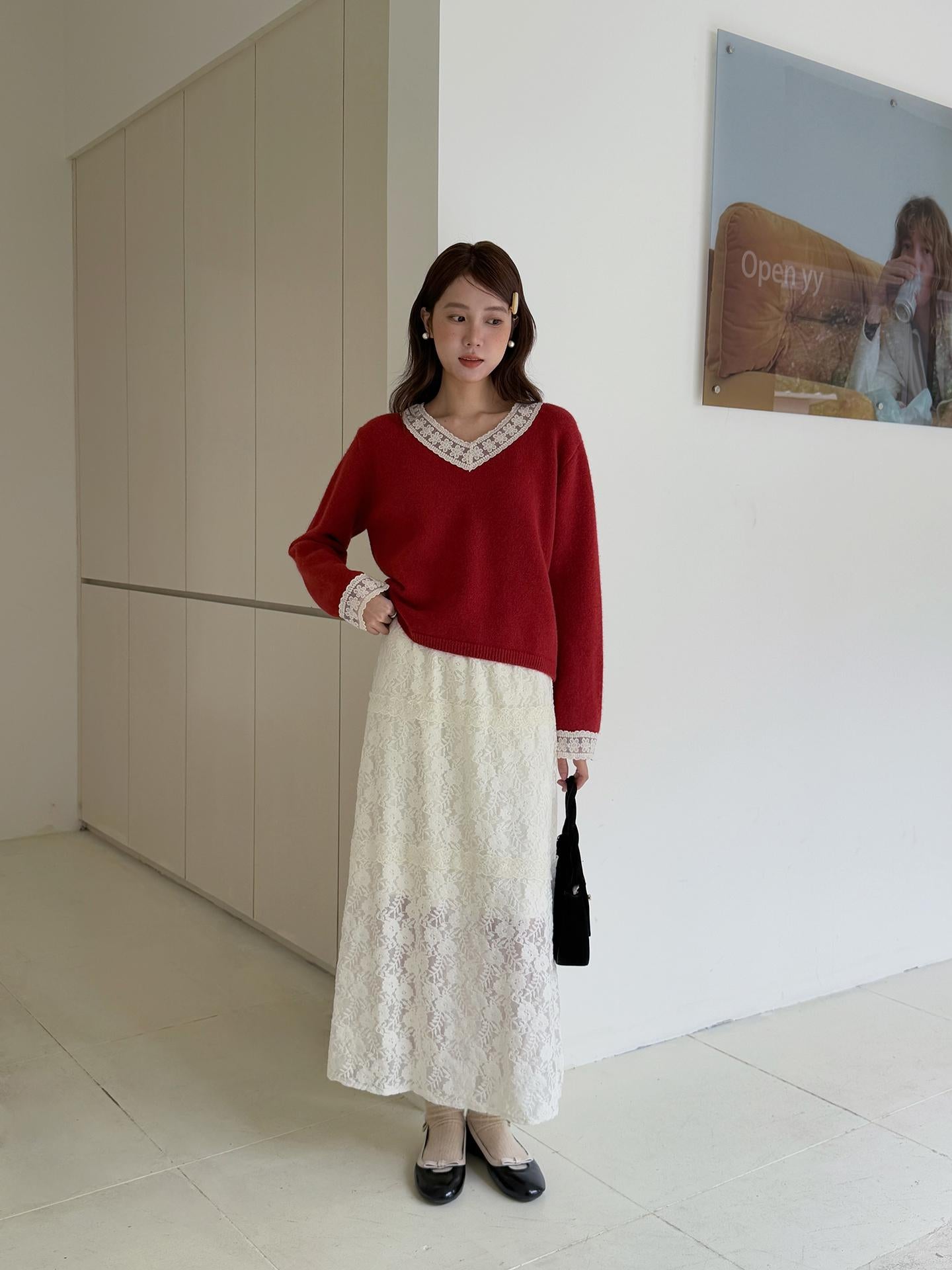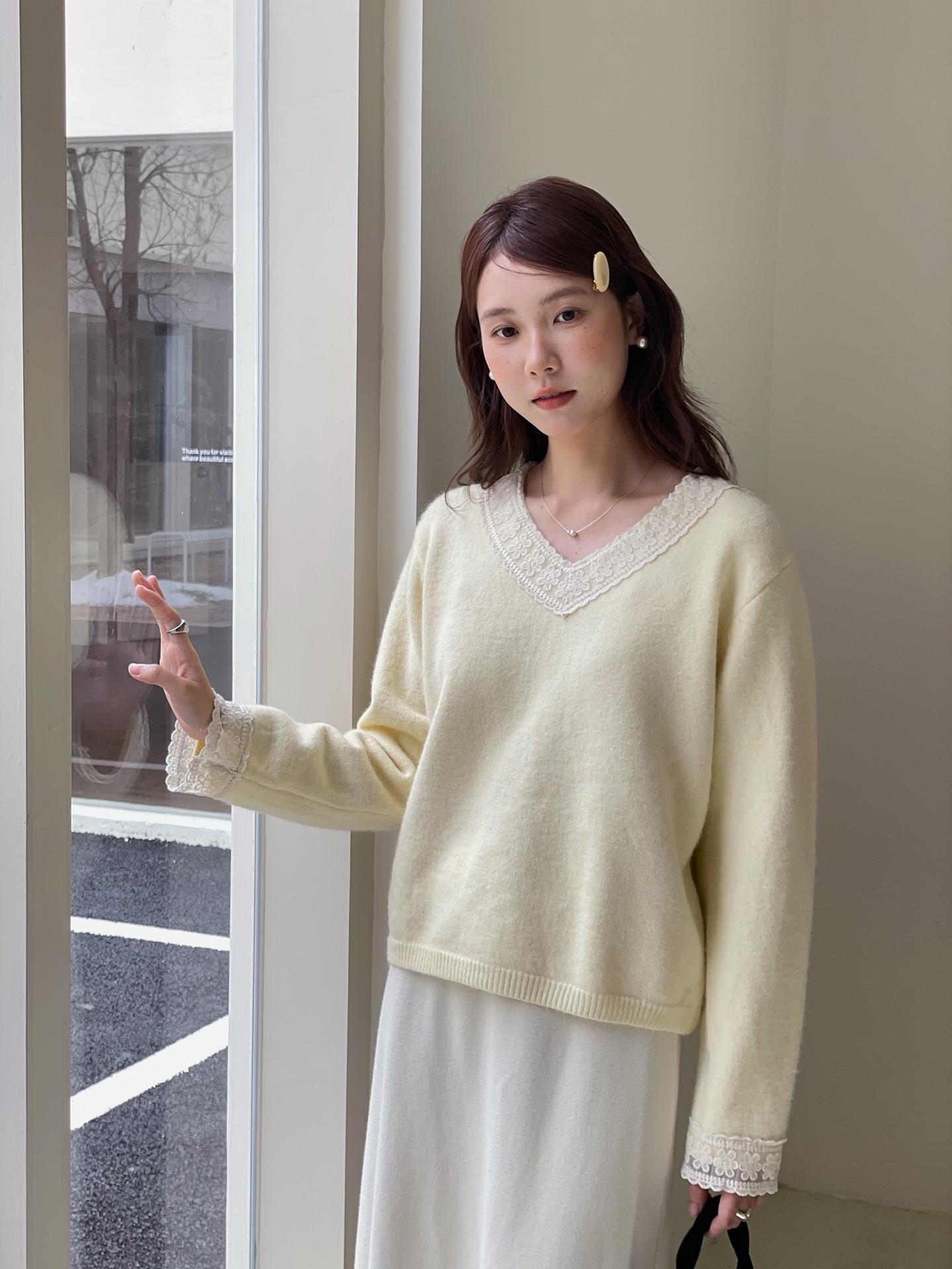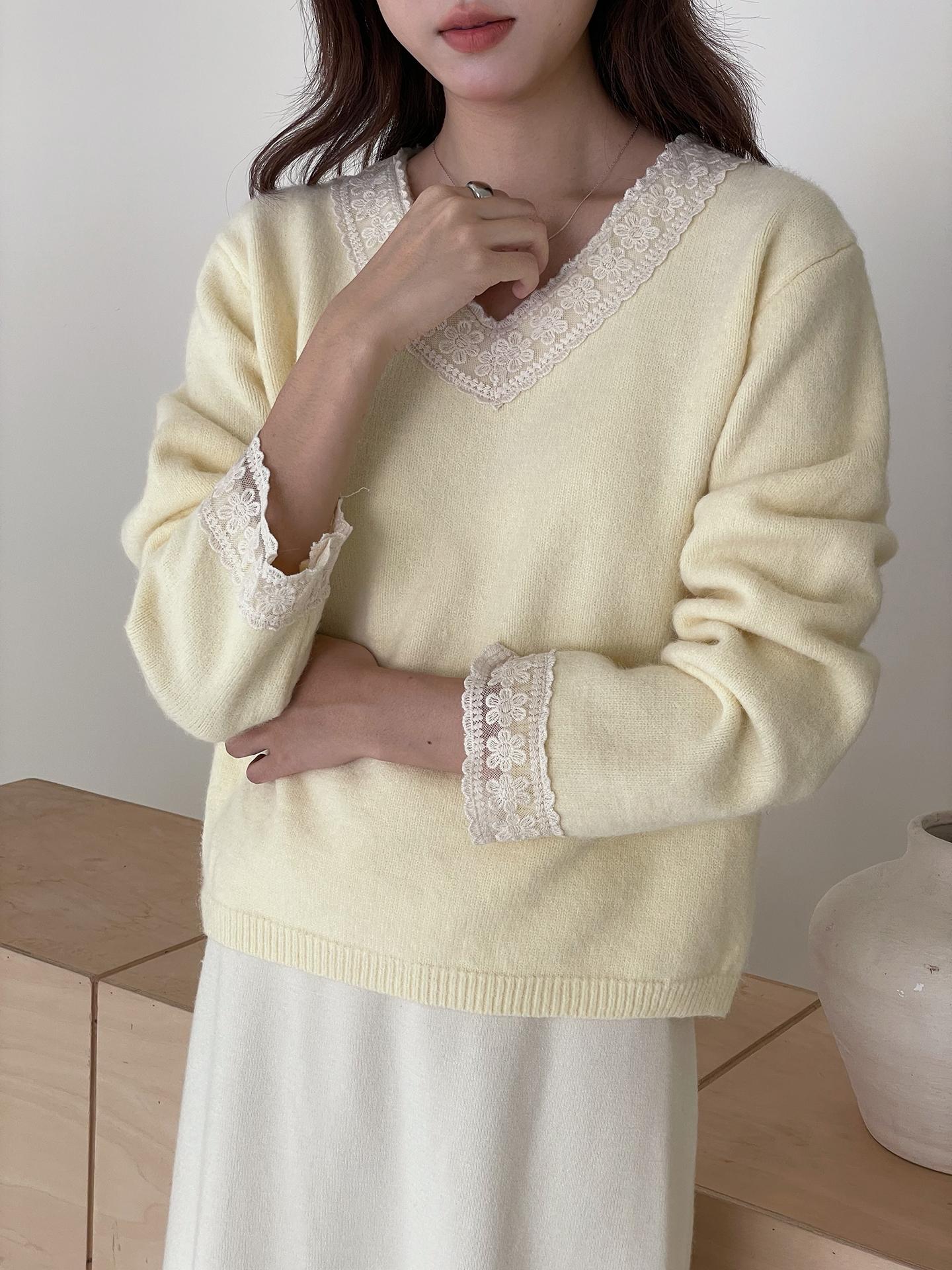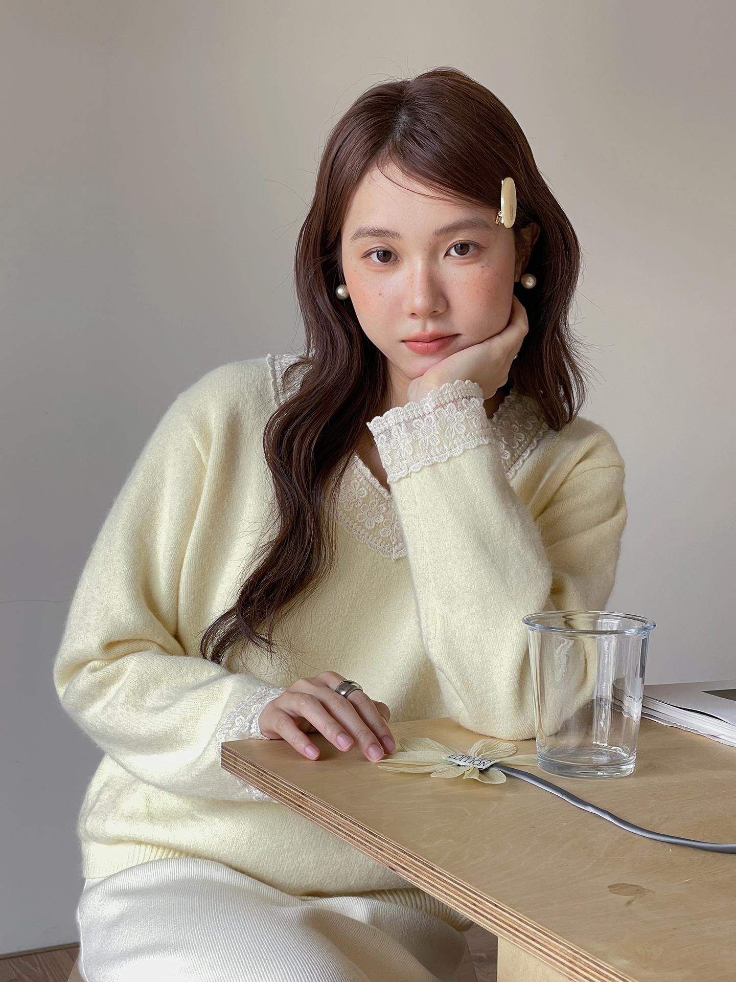 【C7957】冬上新!法式撞色蕾絲拼接V領套頭保暖毛衣