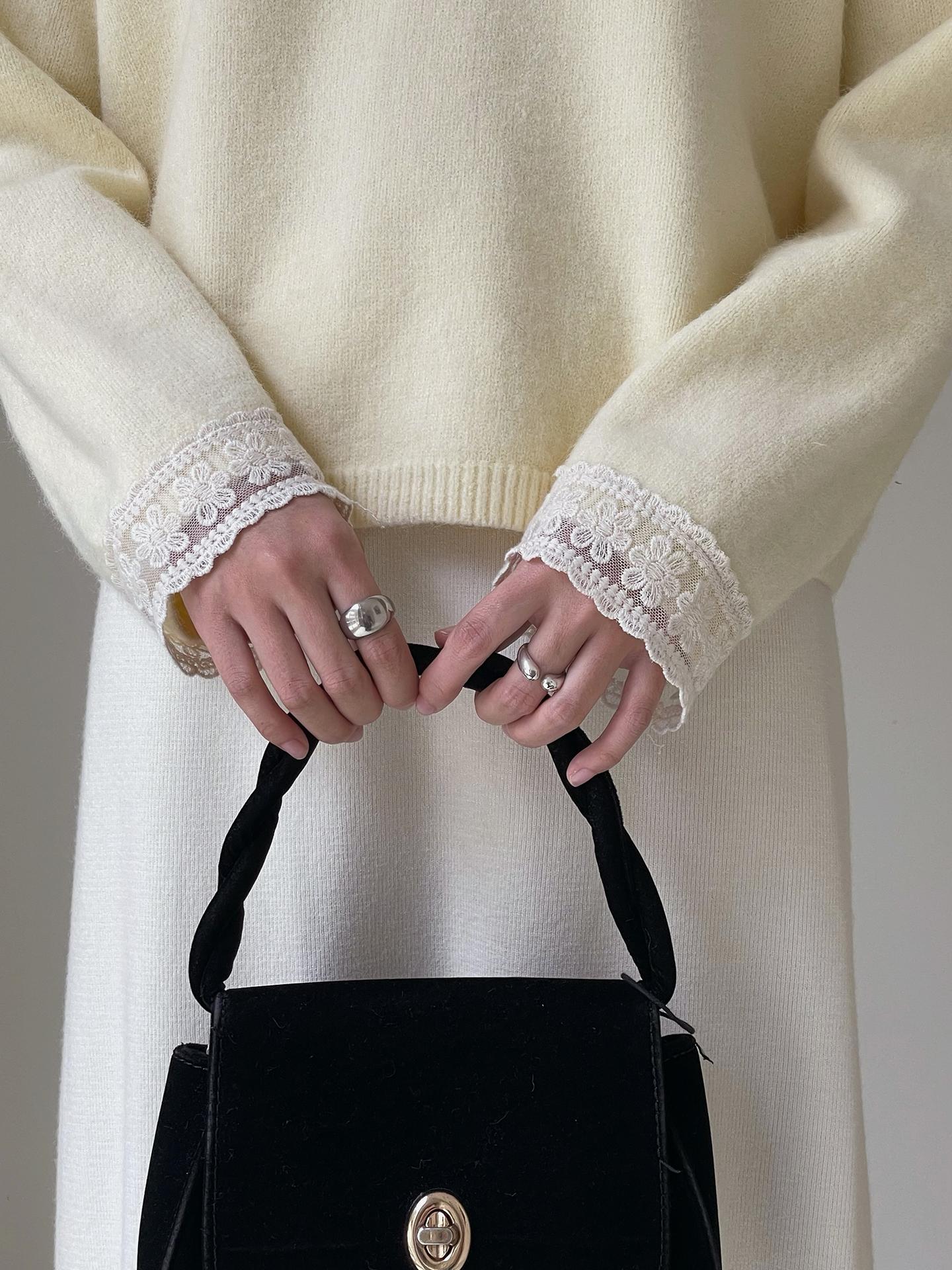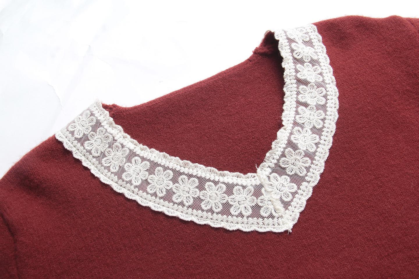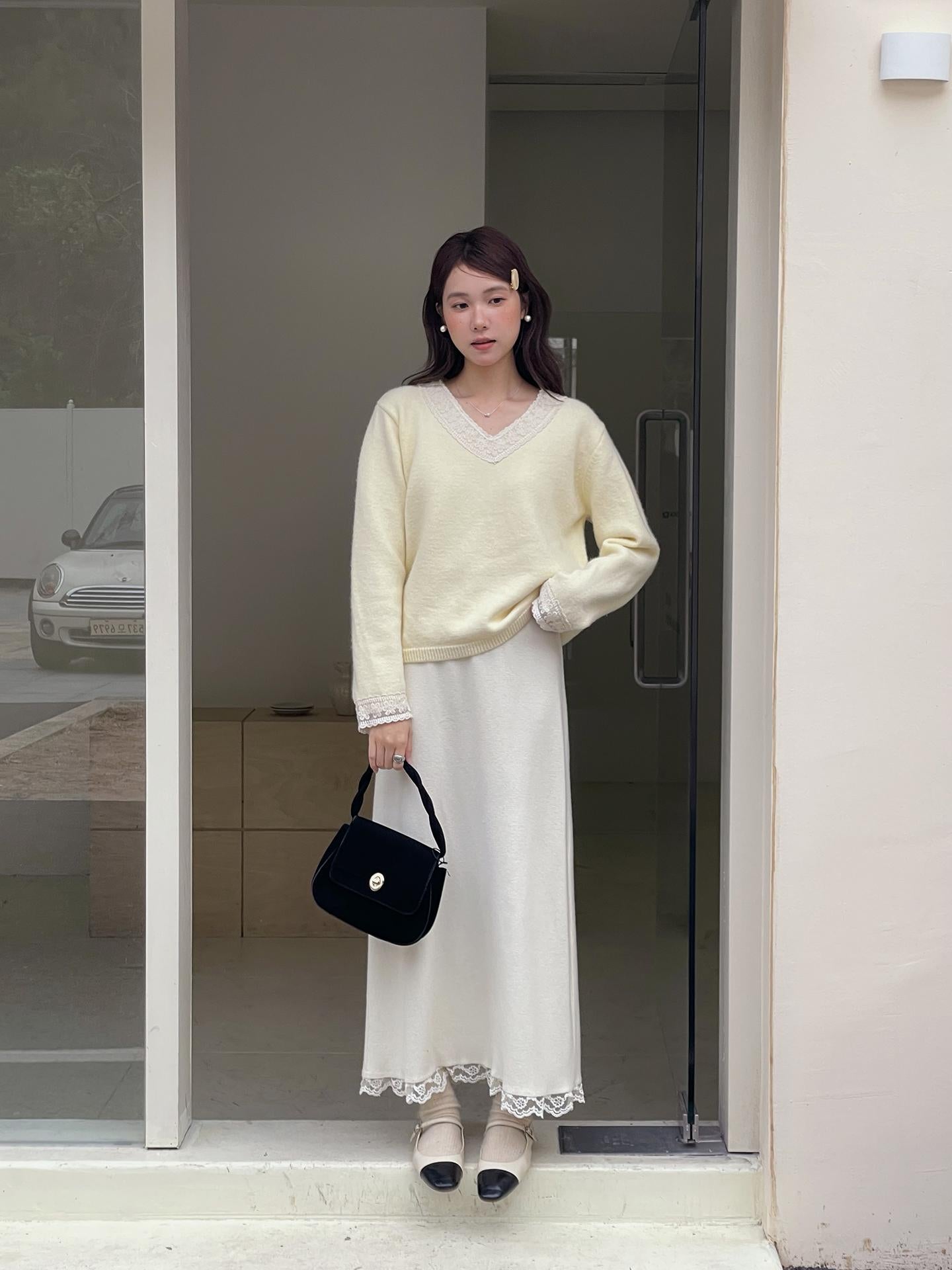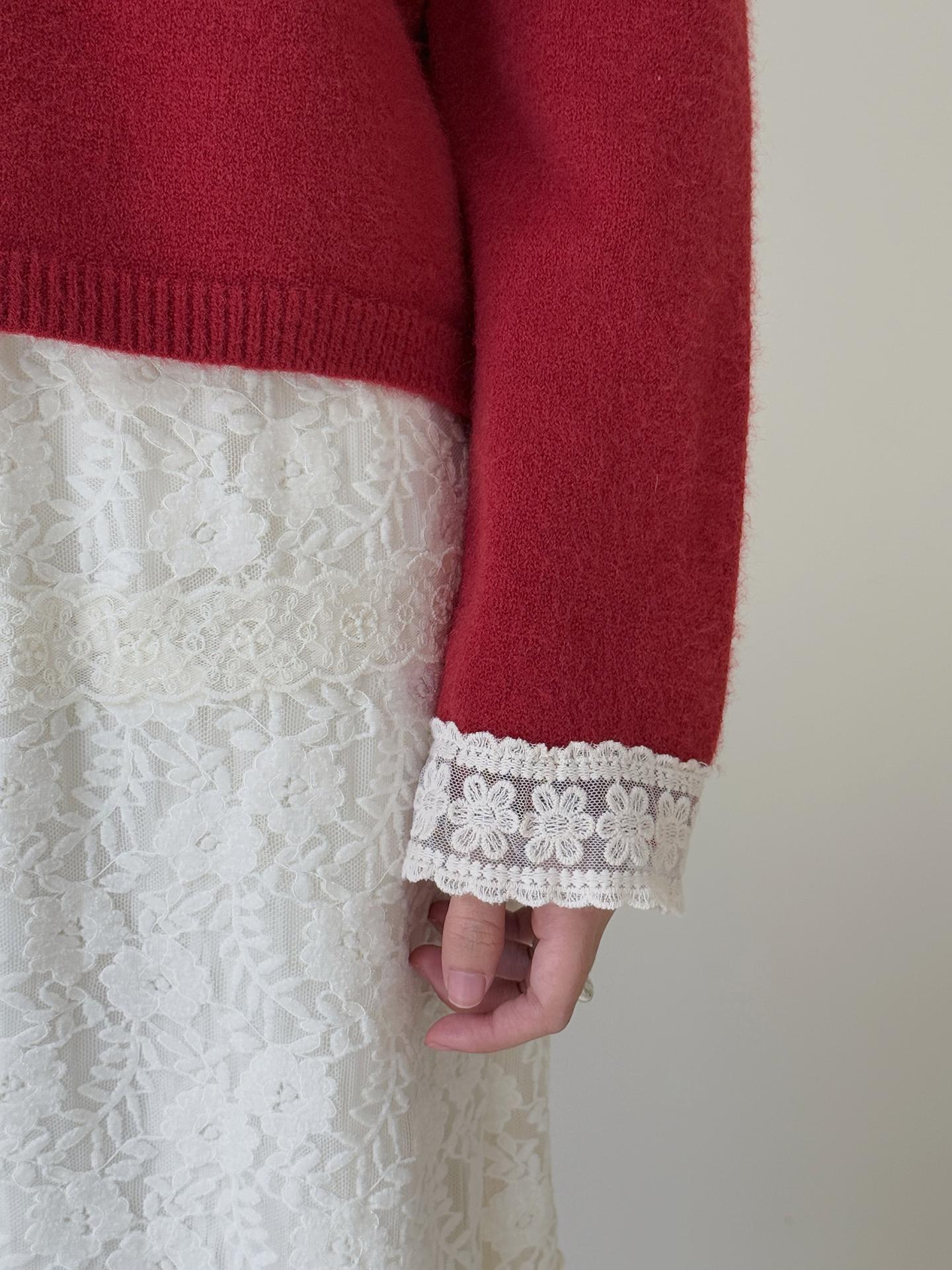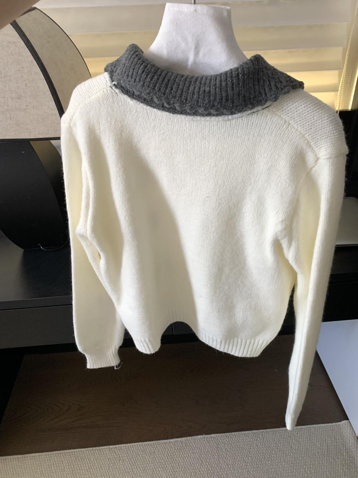 【C7957】冬上新!法式撞色蕾絲拼接V領套頭保暖毛衣