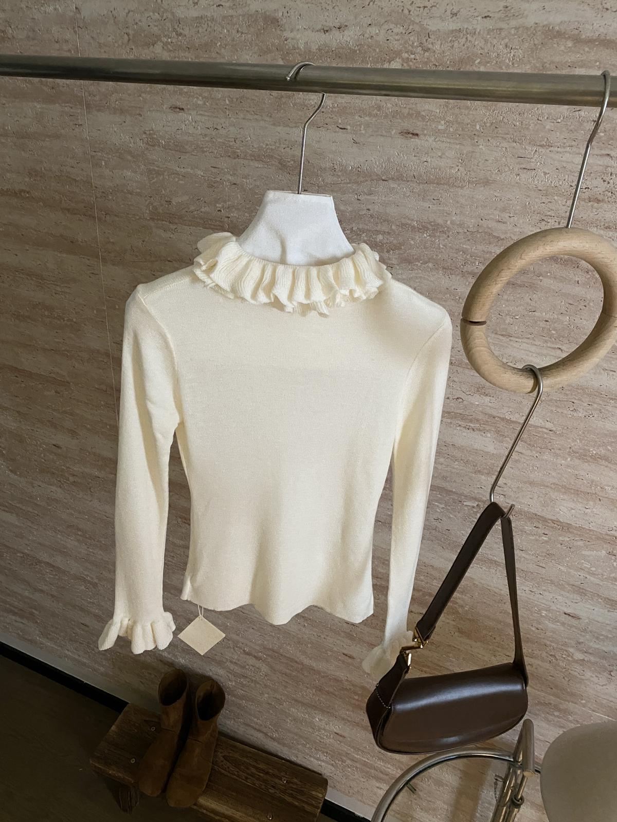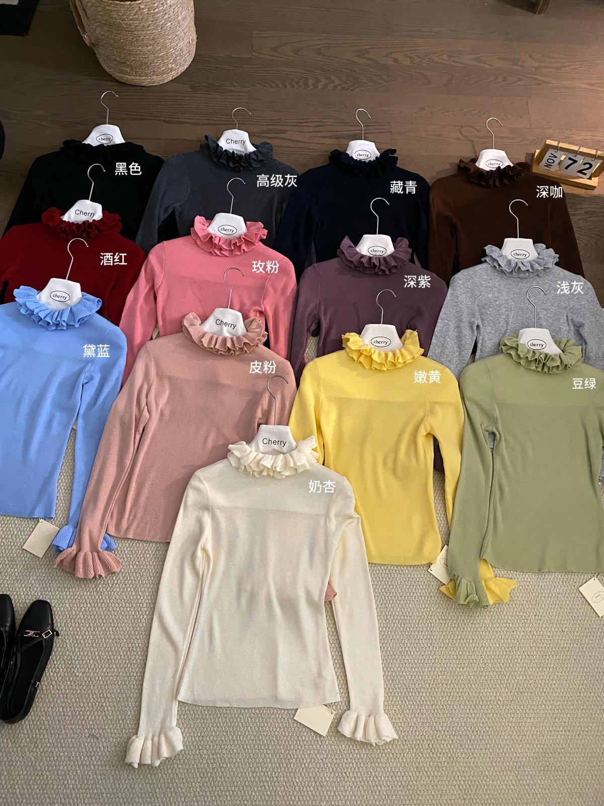 【C7964】韓系甜美翻領花邊純色修身打底衫