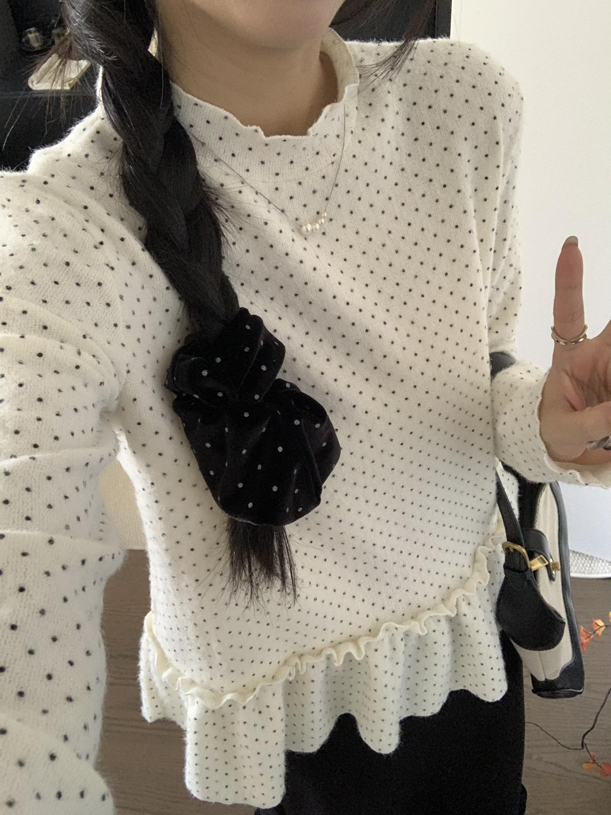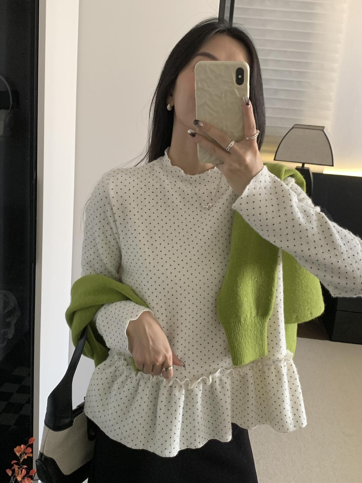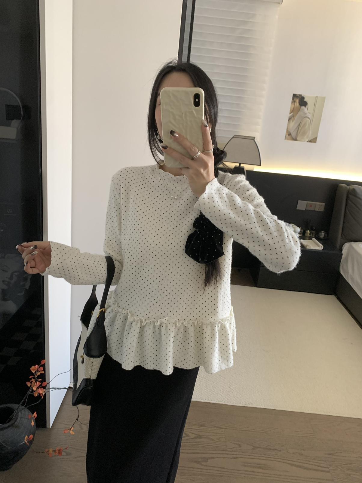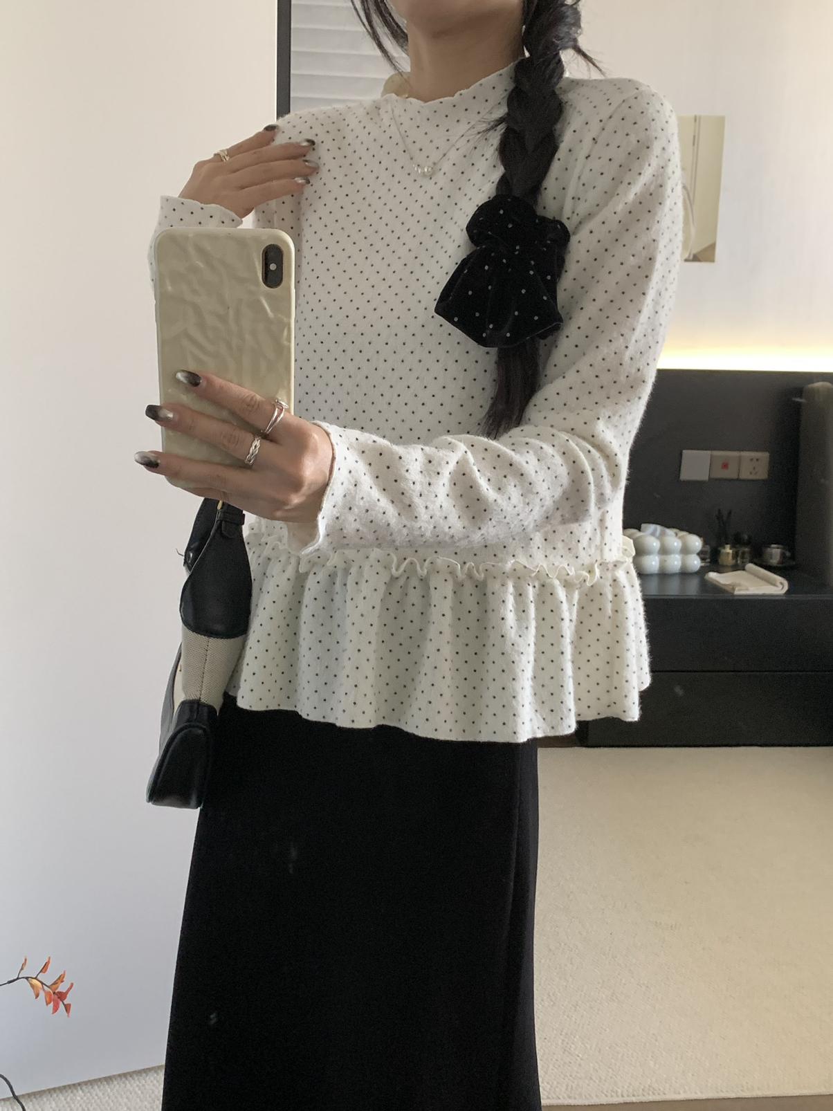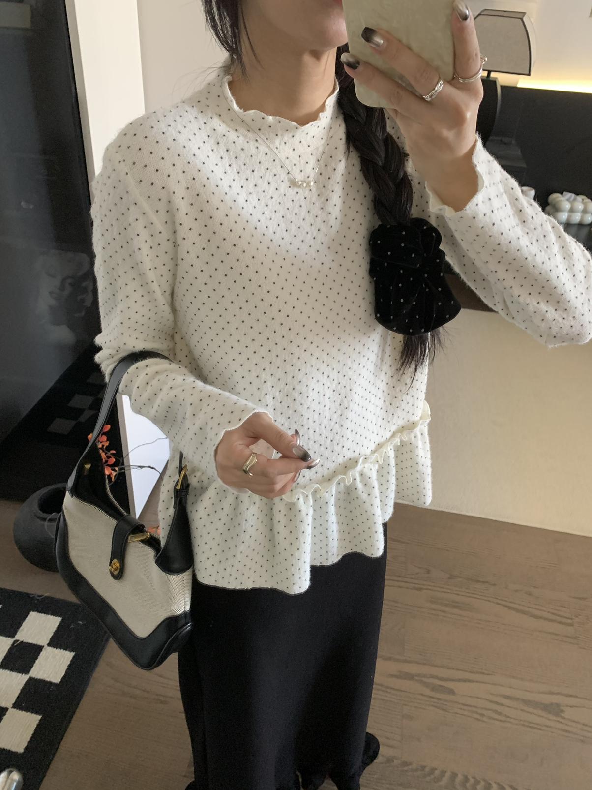 【C7966】韓系波點中領木耳邊寬鬆上衣打底衫