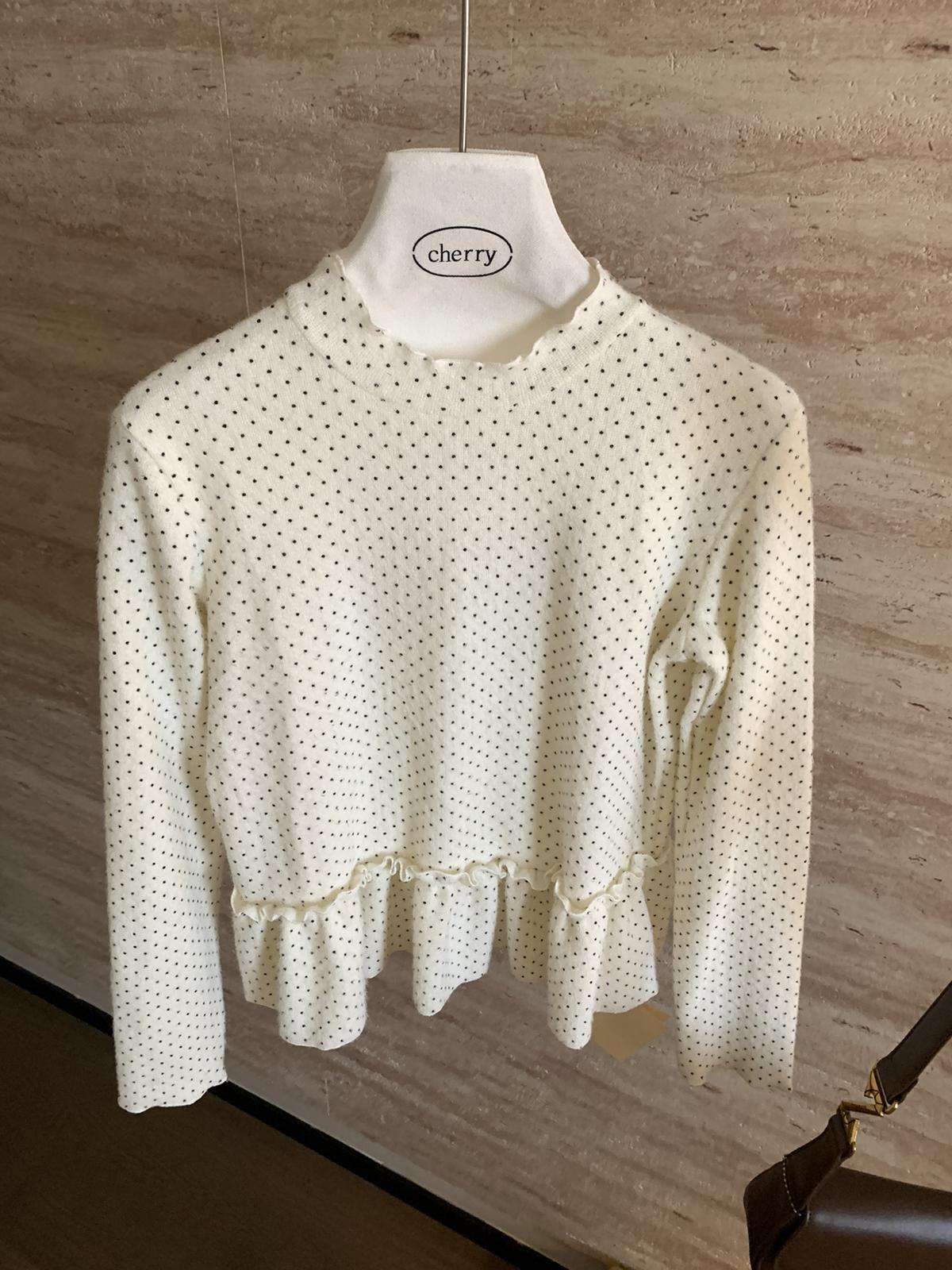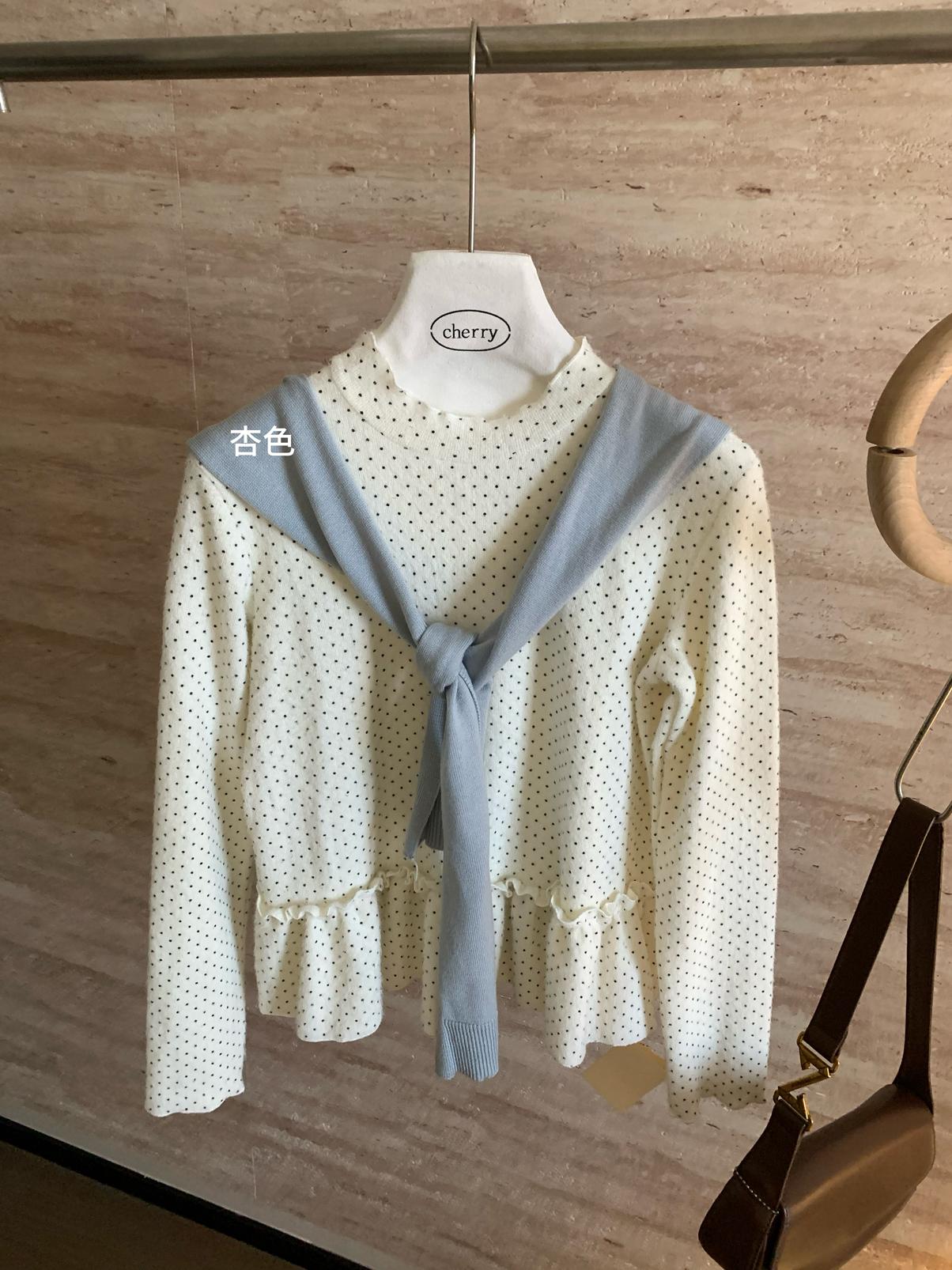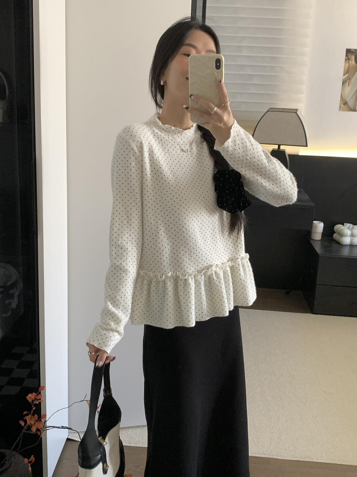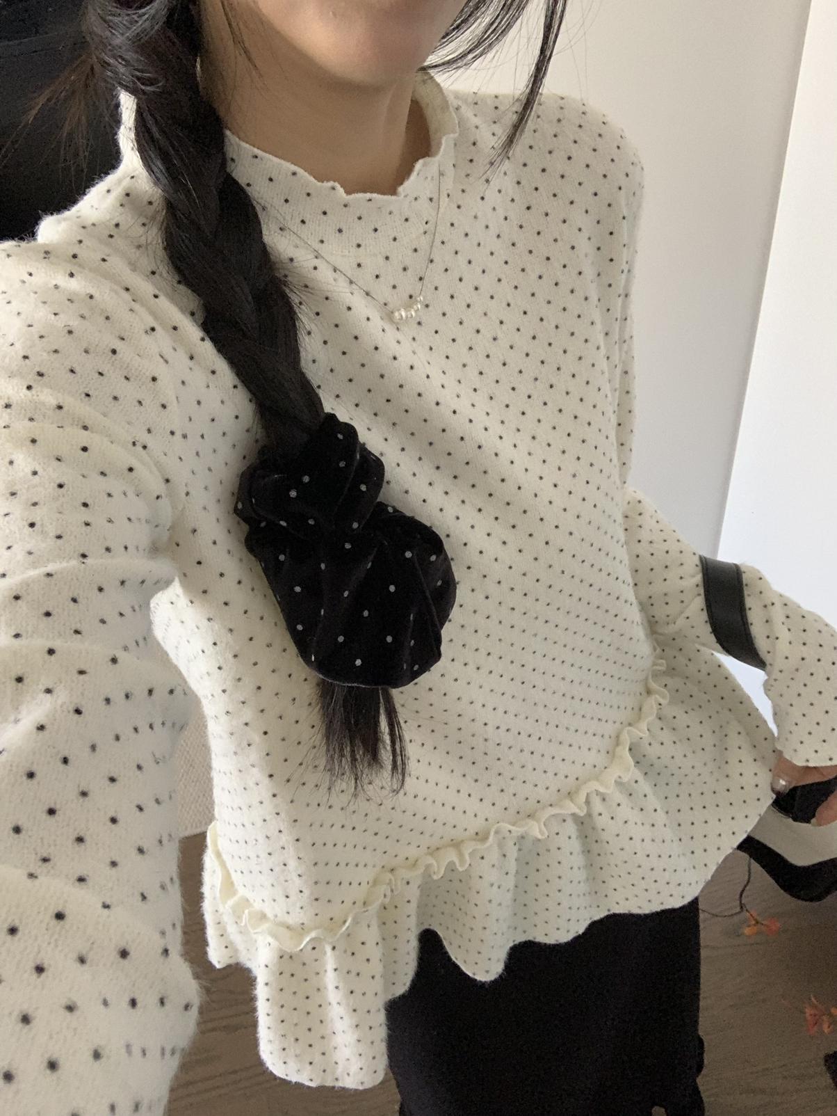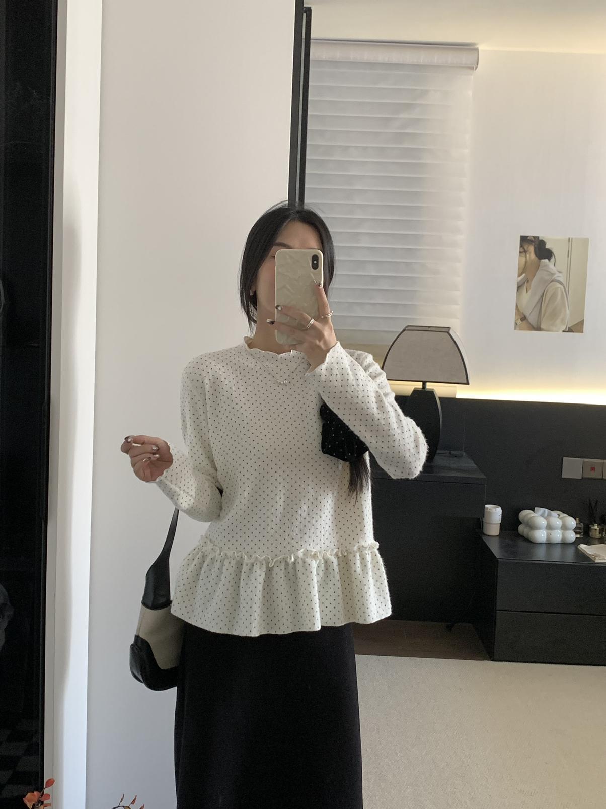 【C7966】韓系波點中領木耳邊寬鬆上衣打底衫