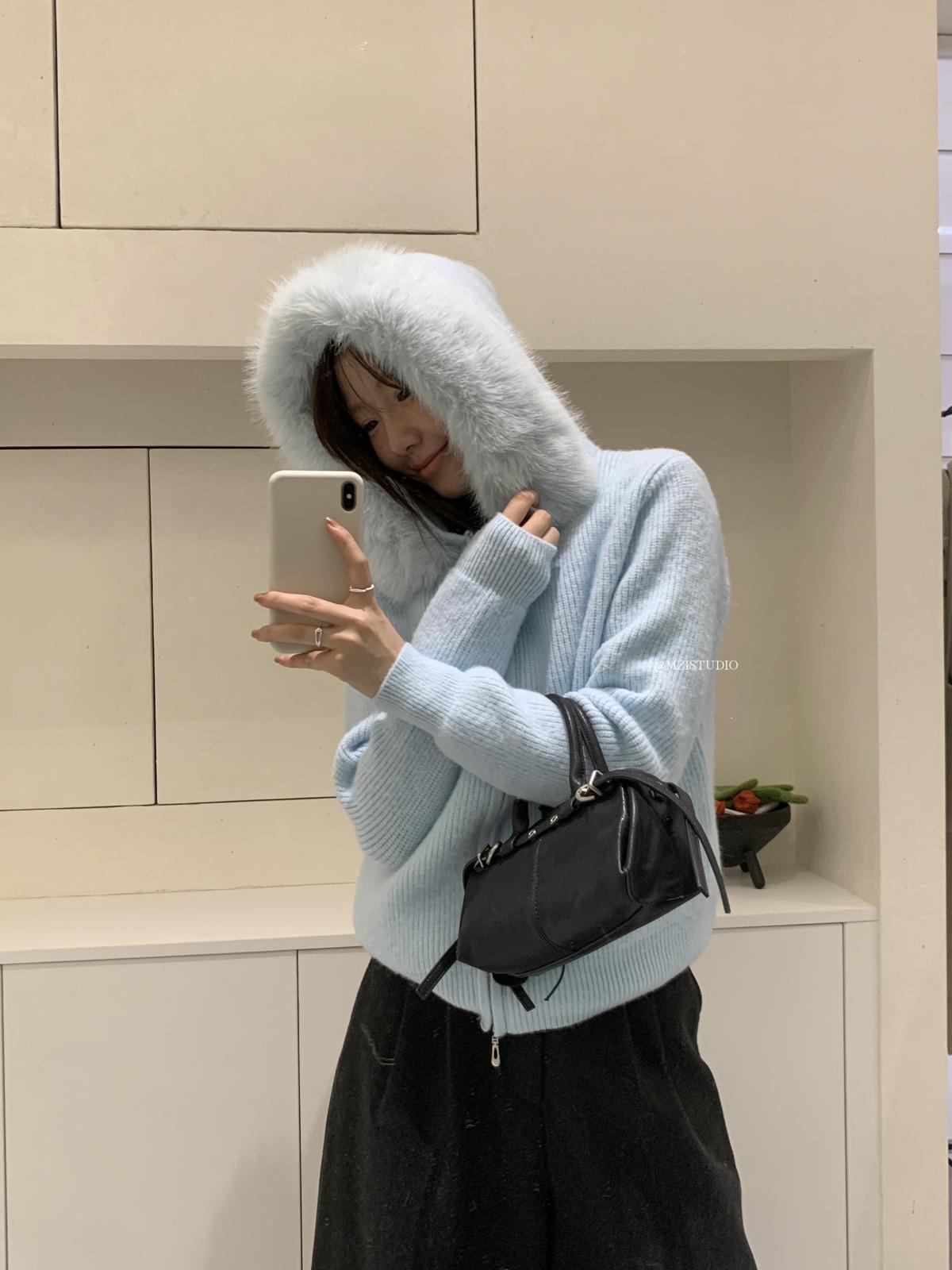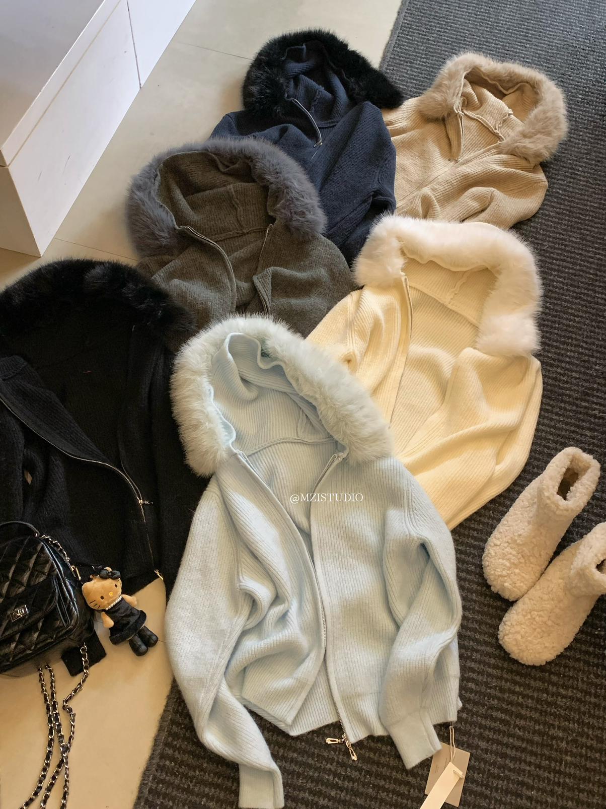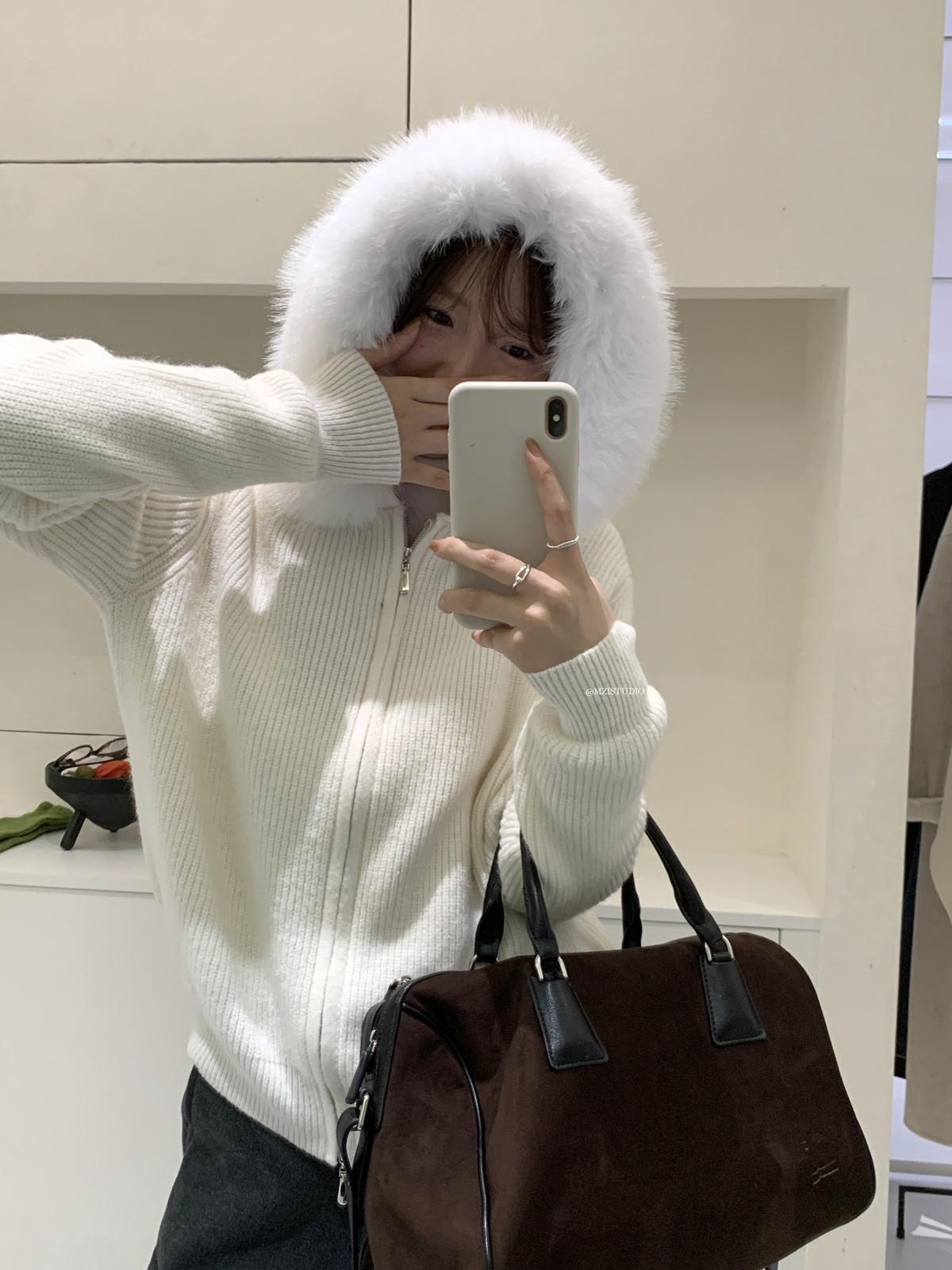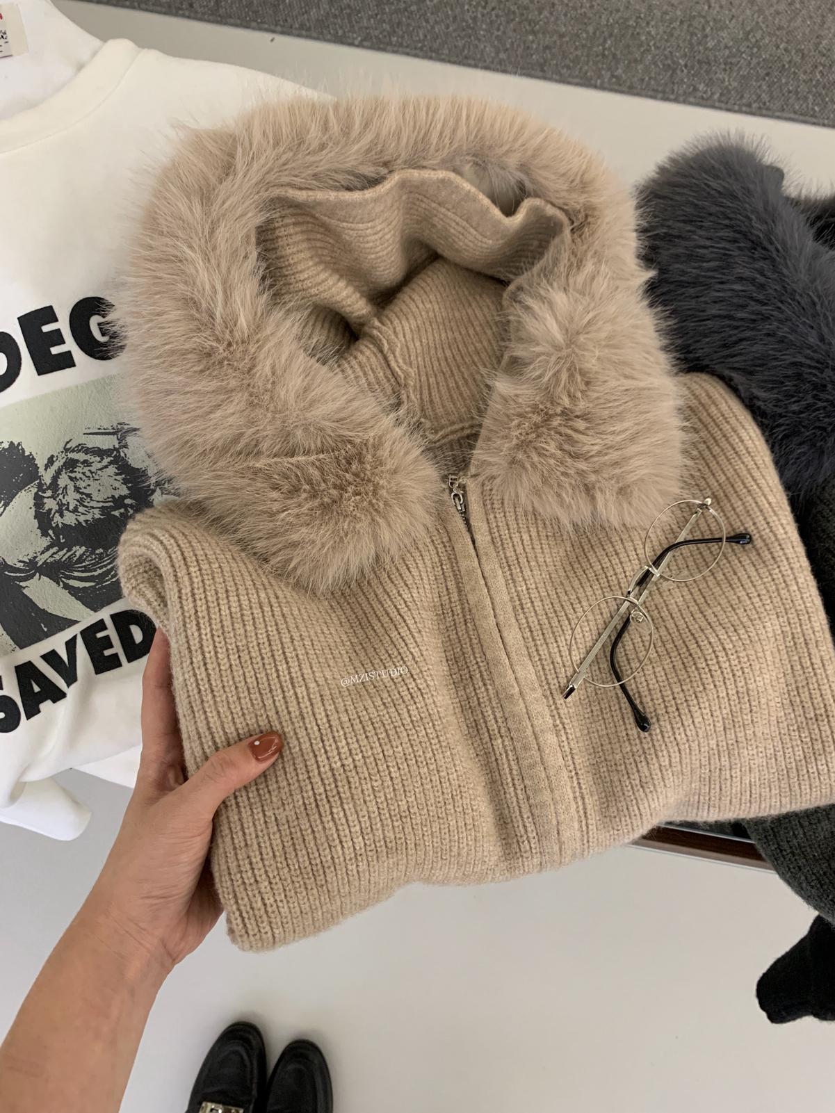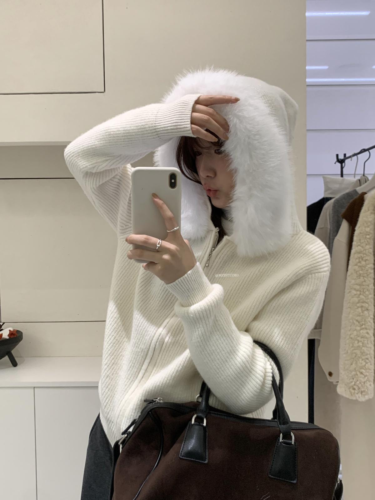 【C7970】冬日糯米糰子韓標可拆卸毛毛連帽拉鍊軟糯親膚簡約針織開衫