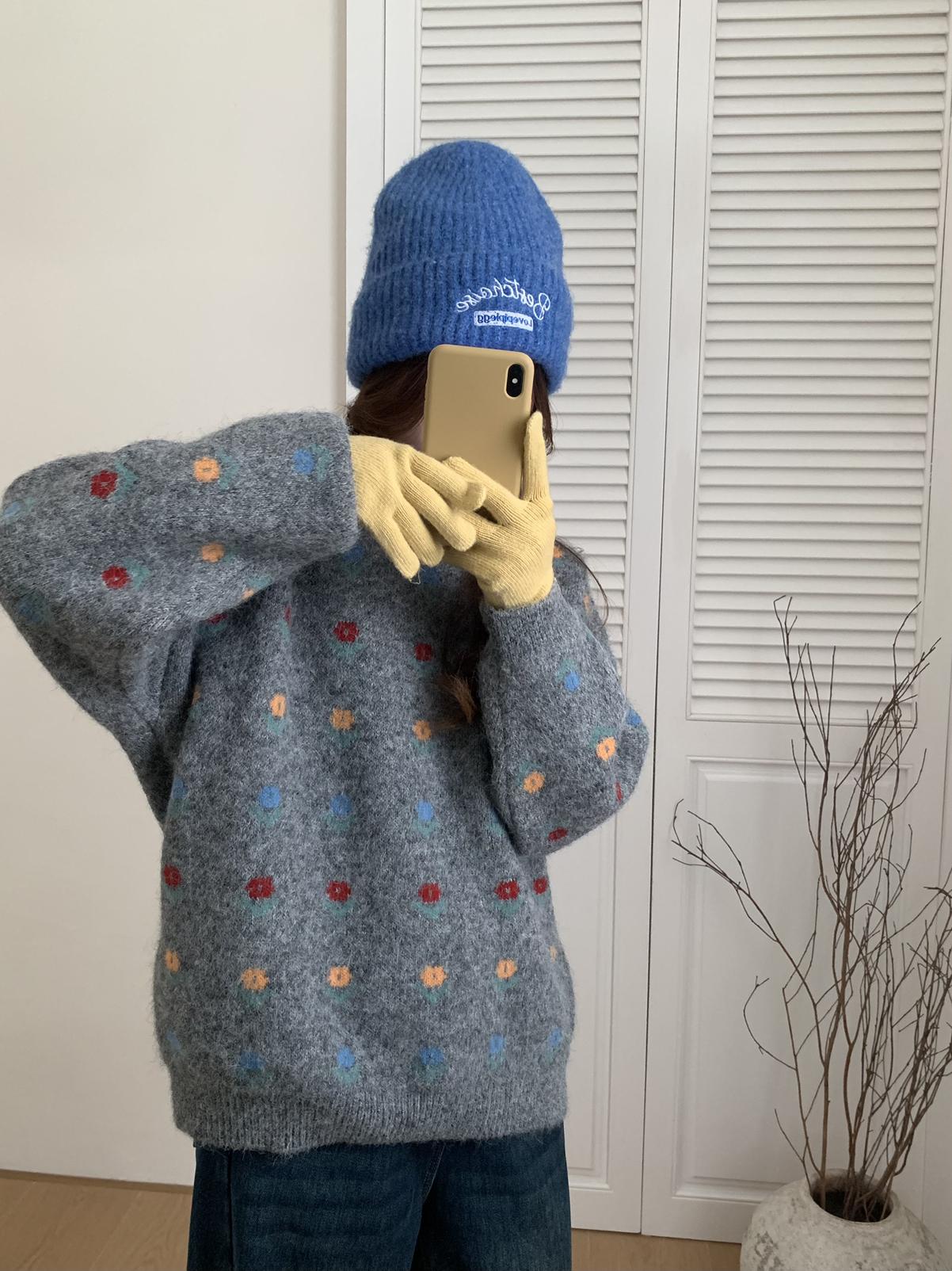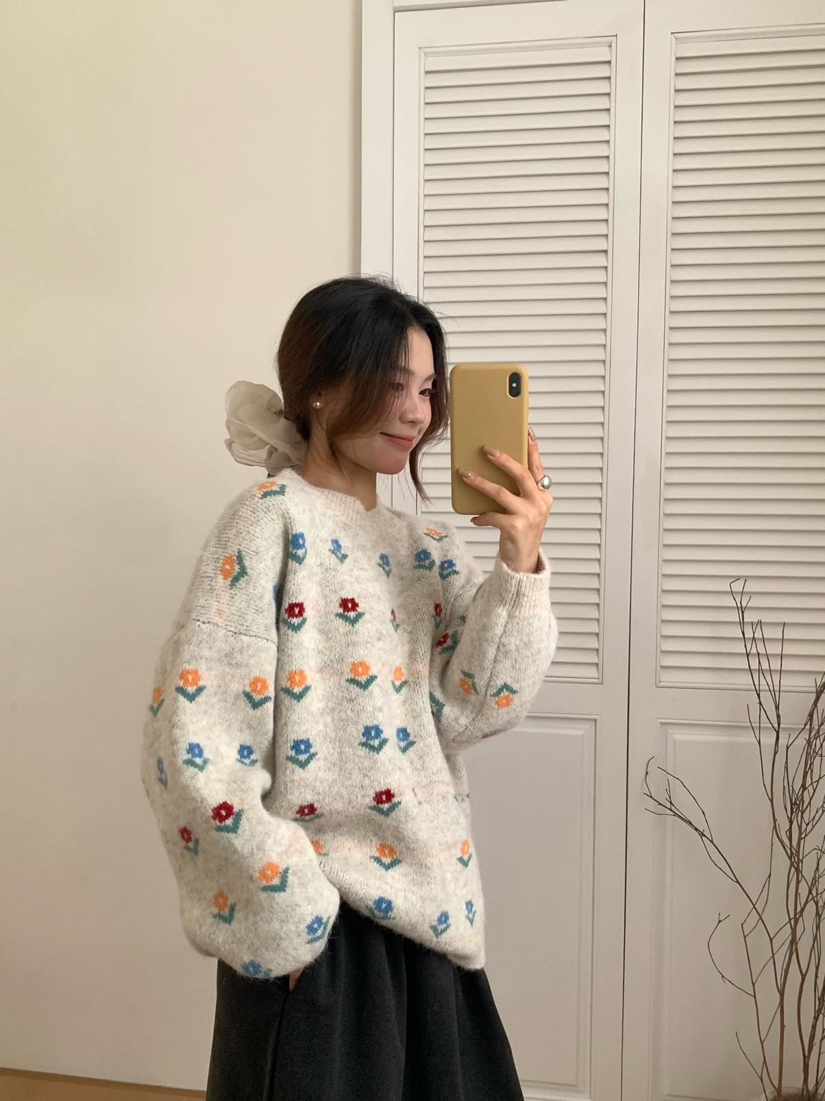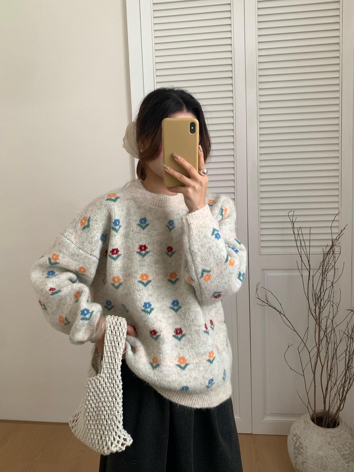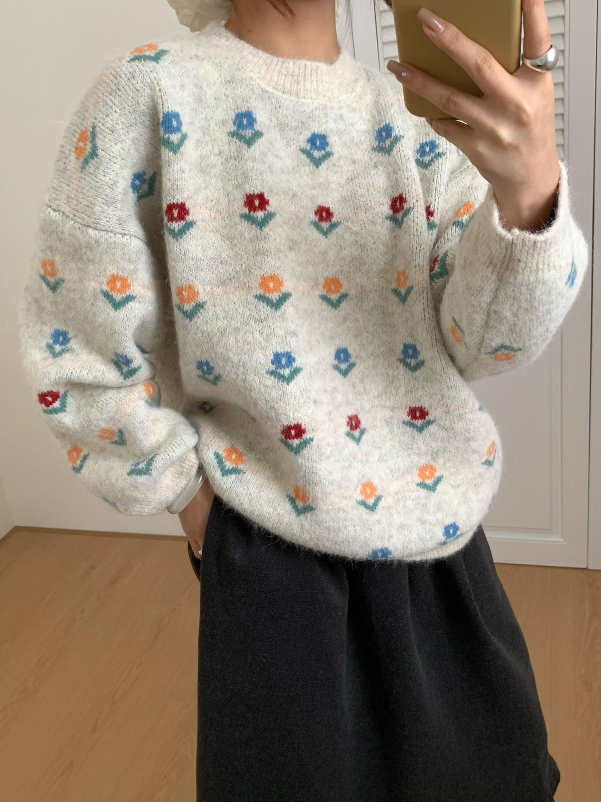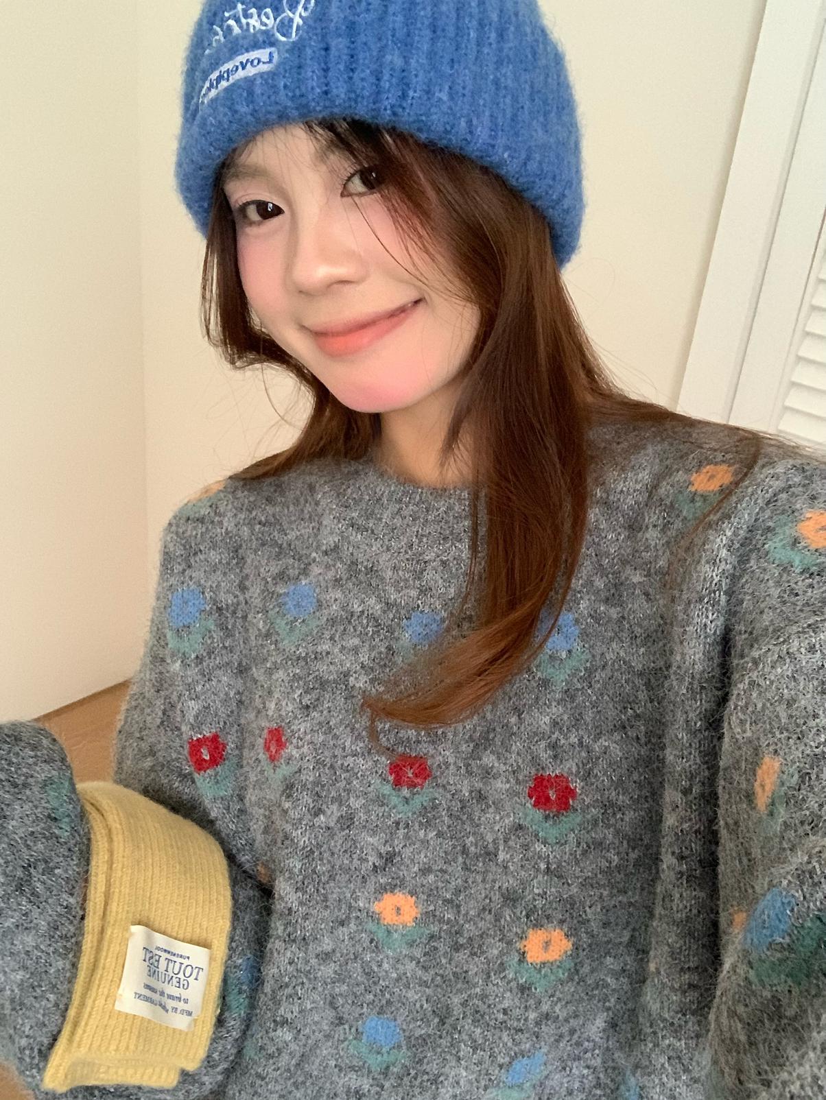 【C7990】小清新撞色花朵提花套頭上衣女2025冬季新款百搭寬鬆顯瘦保暖毛衣