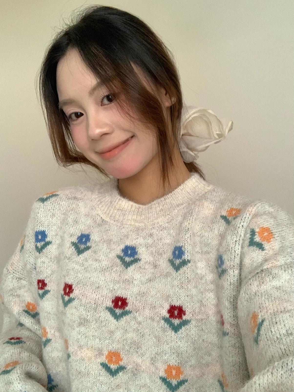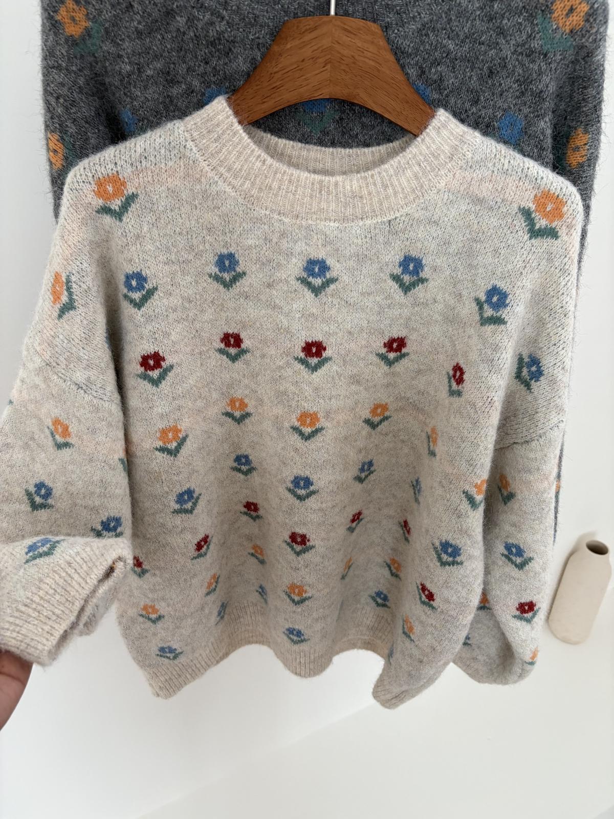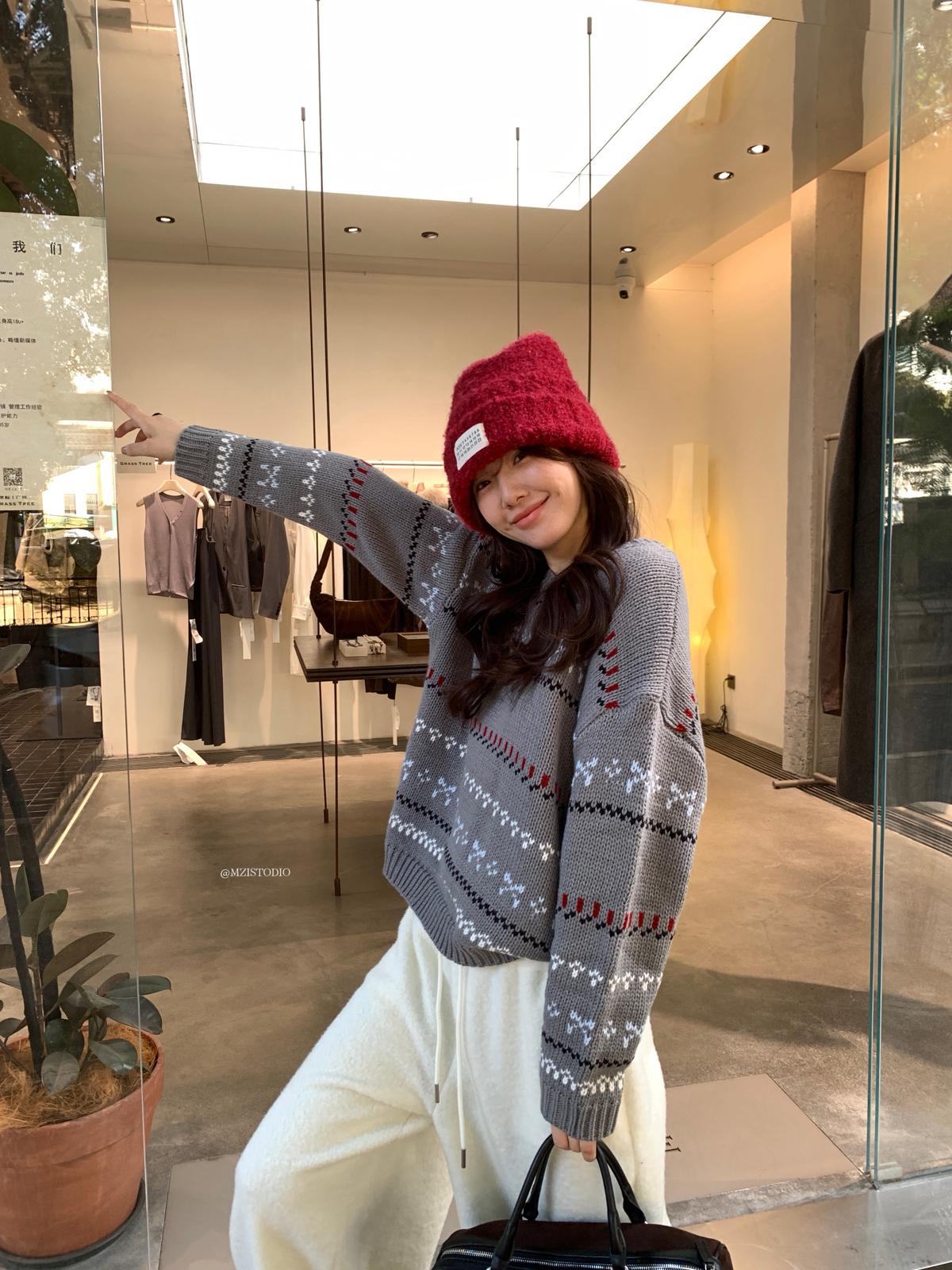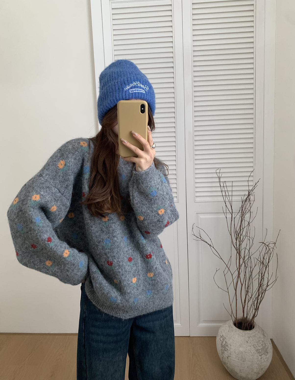 【C7990】小清新撞色花朵提花套頭上衣女2025冬季新款百搭寬鬆顯瘦保暖毛衣