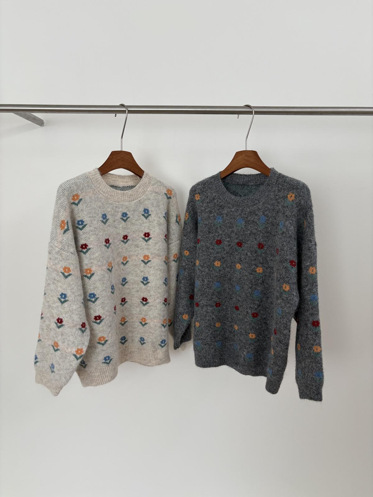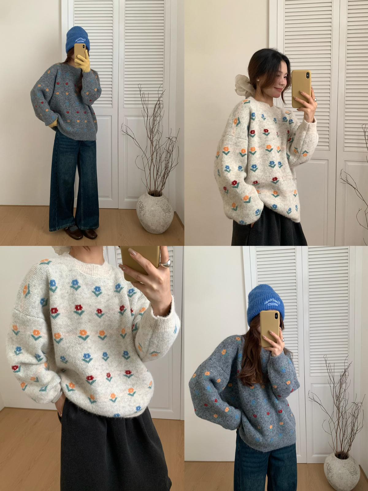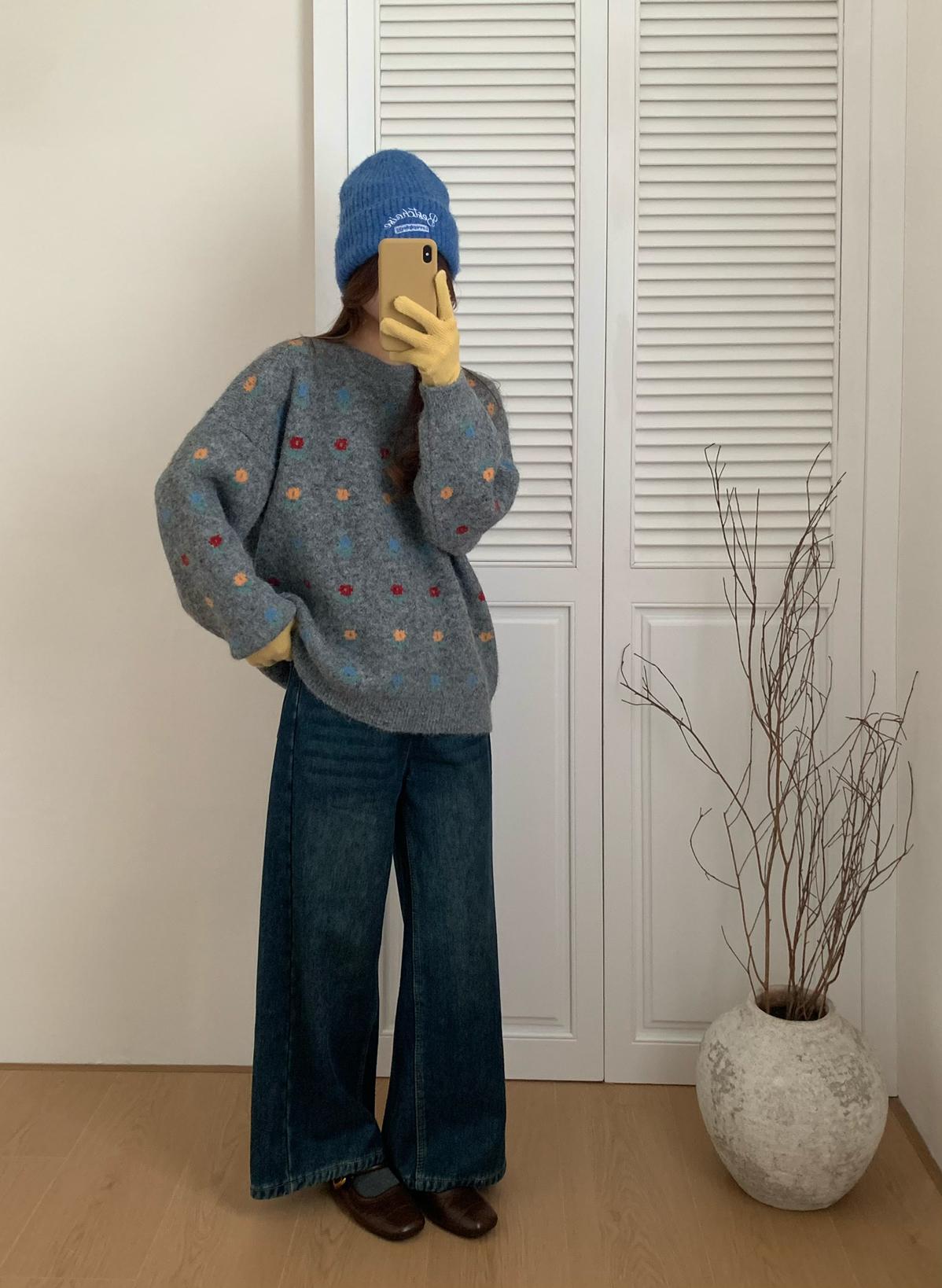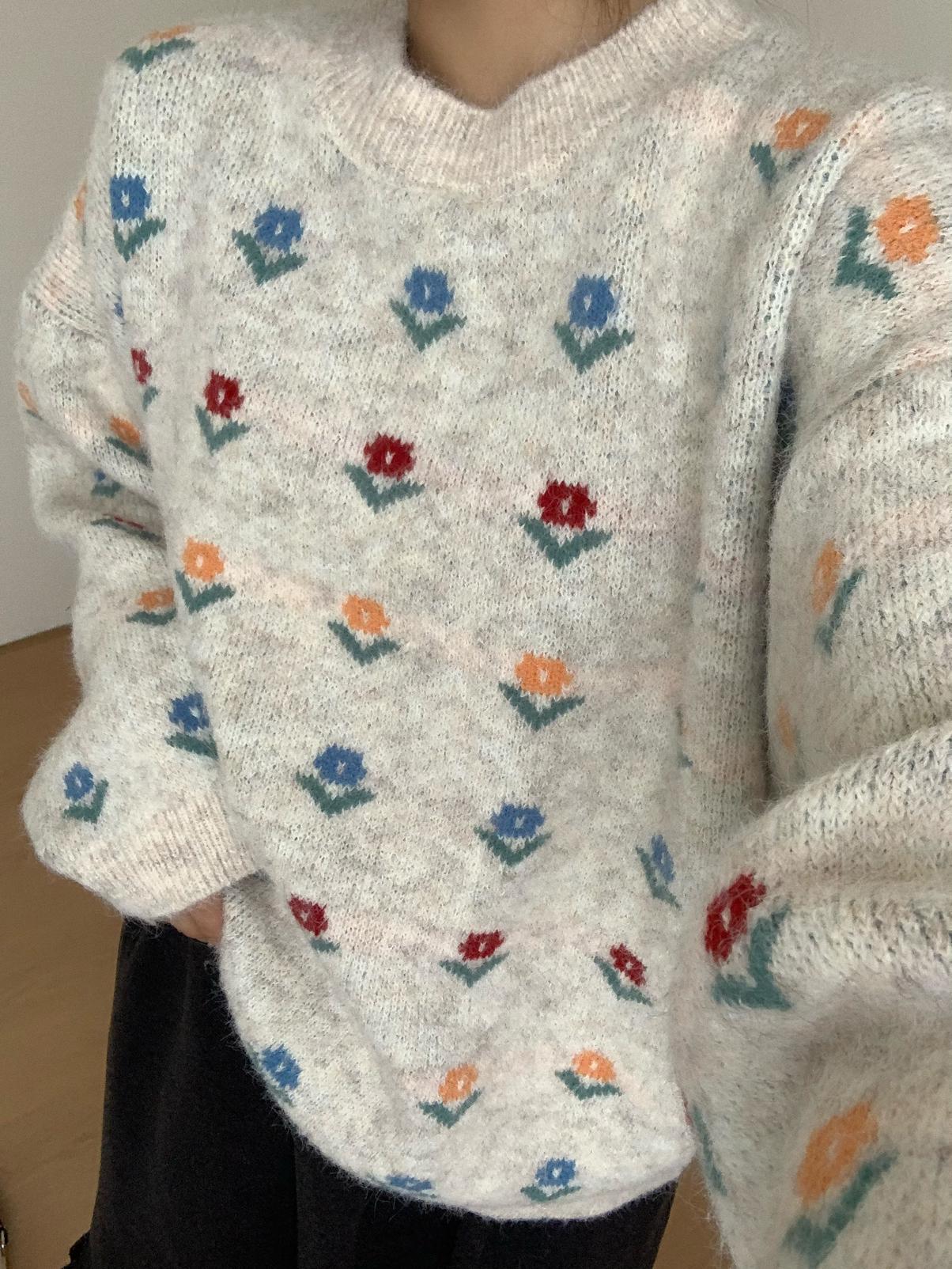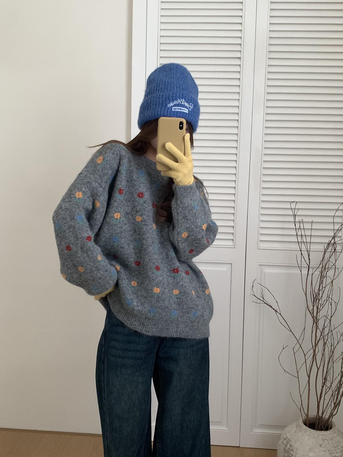 【C7990】小清新撞色花朵提花套頭上衣女2025冬季新款百搭寬鬆顯瘦保暖毛衣