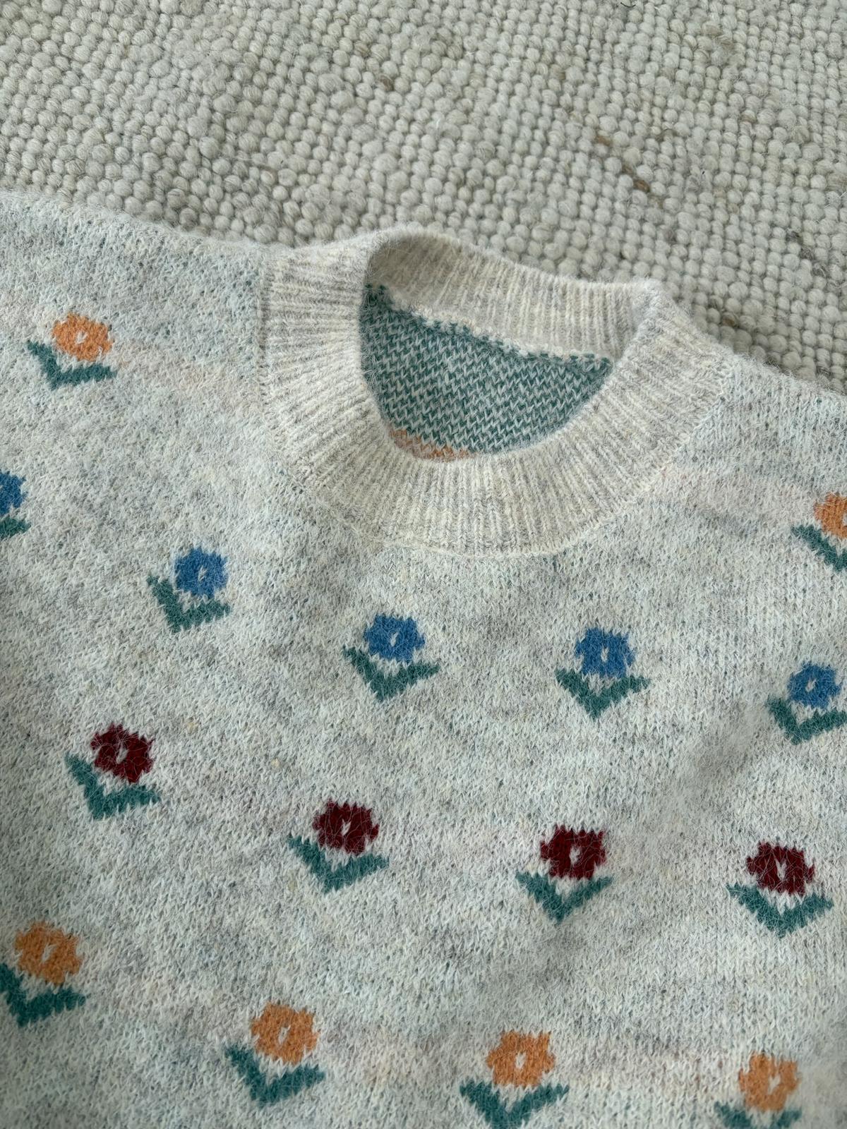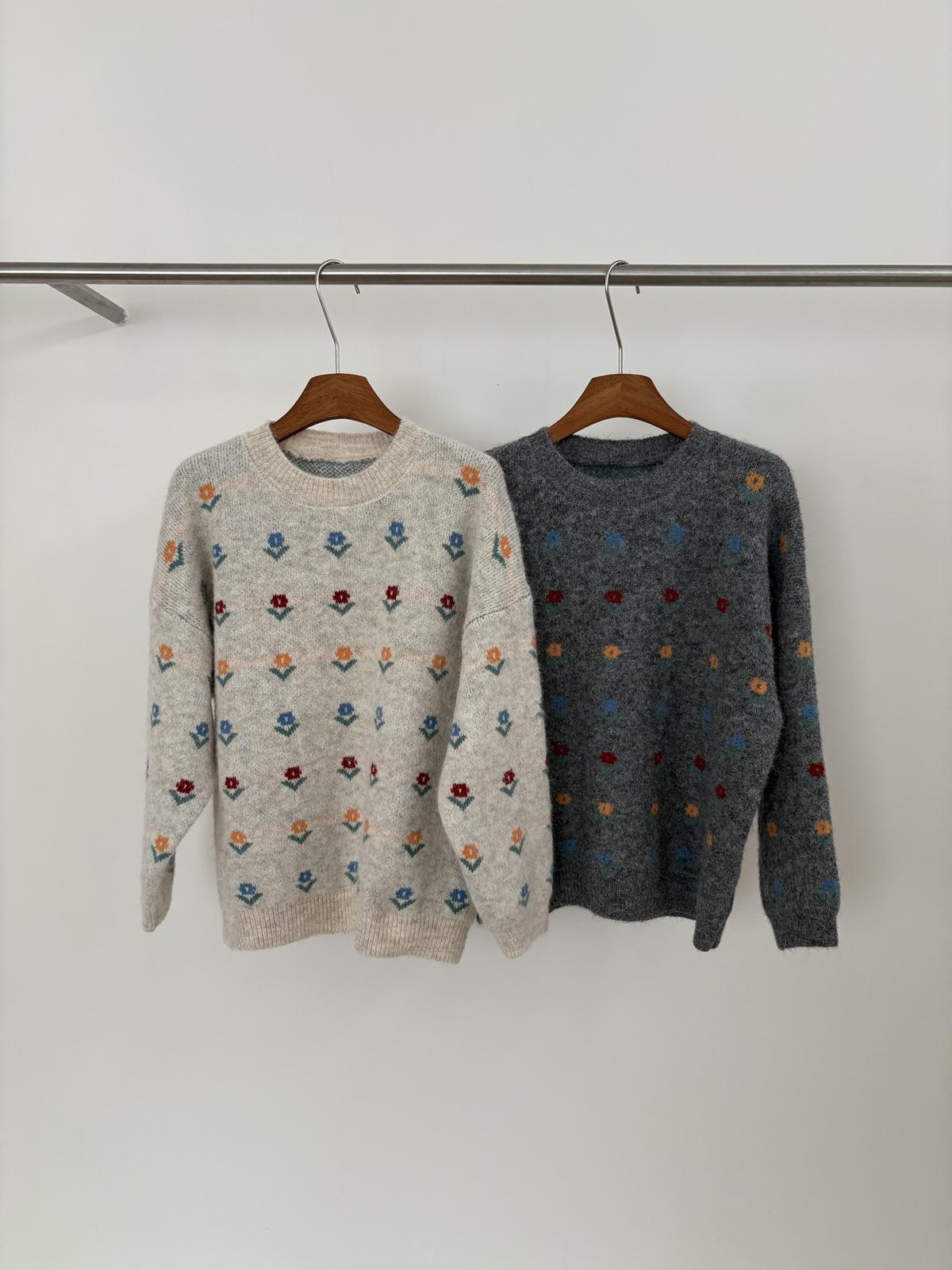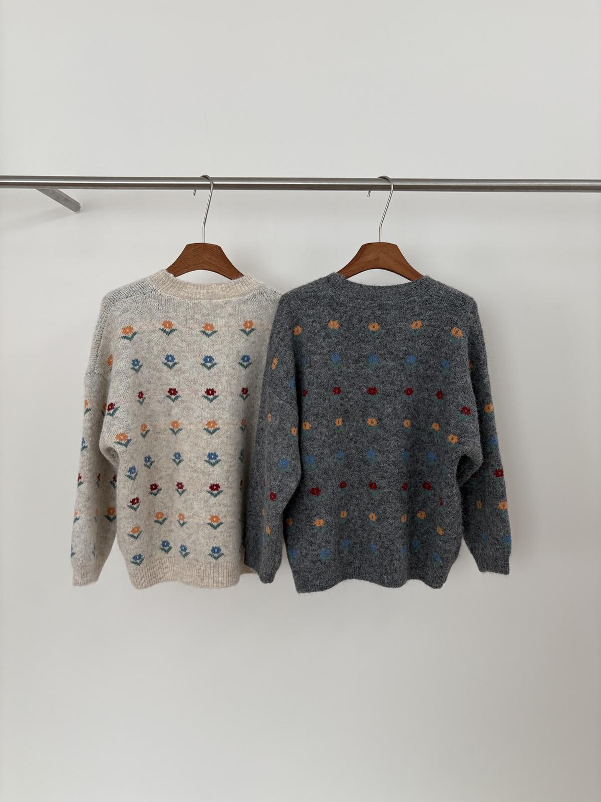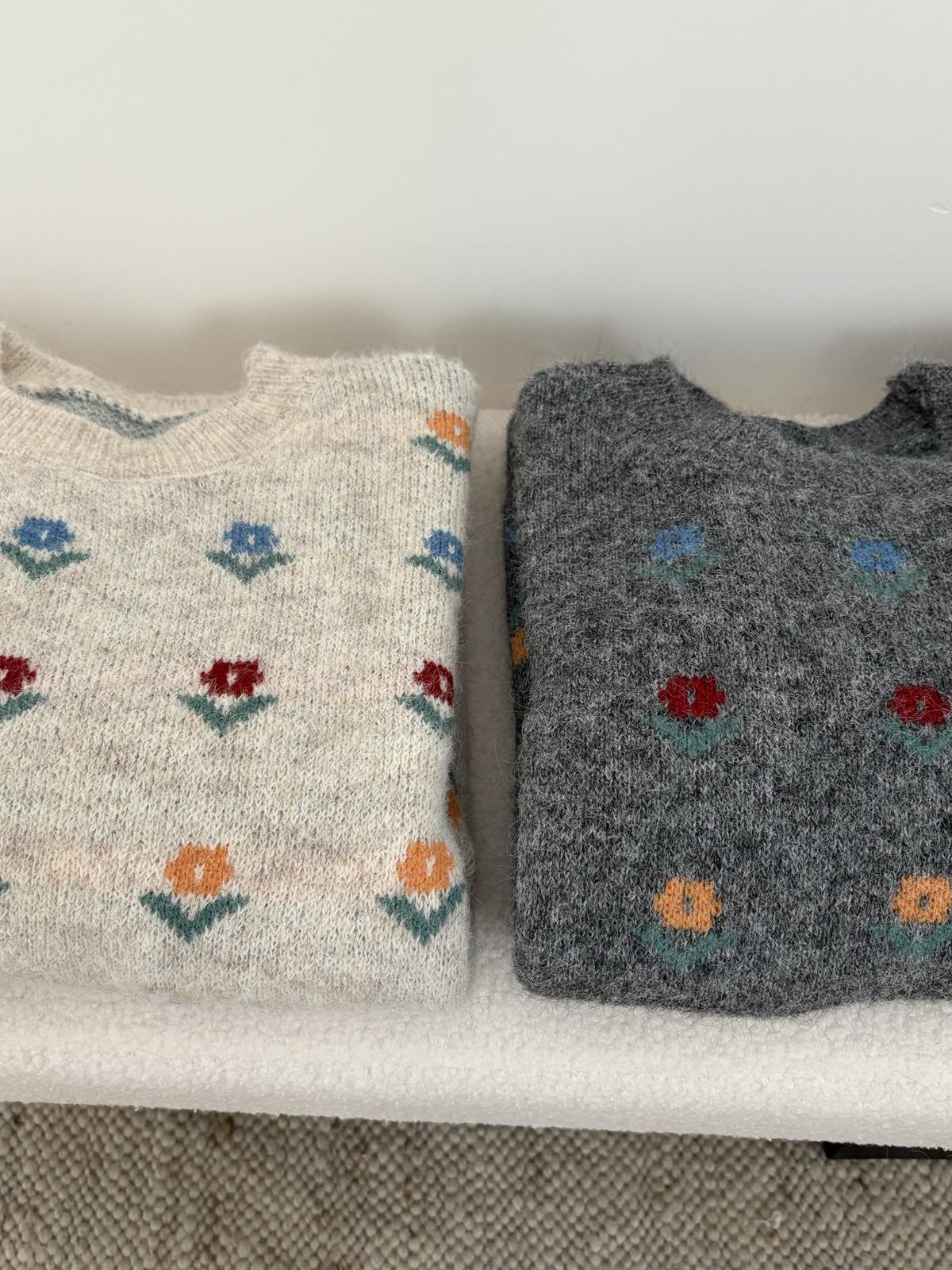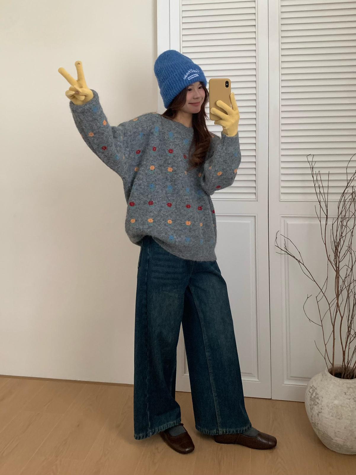 【C7990】小清新撞色花朵提花套頭上衣女2025冬季新款百搭寬鬆顯瘦保暖毛衣