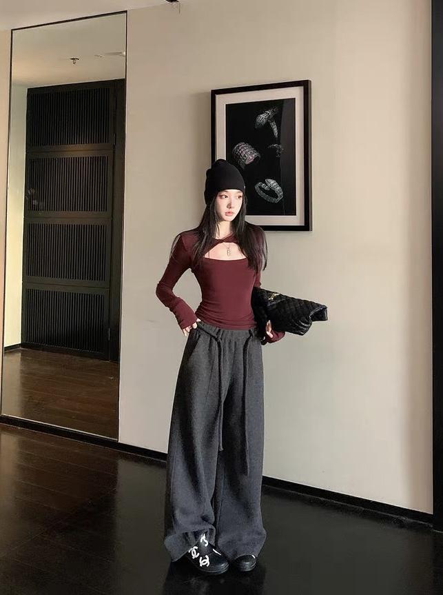 【C7956】美式復古彎刀剪裁設計內裏複合糯米絨+豹紋絲巾編織繩腰帶寬鬆休閒褲