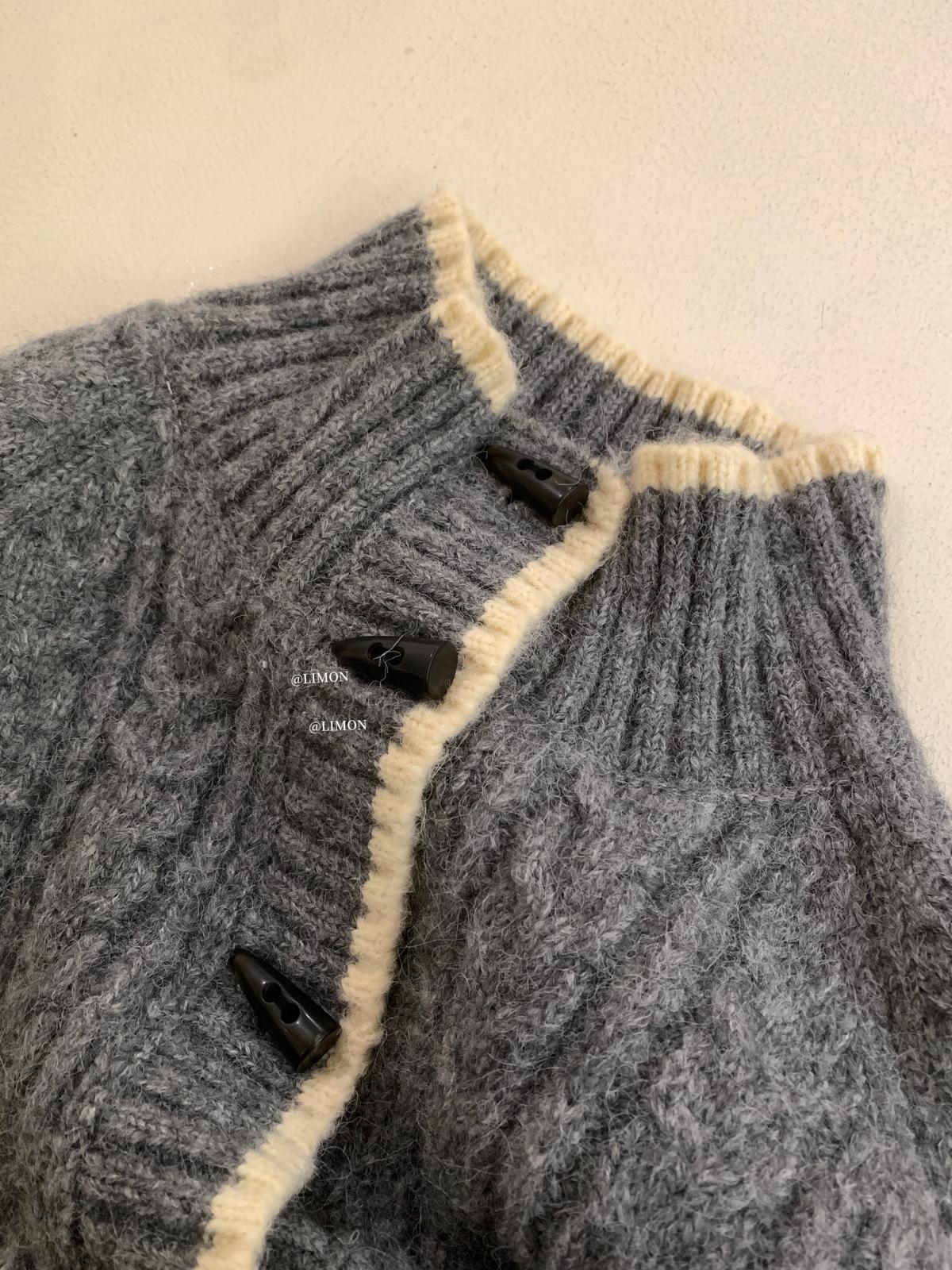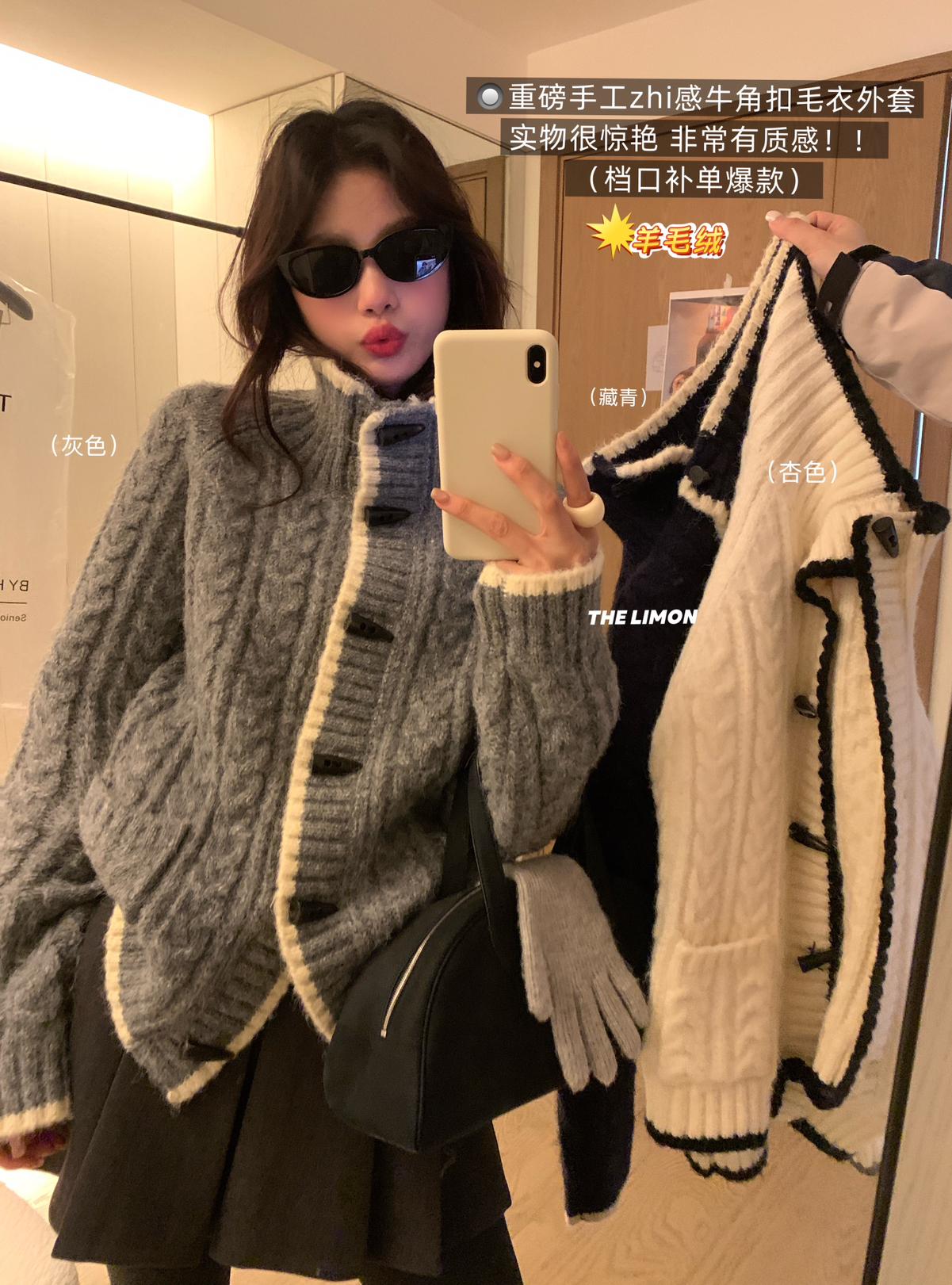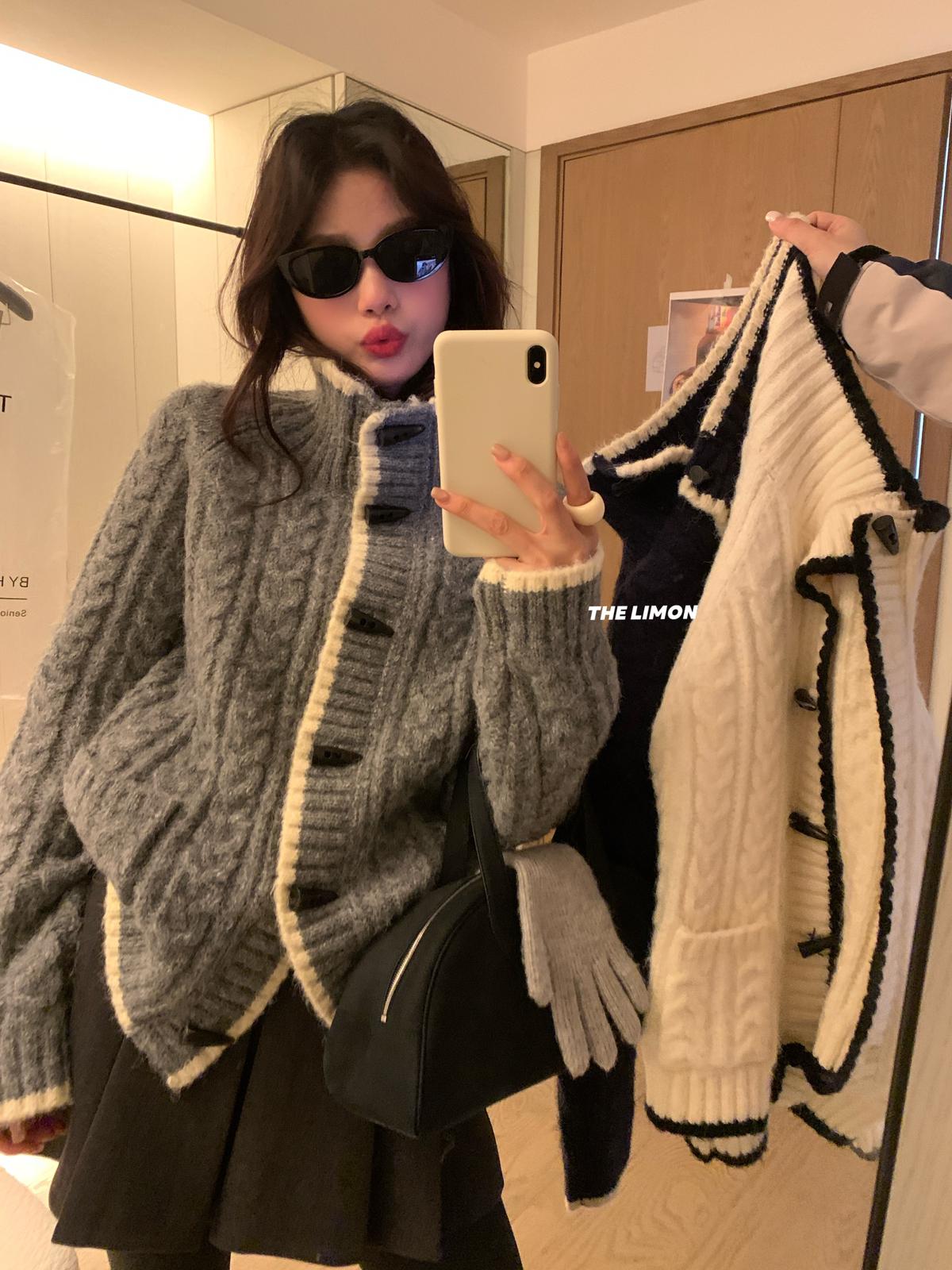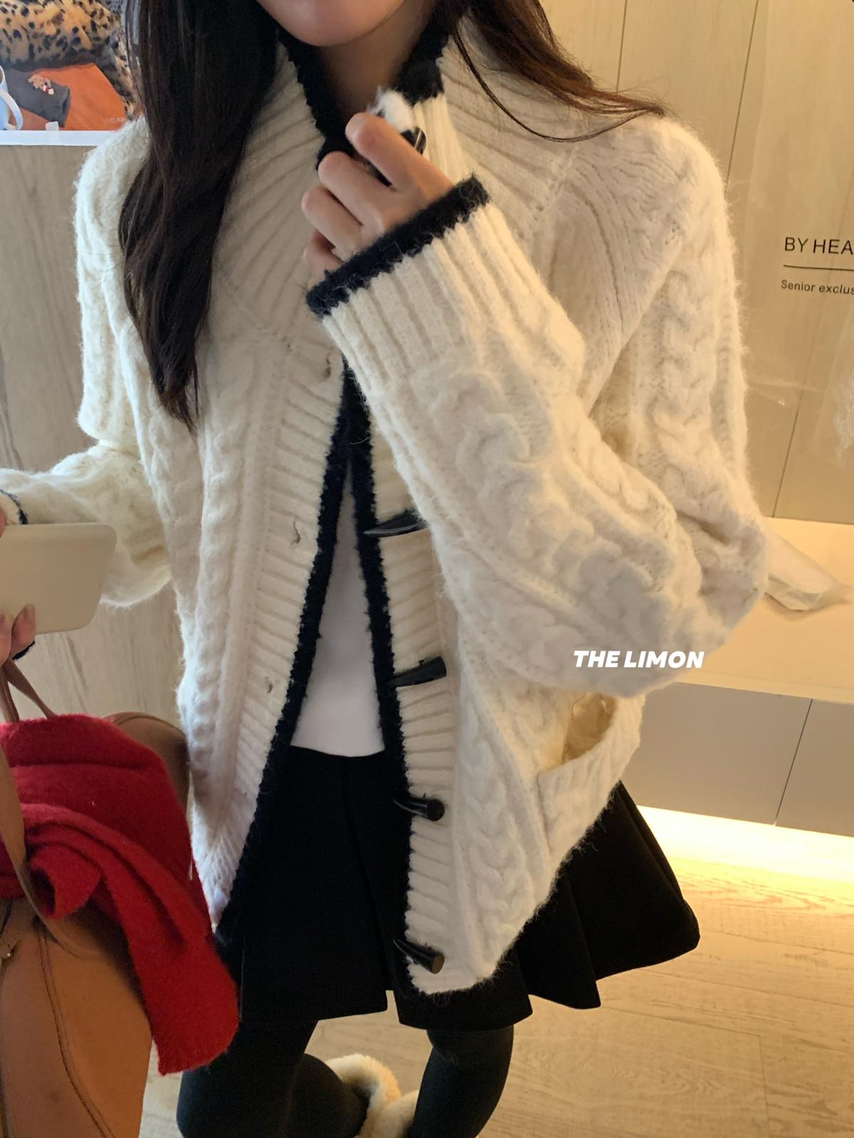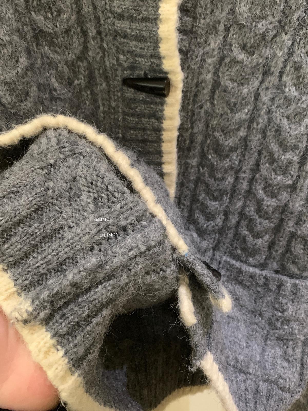 【C8008】高質感重工復古撞色牛角扣開衫保暖毛衣(含8%羊毛)