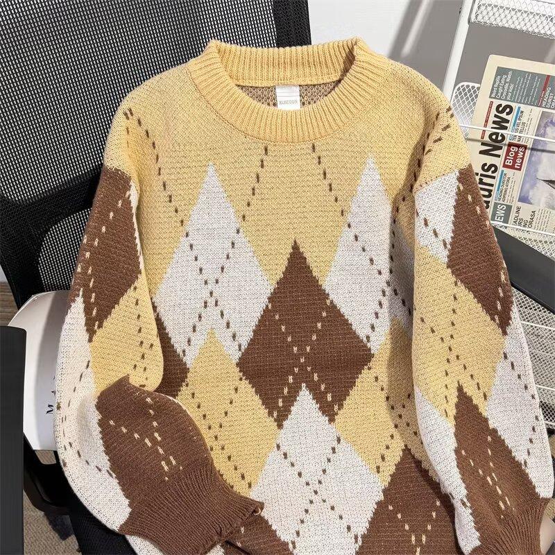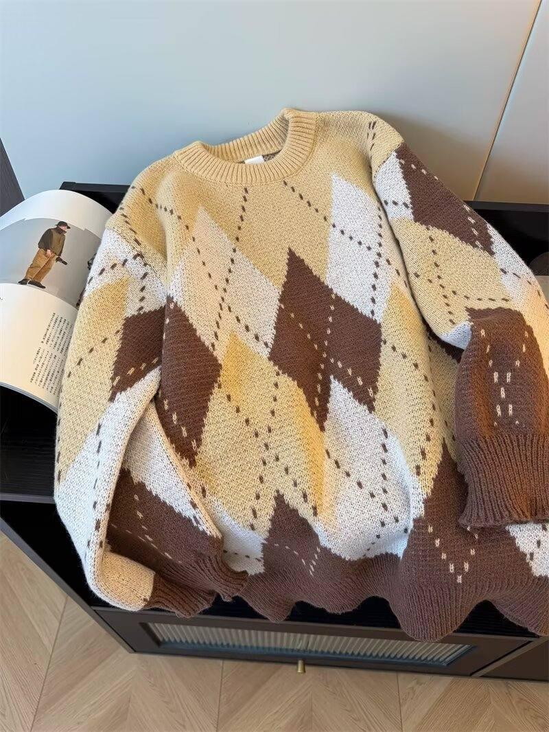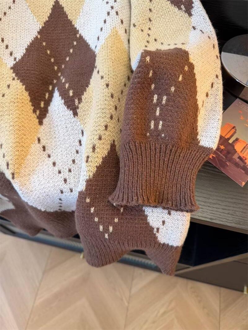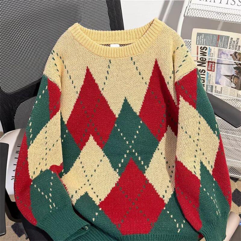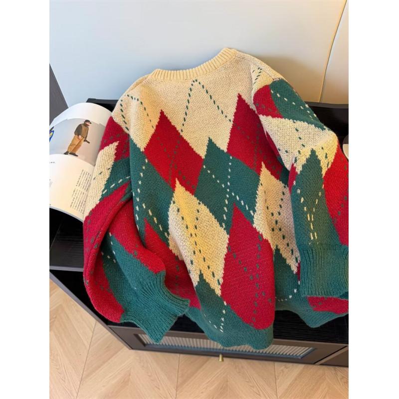 【YS2621】鹿毛絨菱形格撞色聖誕冬季保暖圓領保暖毛衣