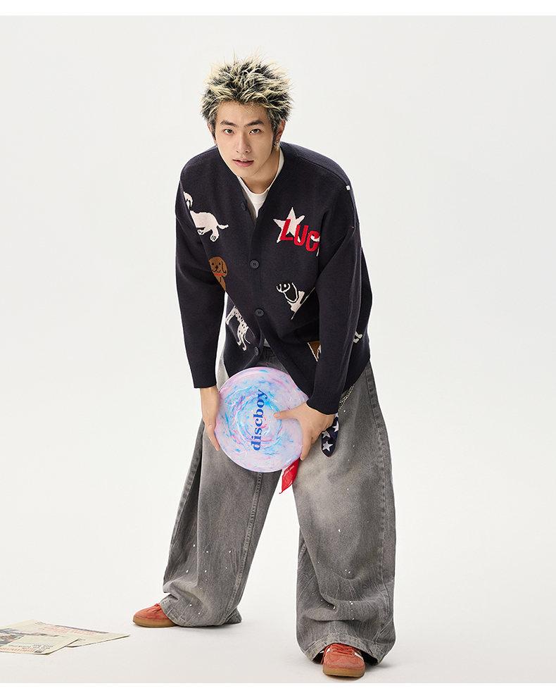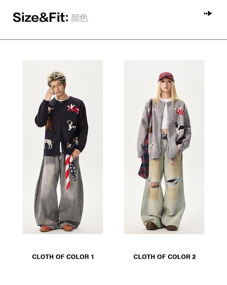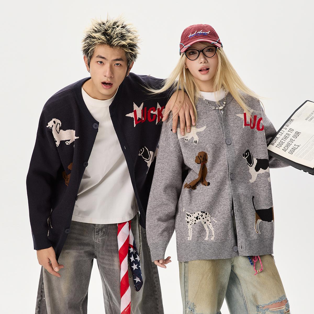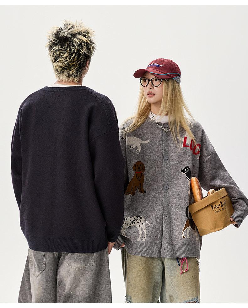 【YS2629】冬圓領開衫針織小貓小狗寬鬆外套保暖毛衣