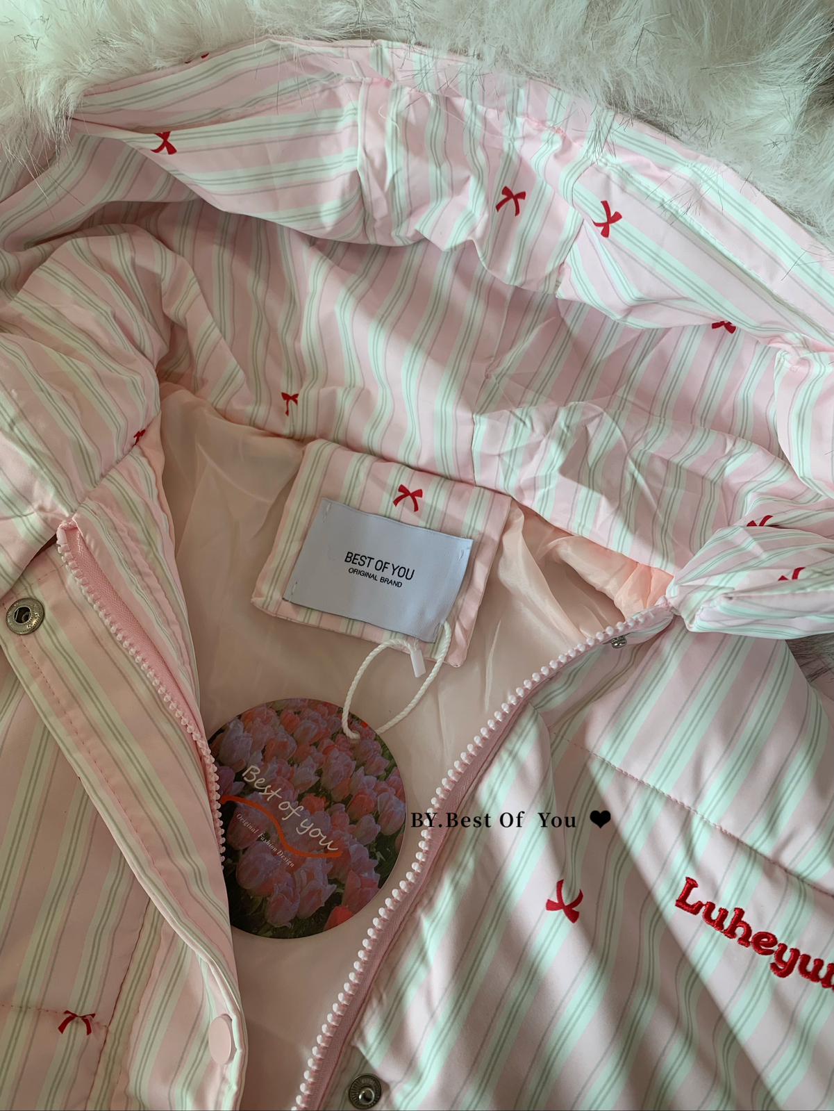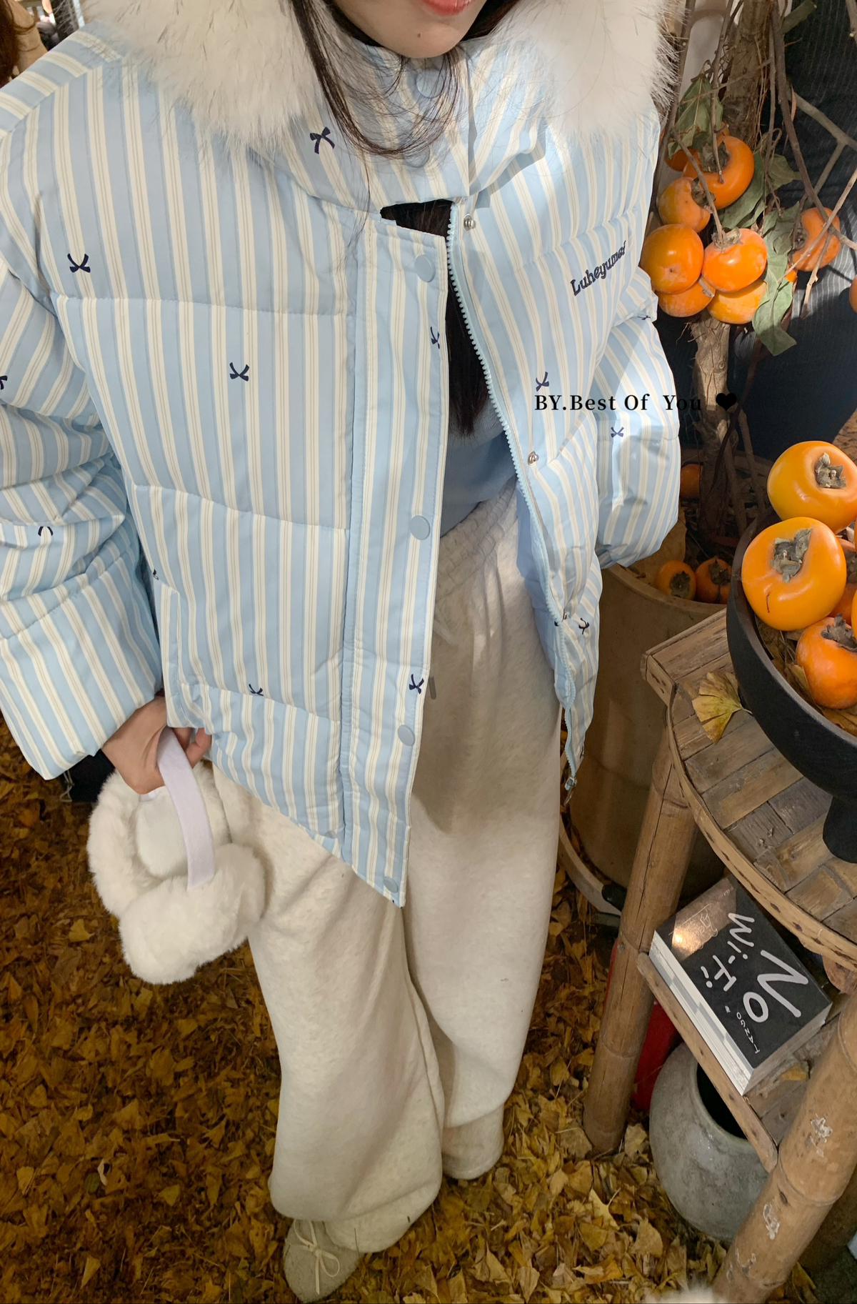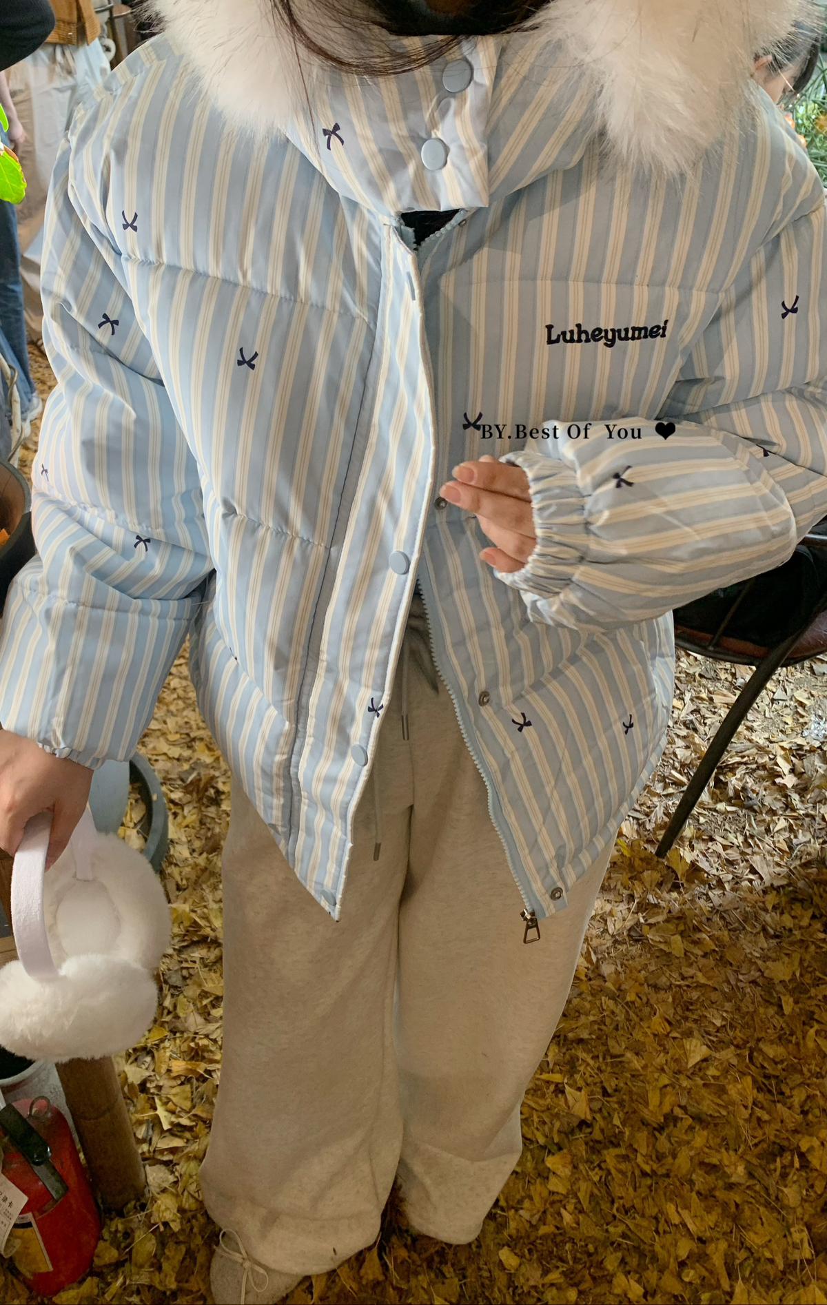 【C8227】爆款上架推薦~甜美條紋蝴蝶結棉服外套保暖棉服外套(配可拆卸環保毛領)