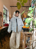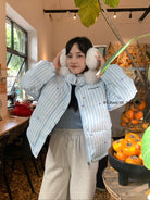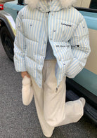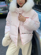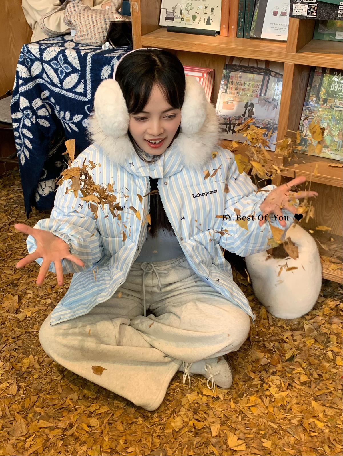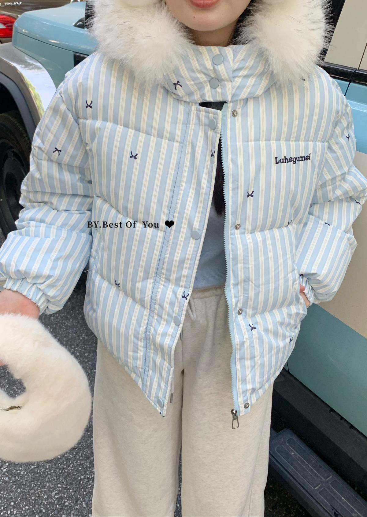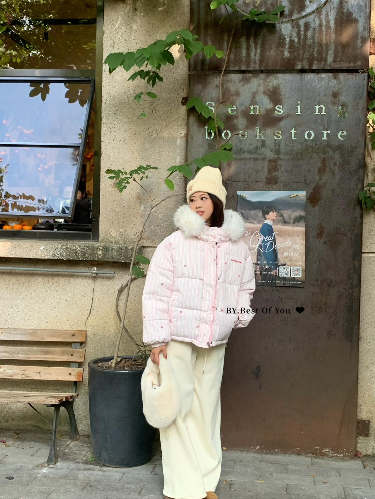【C8227】爆款上架推薦~甜美條紋蝴蝶結棉服外套保暖棉服外套(配可拆卸環保毛領)