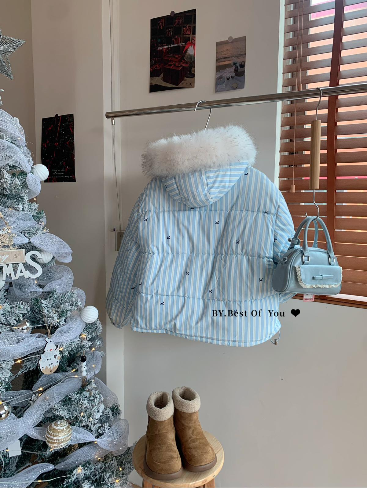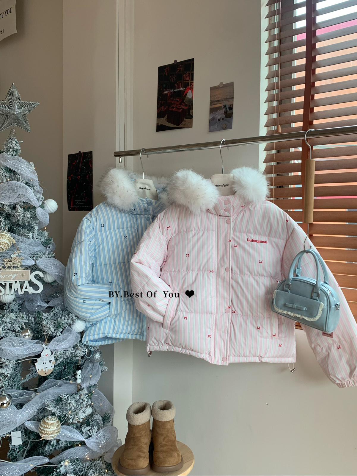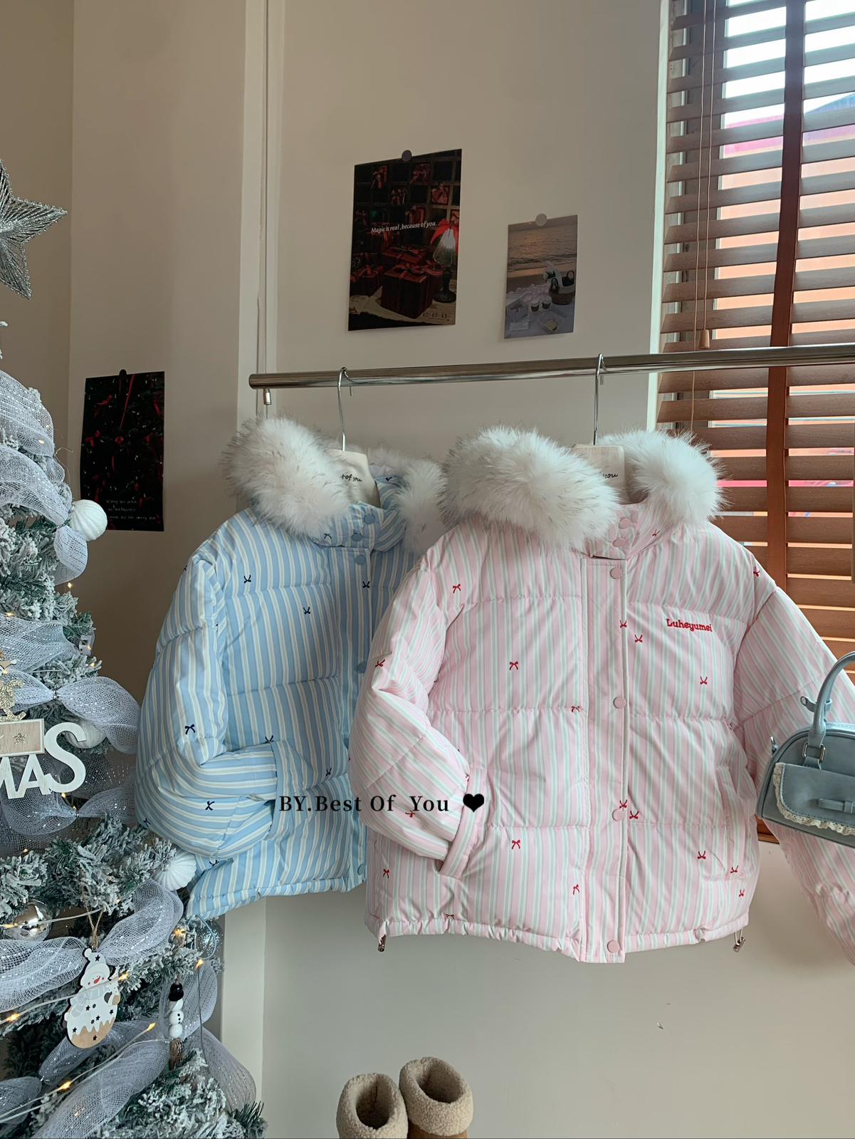 3. 【C8227】爆款上架推薦~甜美條紋蝴蝶結棉服外套保暖棉服外套(配可拆卸環保毛領)
