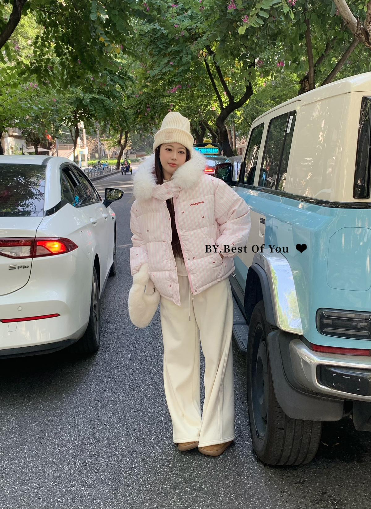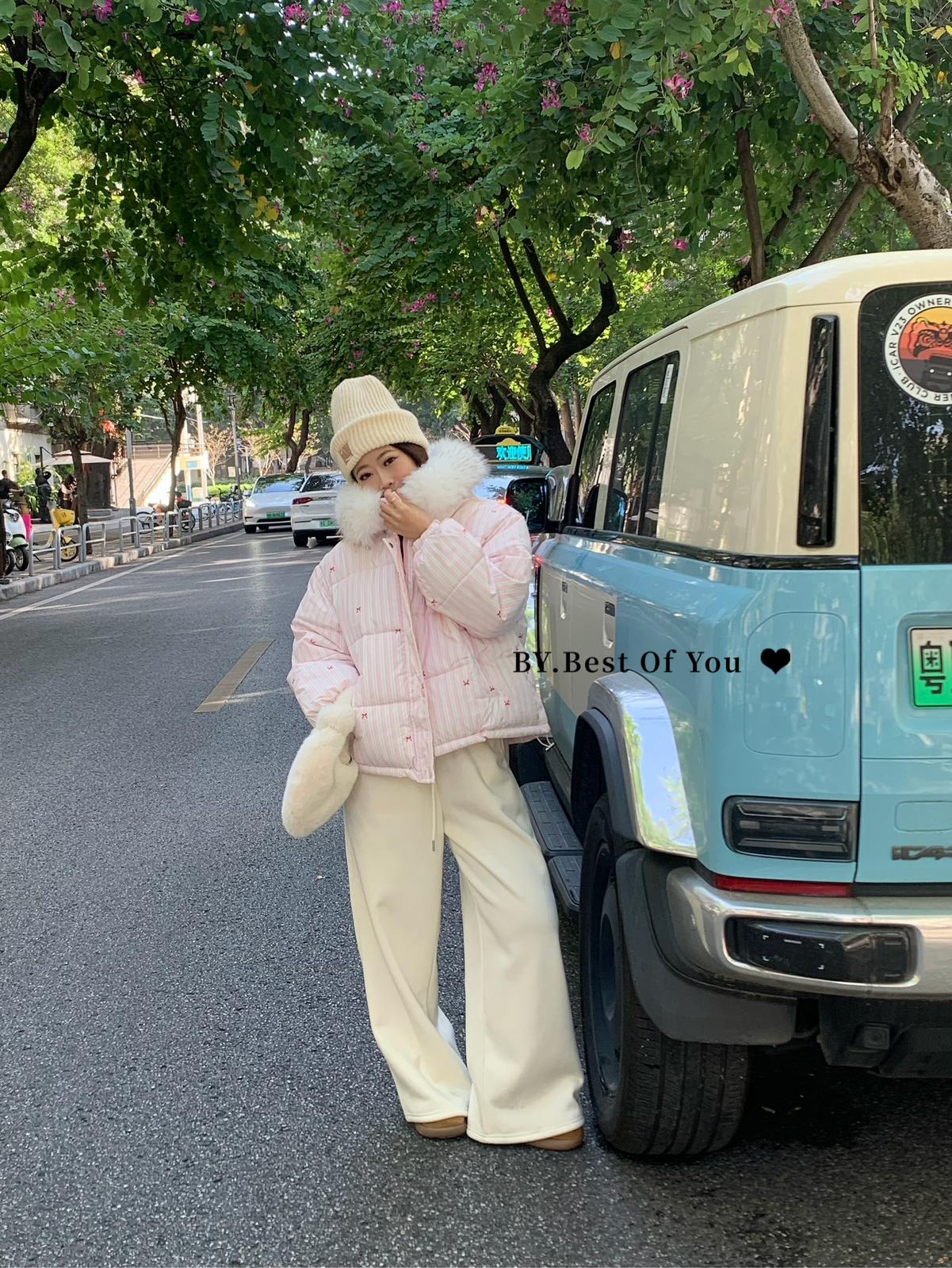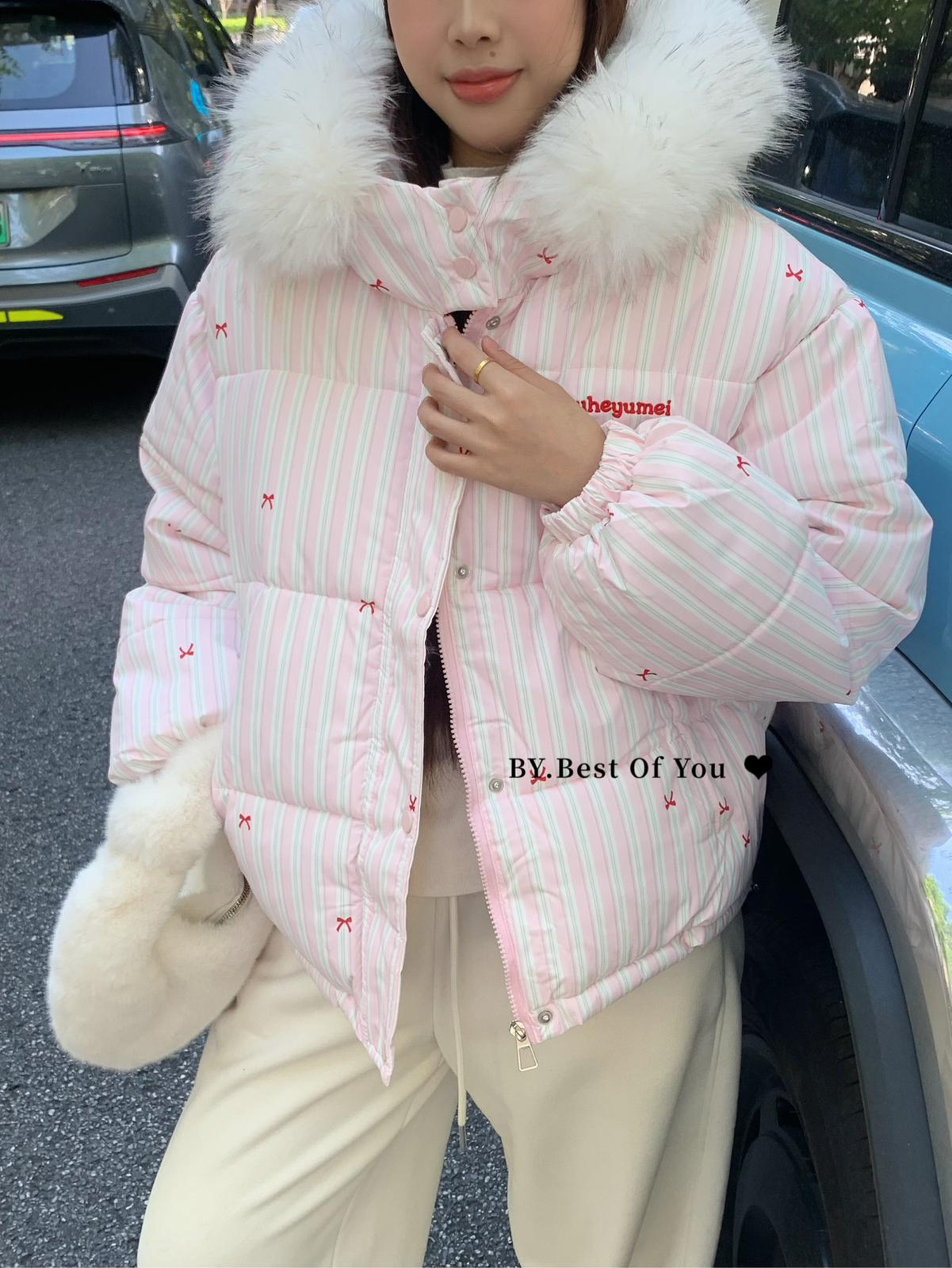 3. 【C8227】爆款上架推薦~甜美條紋蝴蝶結棉服外套保暖棉服外套(配可拆卸環保毛領)