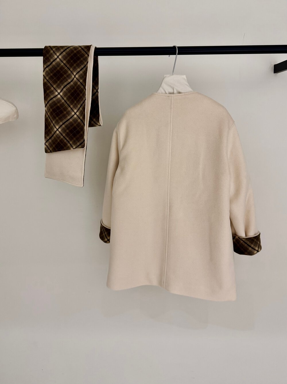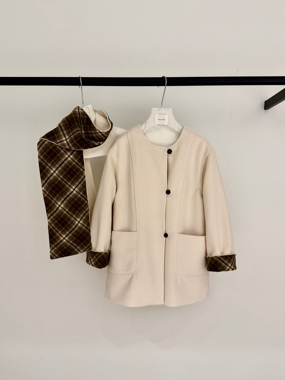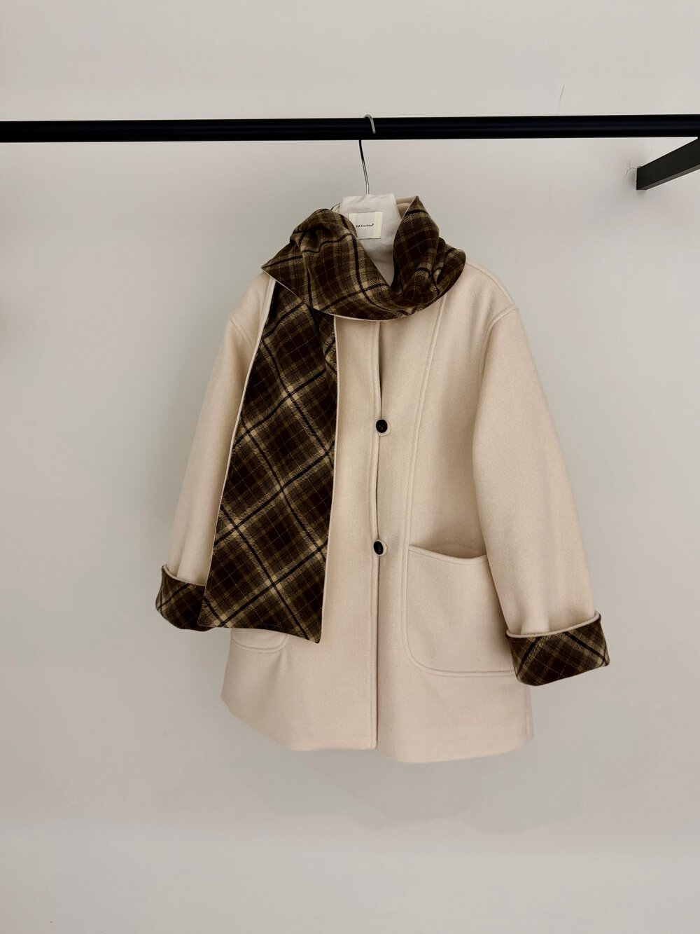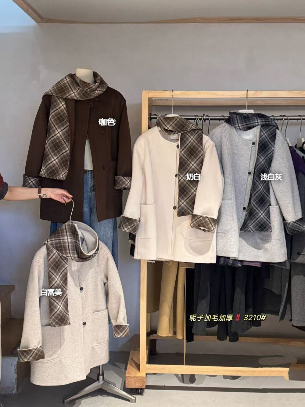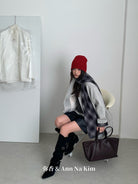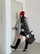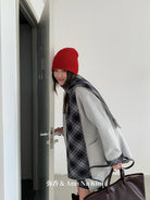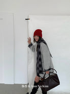 【C8235】韓系超好看百搭簡約加厚加絨雙面呢撞色格子大衣(配格子圍巾)