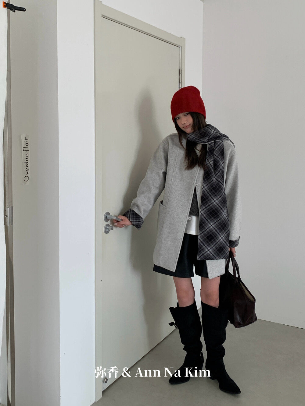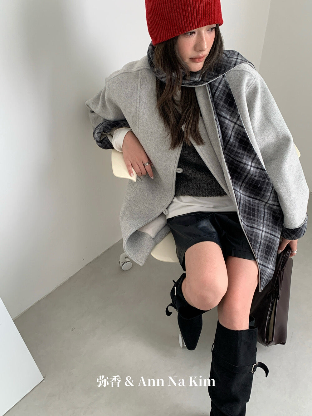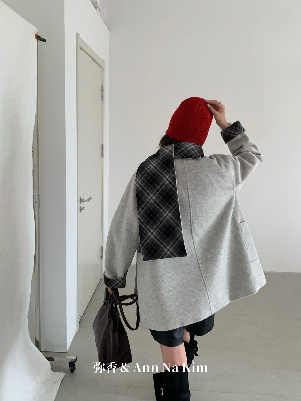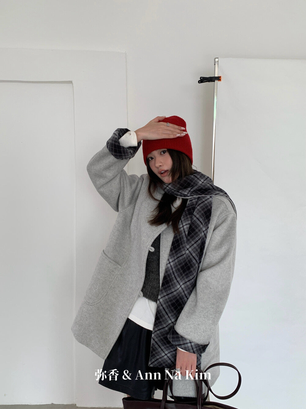 【C8235】韓系超好看百搭簡約加厚加絨雙面呢撞色格子大衣(配格子圍巾)