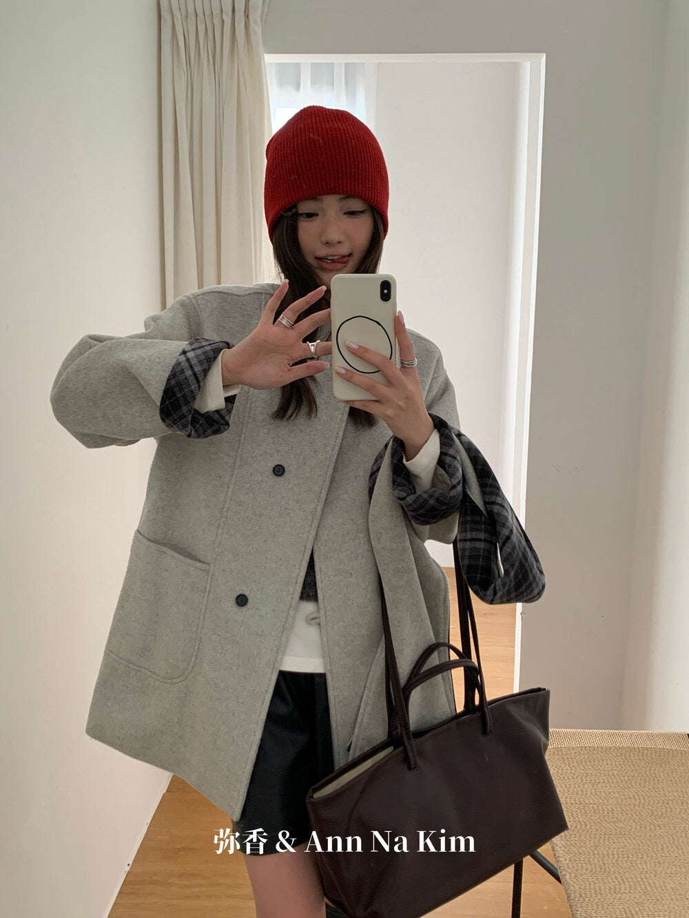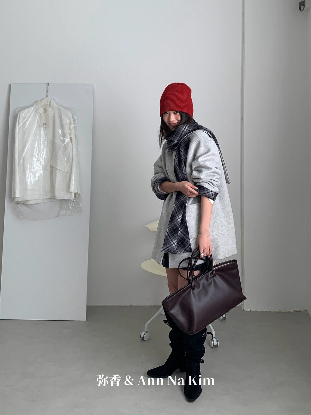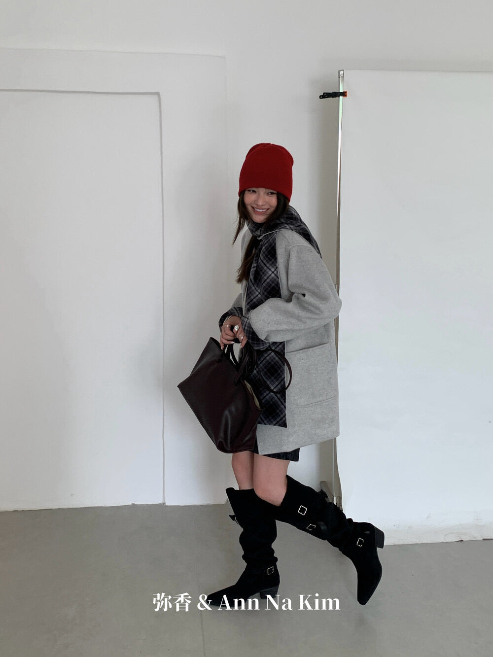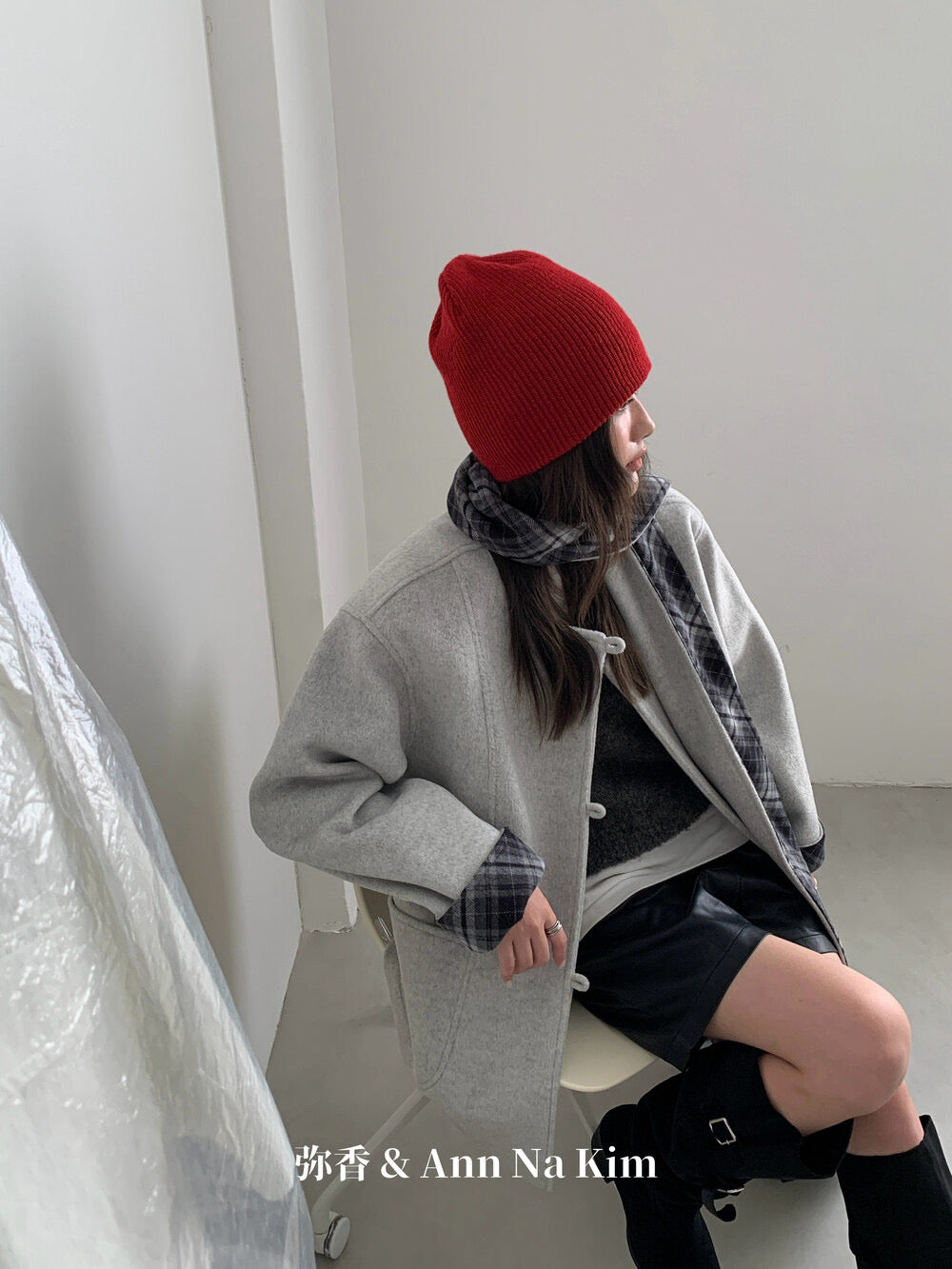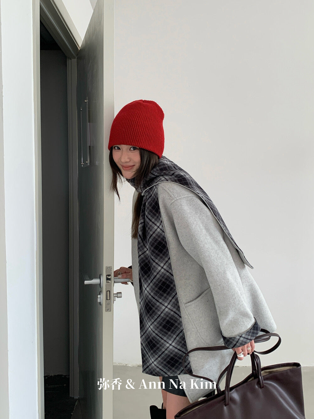 【C8235】韓系超好看百搭簡約加厚加絨雙面呢撞色格子大衣(配格子圍巾)