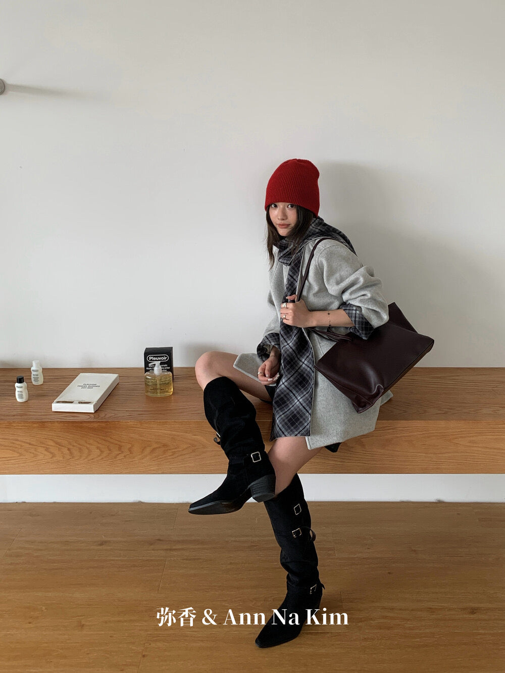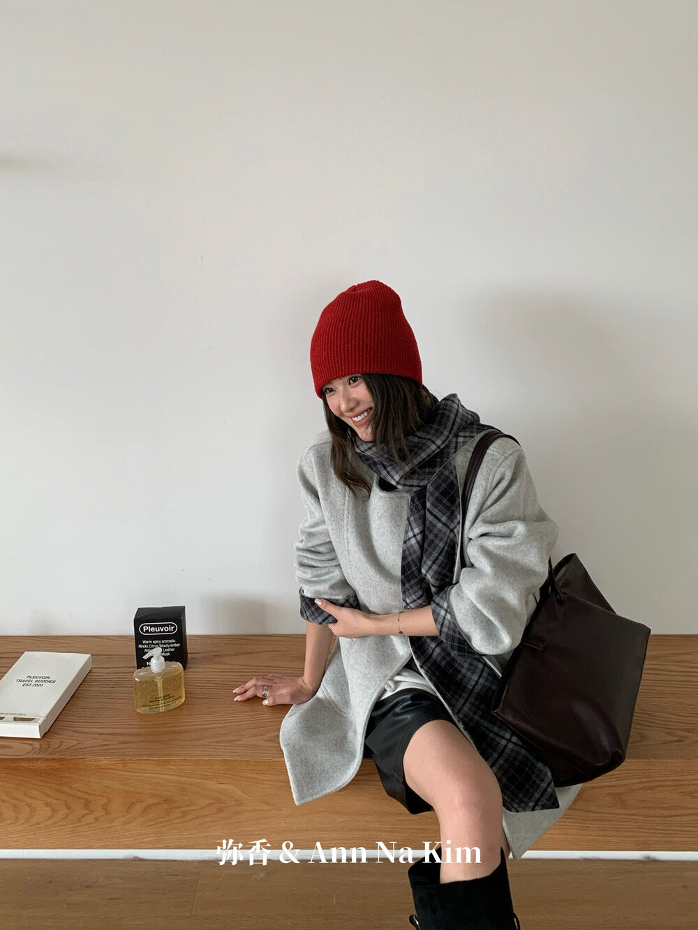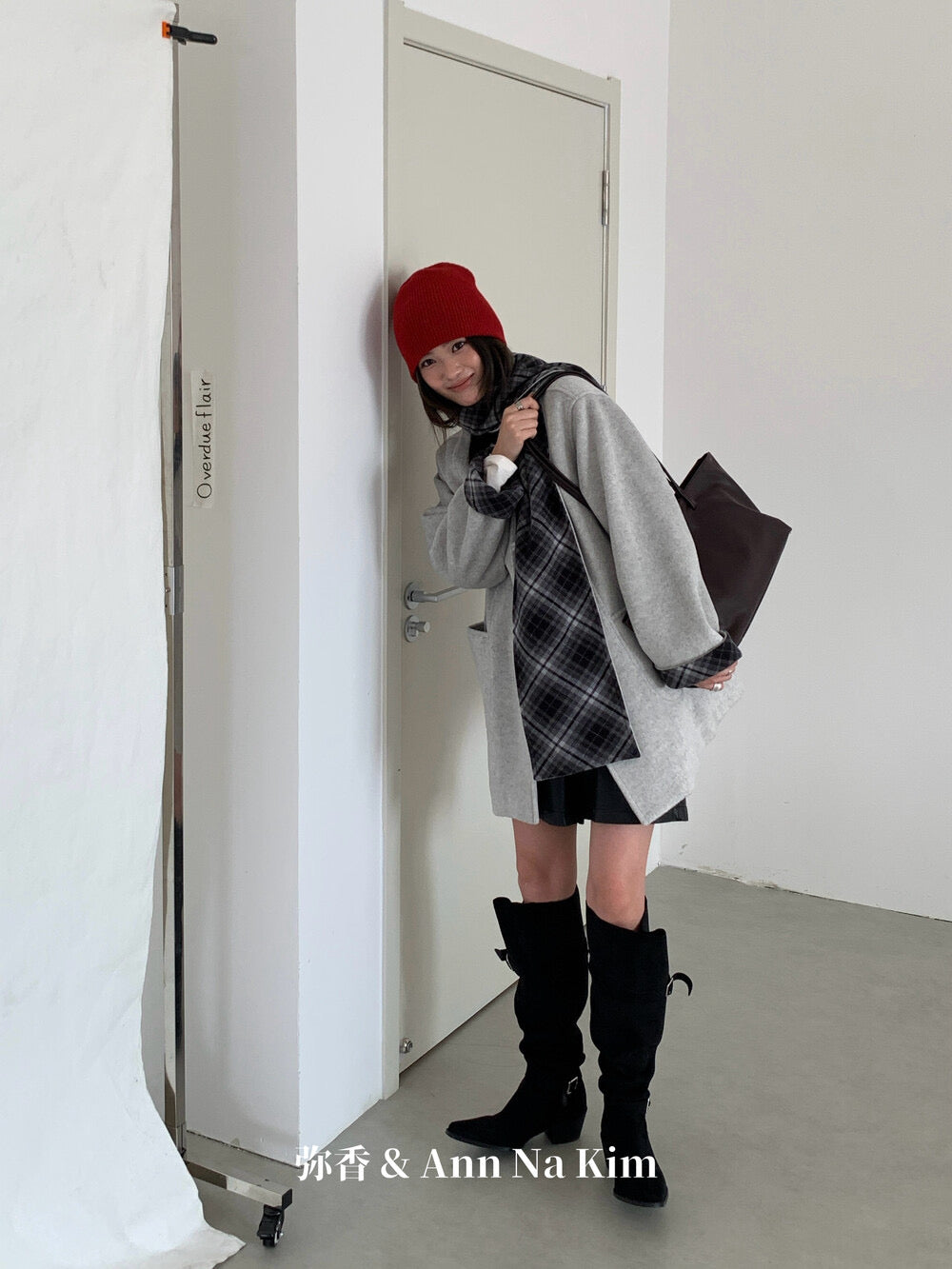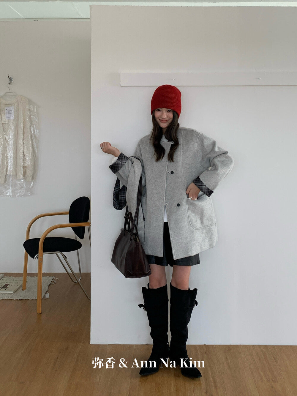 【C8235】韓系超好看百搭簡約加厚加絨雙面呢撞色格子大衣(配格子圍巾)