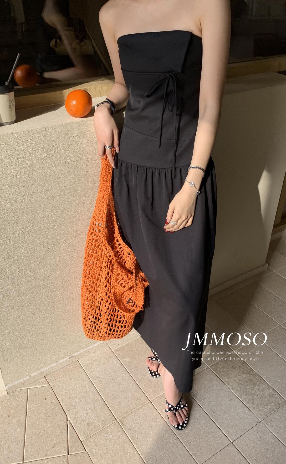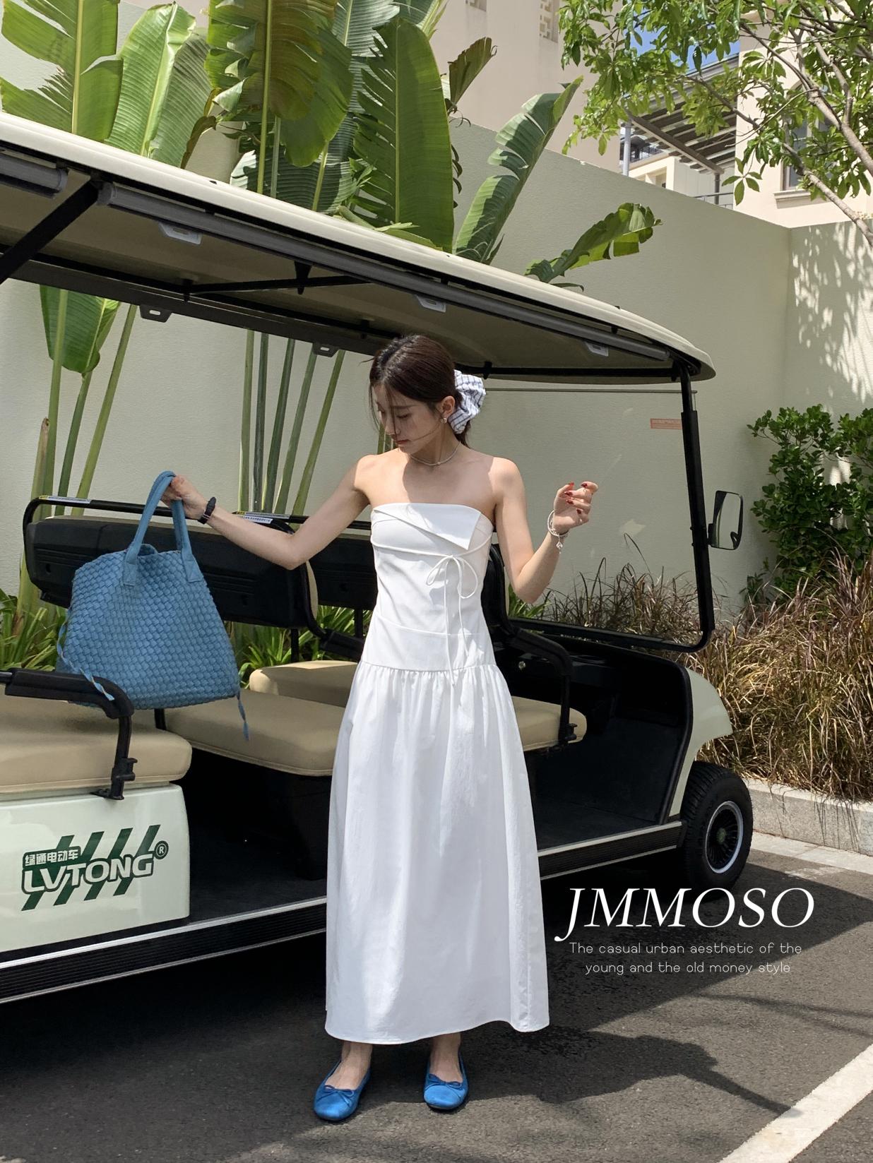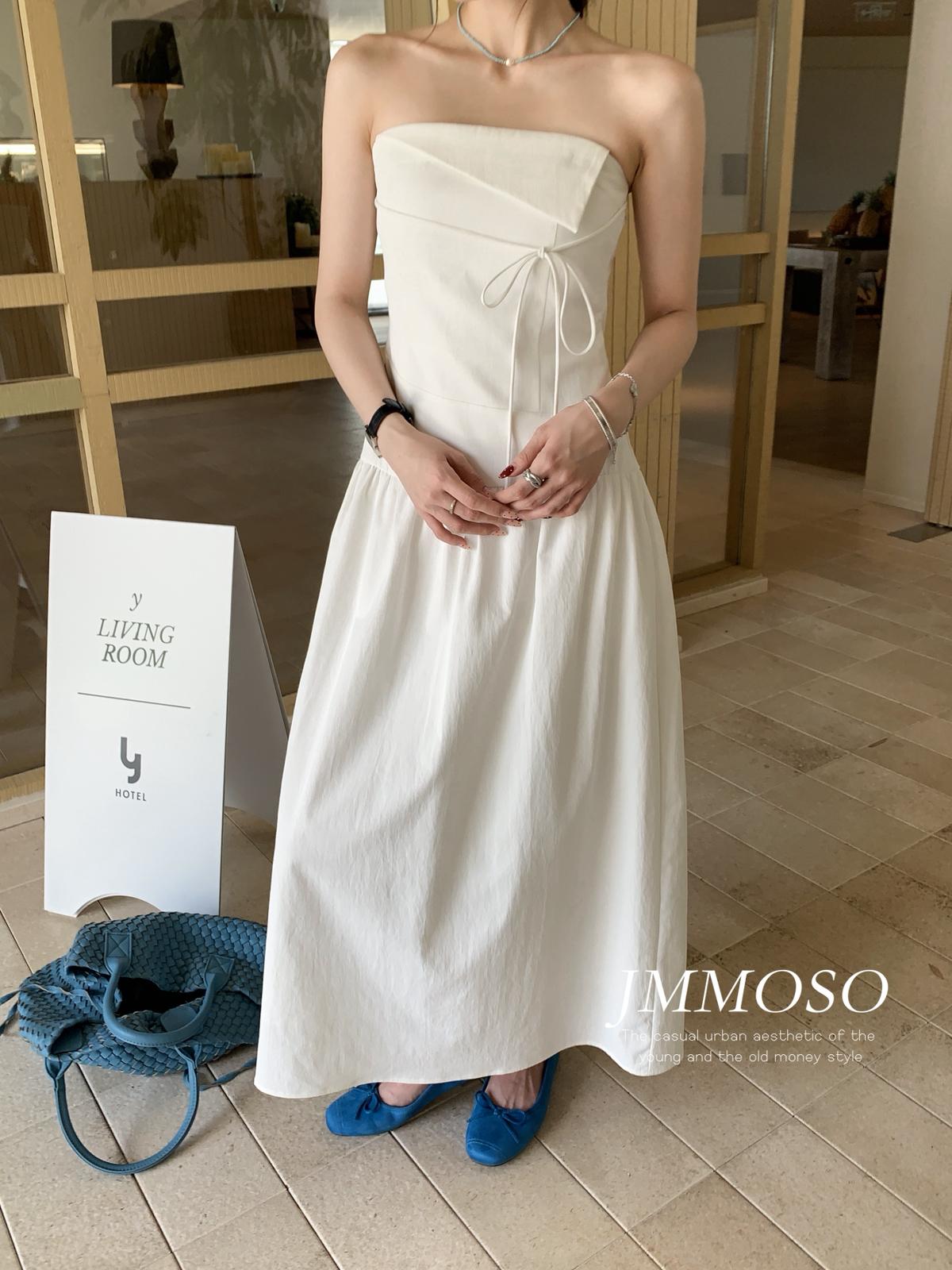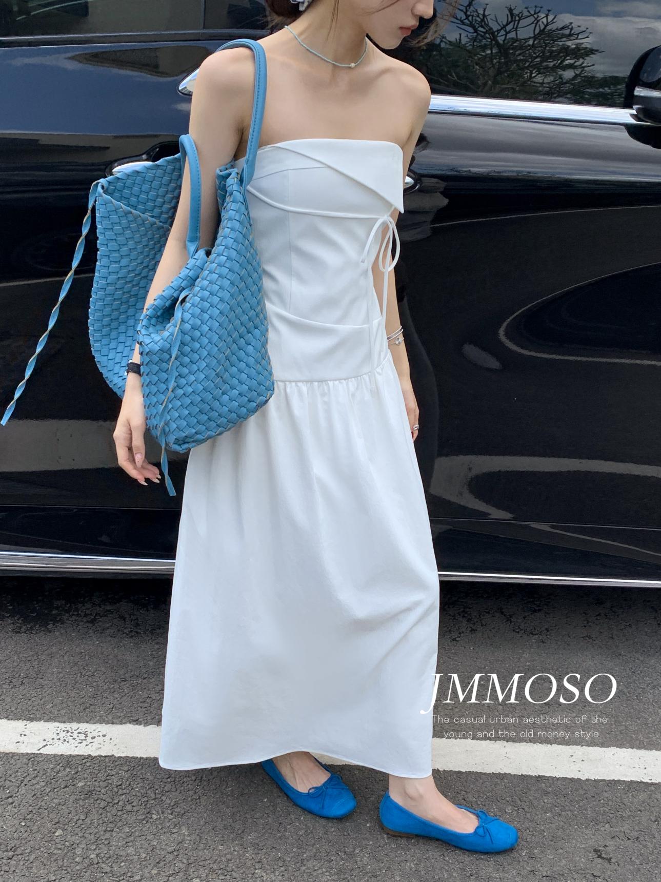 【C9002】清潭洞ins博主風舒適亞麻氣質翻領抹胸繫帶顯瘦連衣裙
