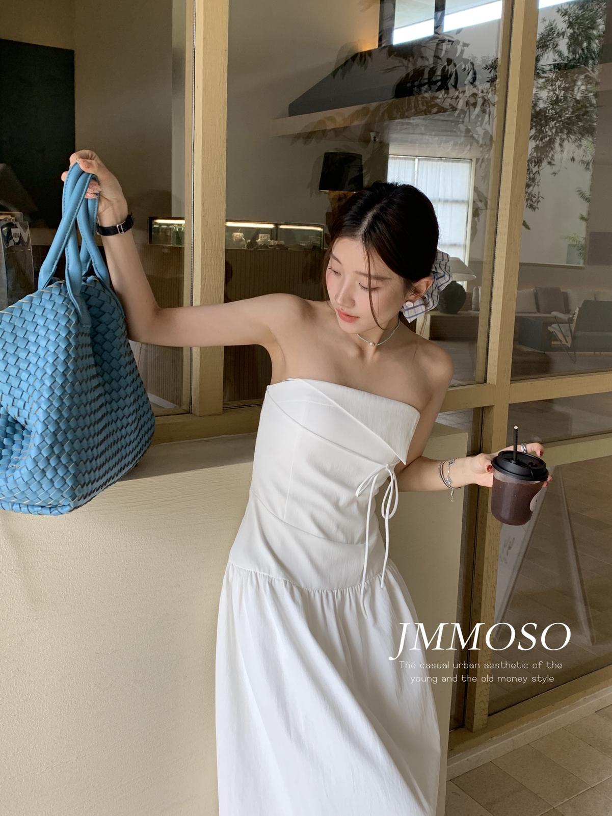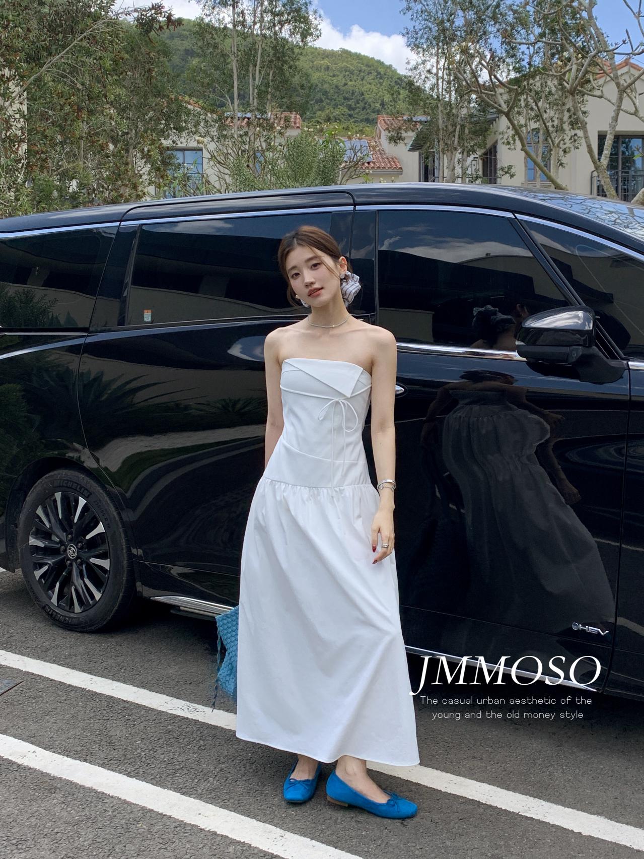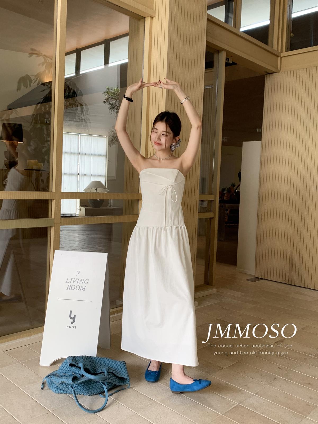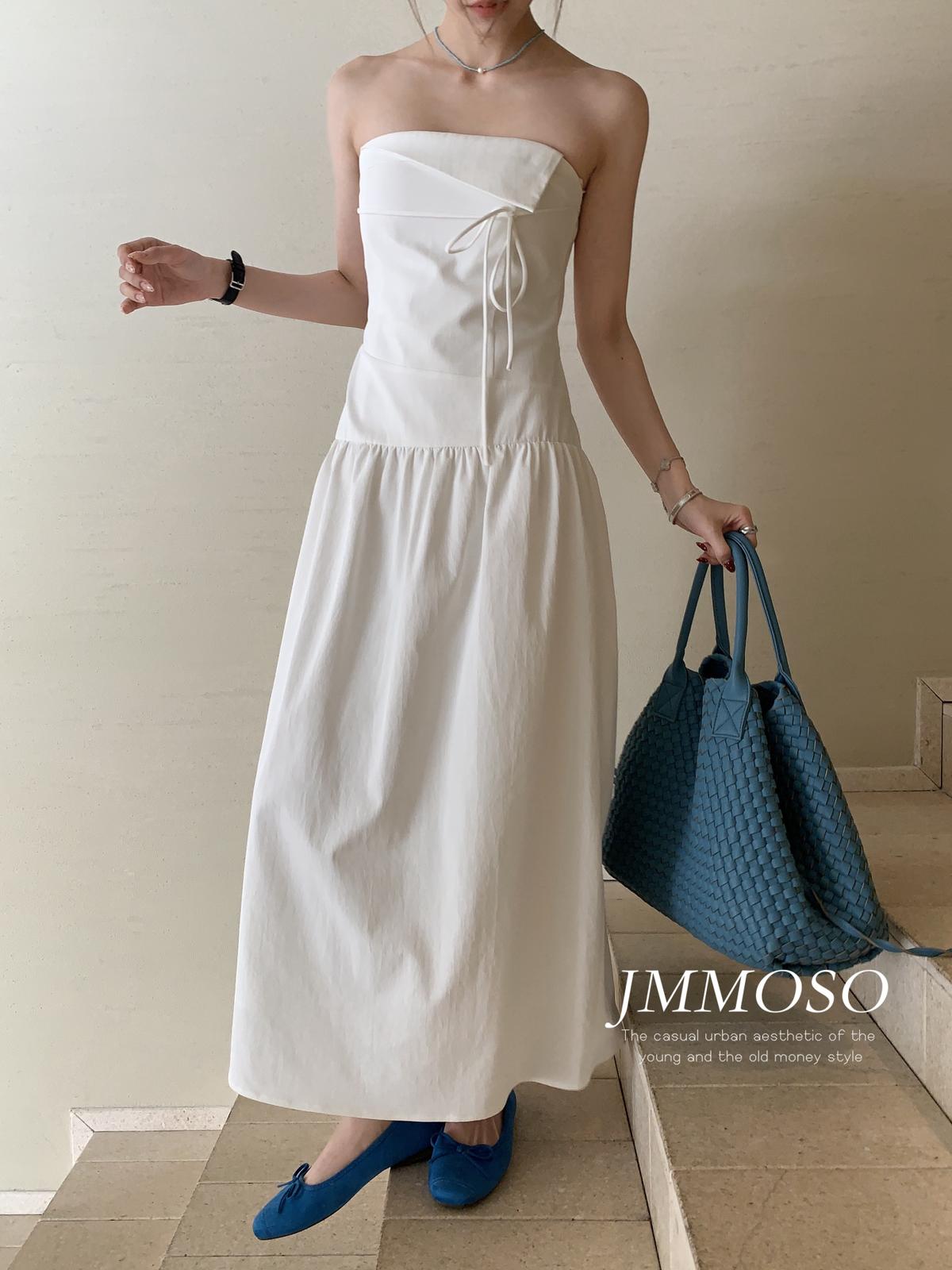 【C9002】清潭洞ins博主風舒適亞麻氣質翻領抹胸繫帶顯瘦連衣裙