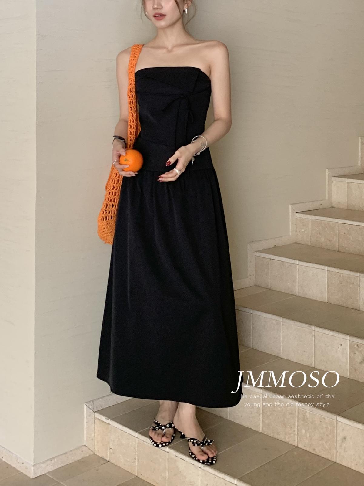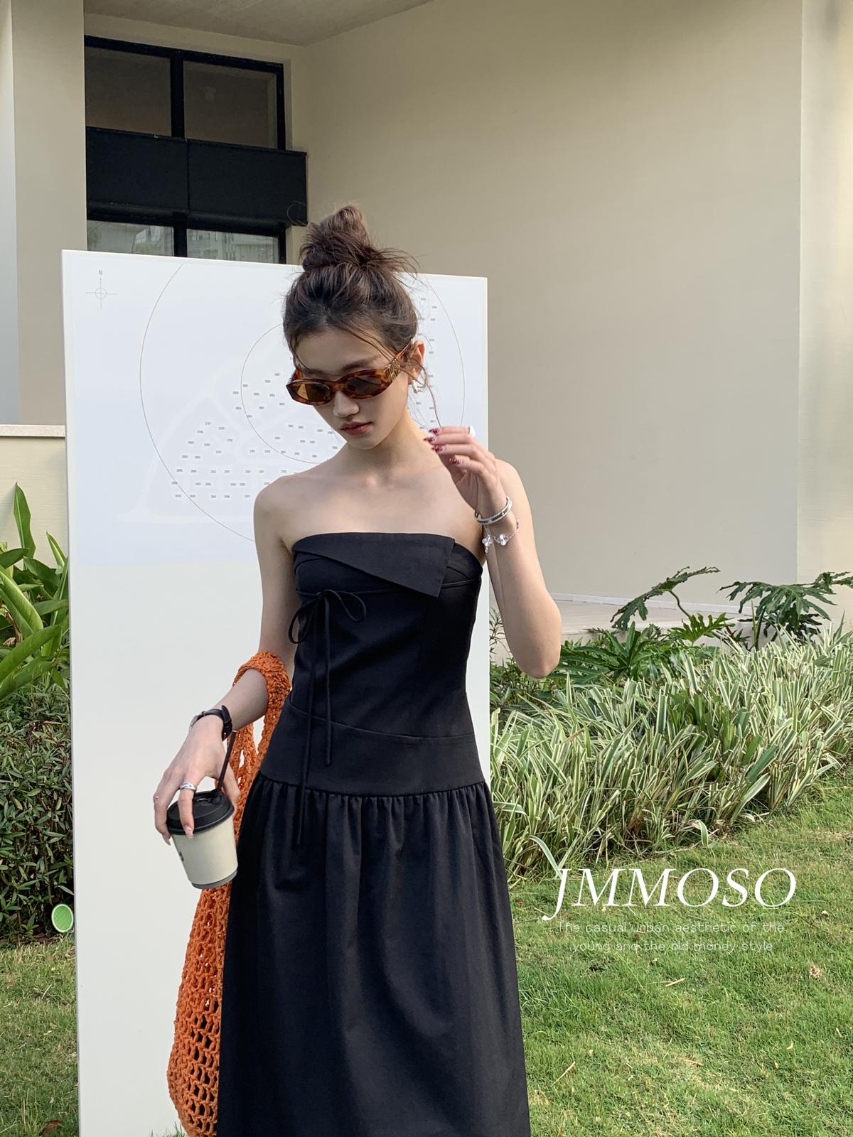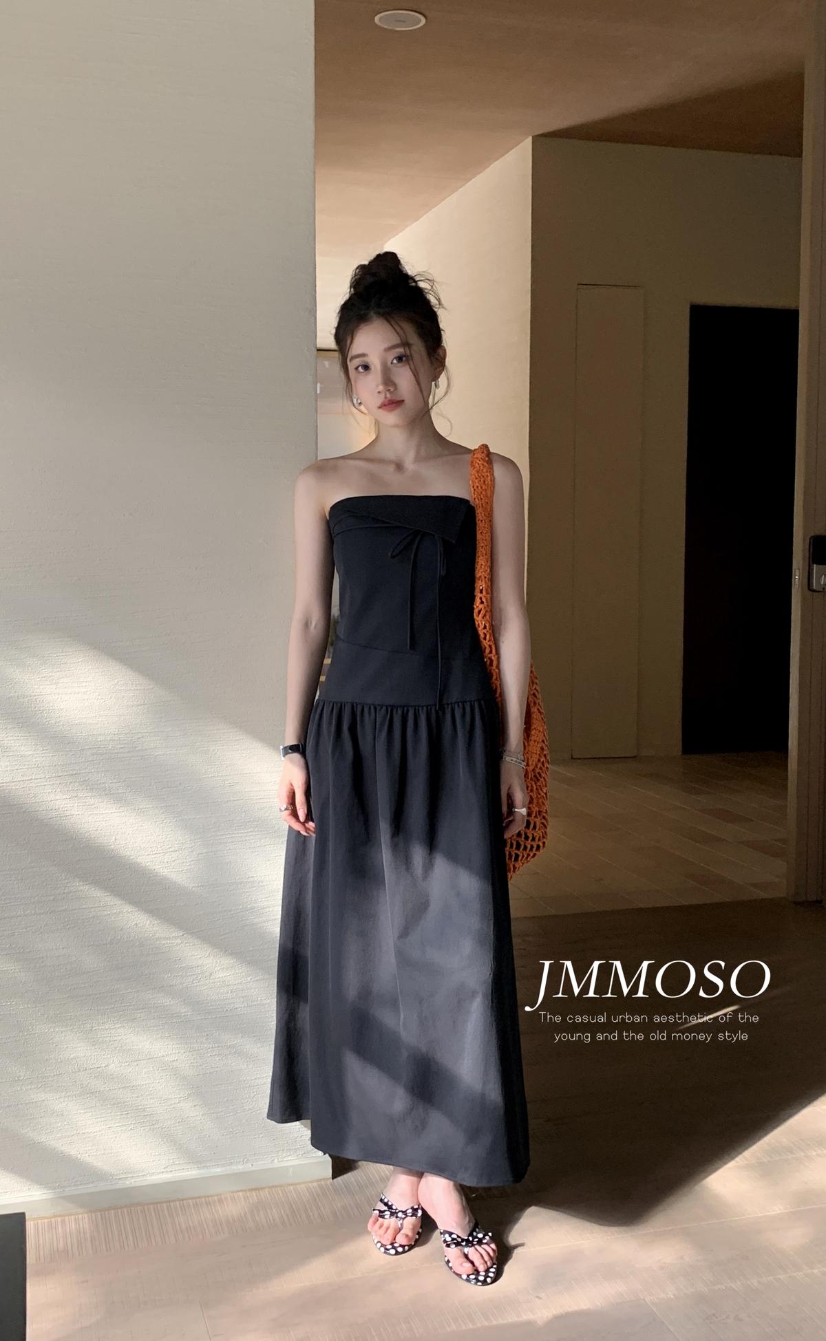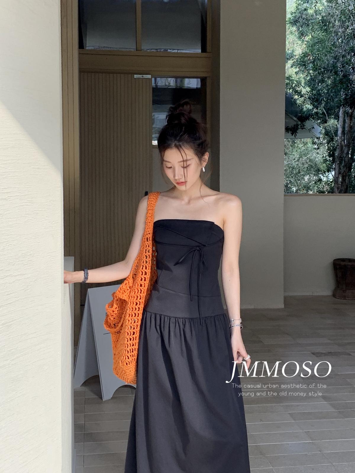 【C9002】清潭洞ins博主風舒適亞麻氣質翻領抹胸繫帶顯瘦連衣裙