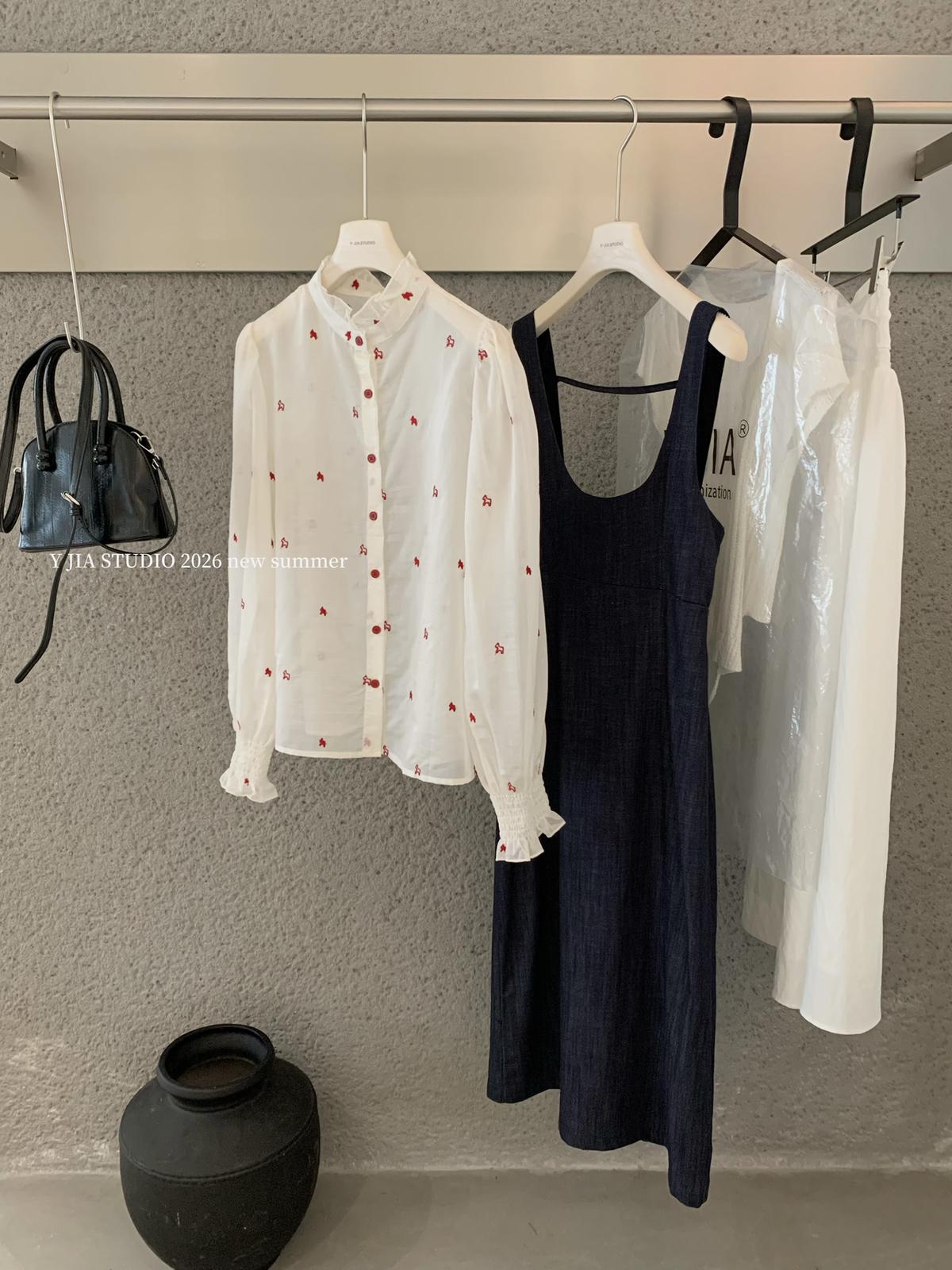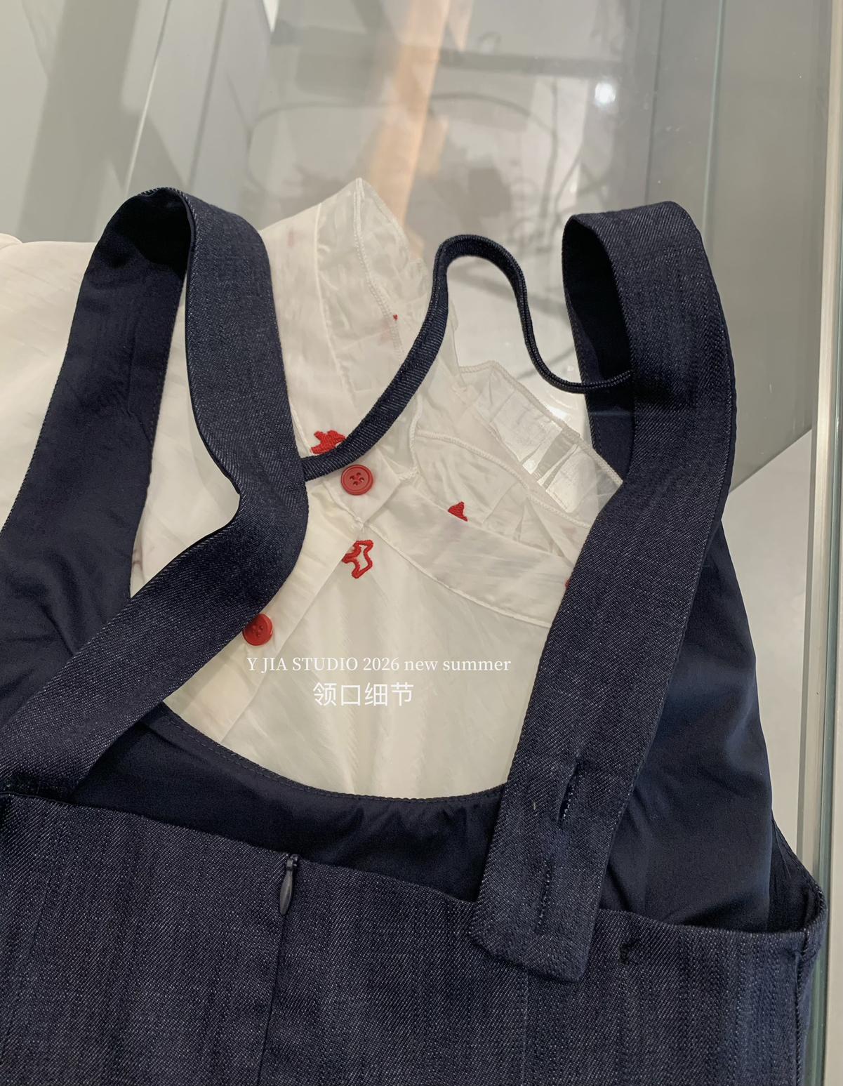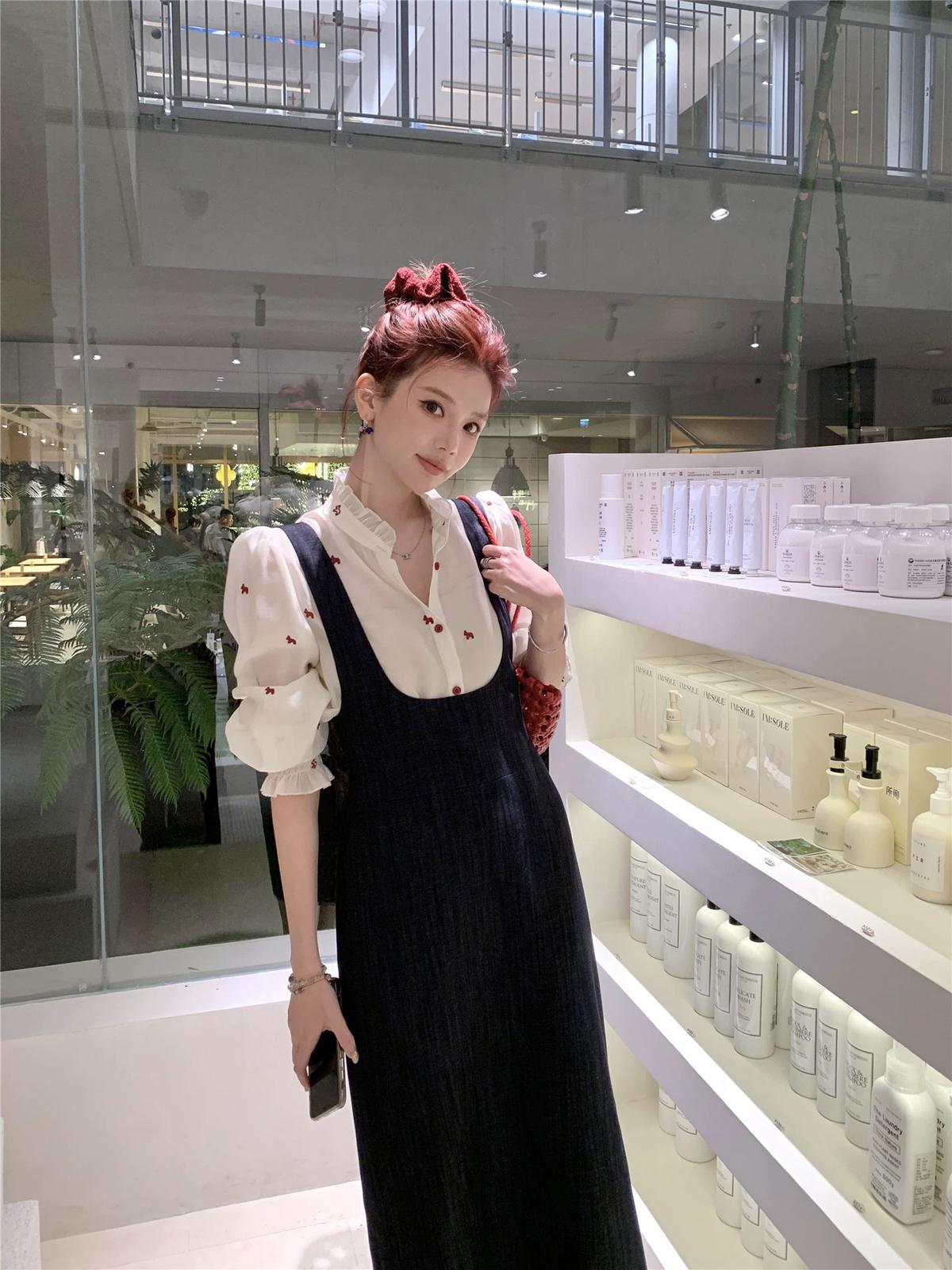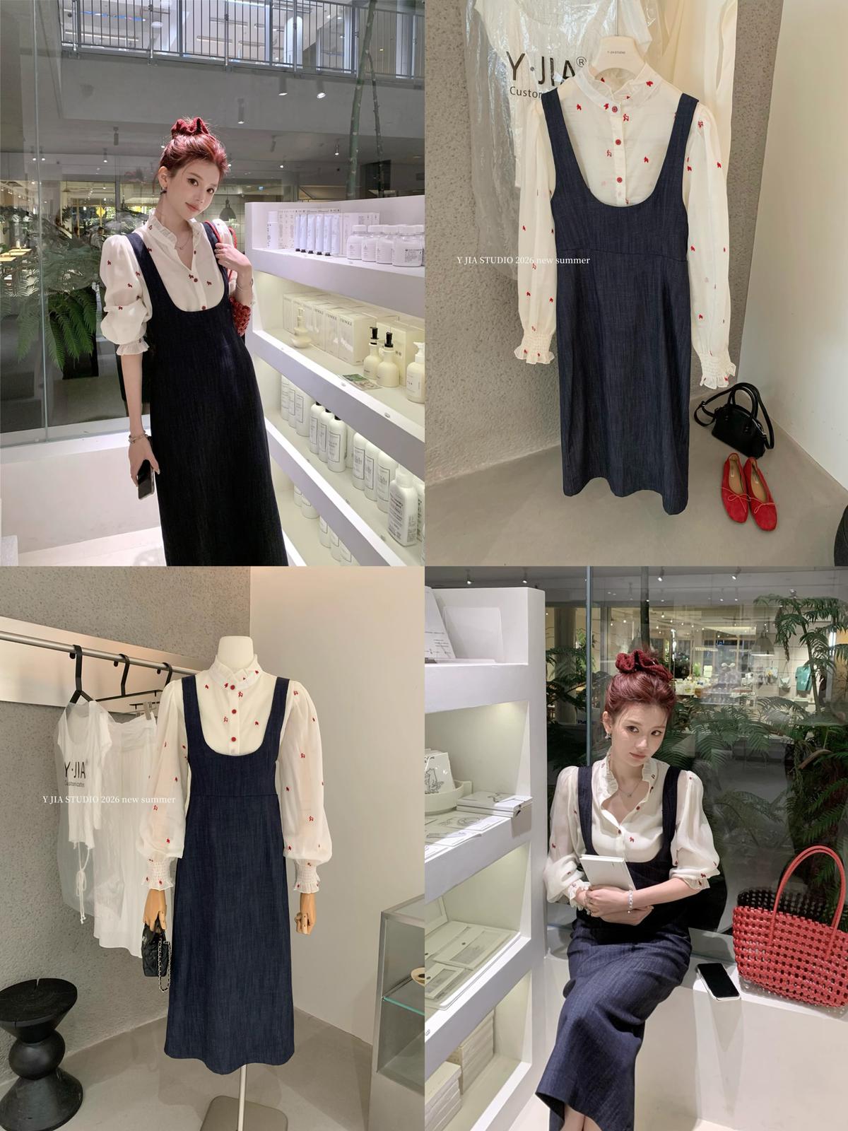 【C9037】木耳邊刺繡襯衫+小衆收腰揹帶裙兩件套套裝