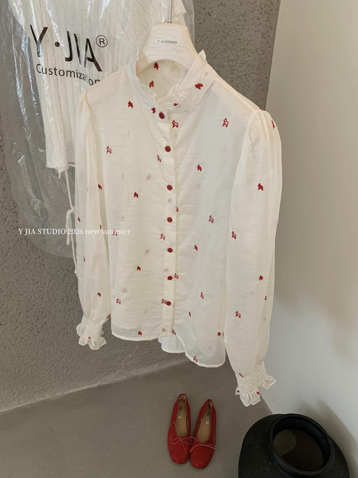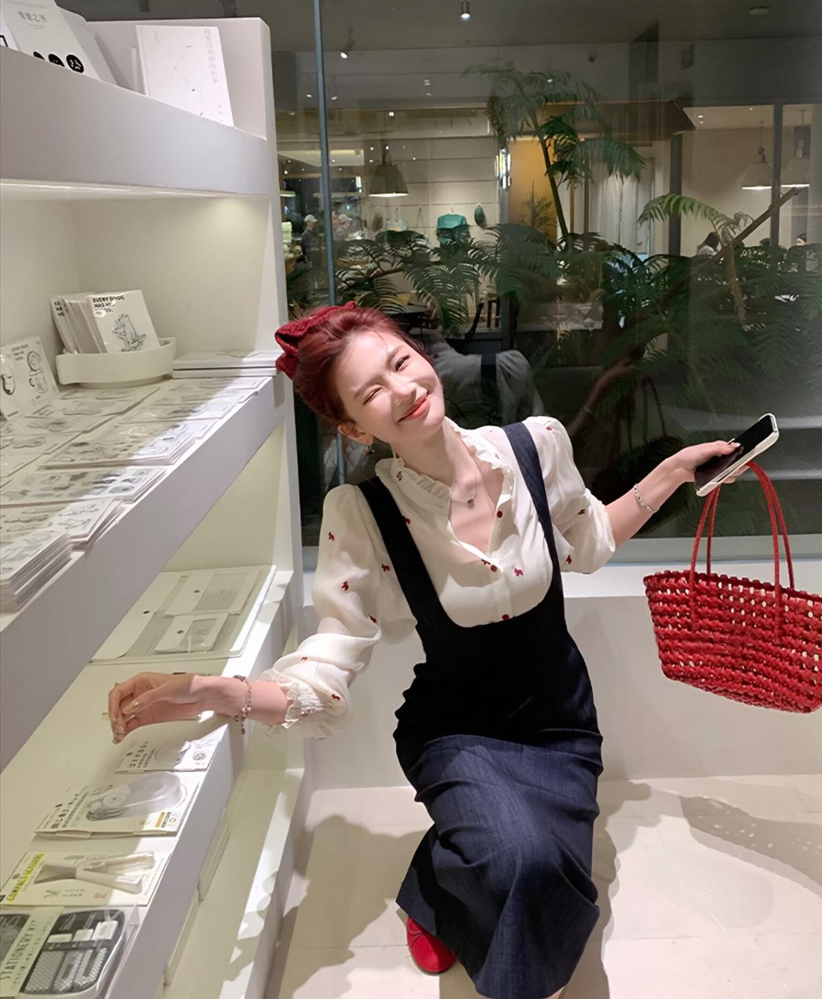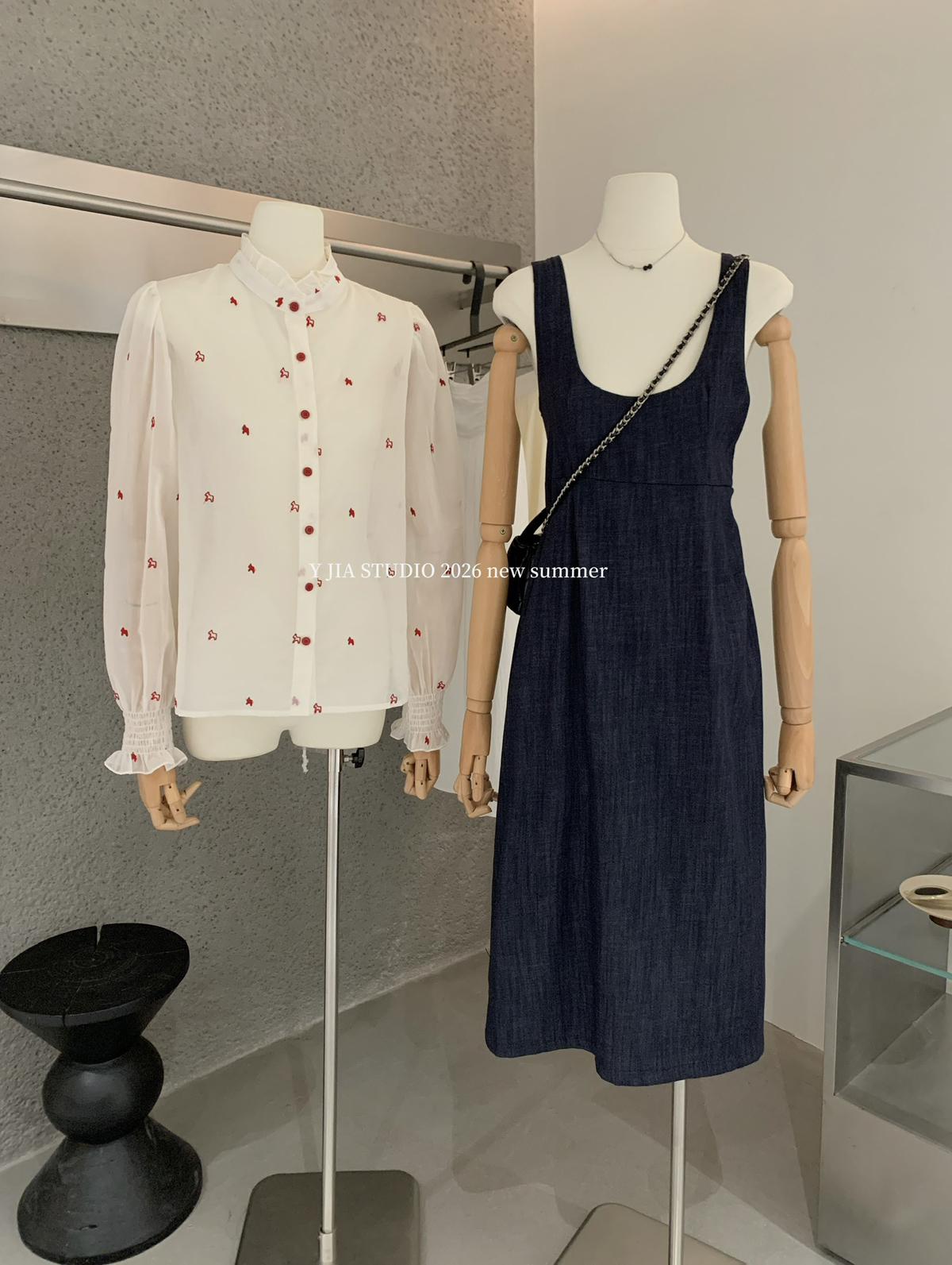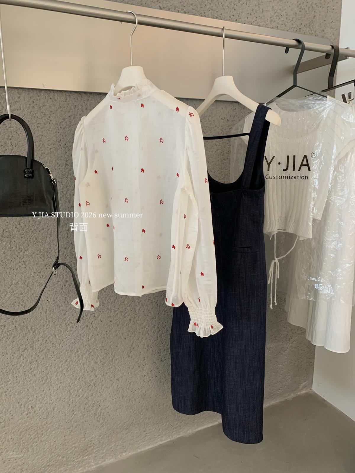 【C9037】木耳邊刺繡襯衫+小衆收腰揹帶裙兩件套套裝