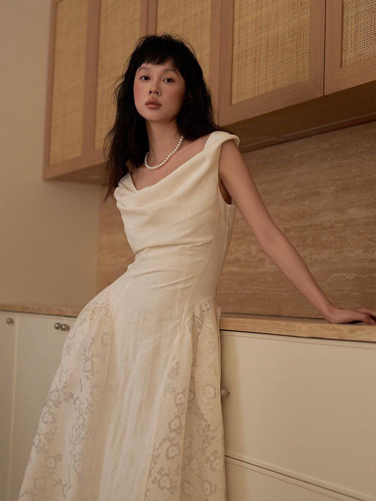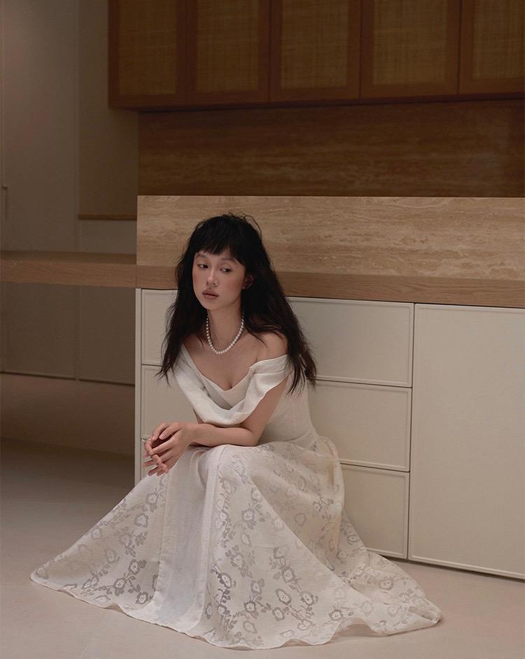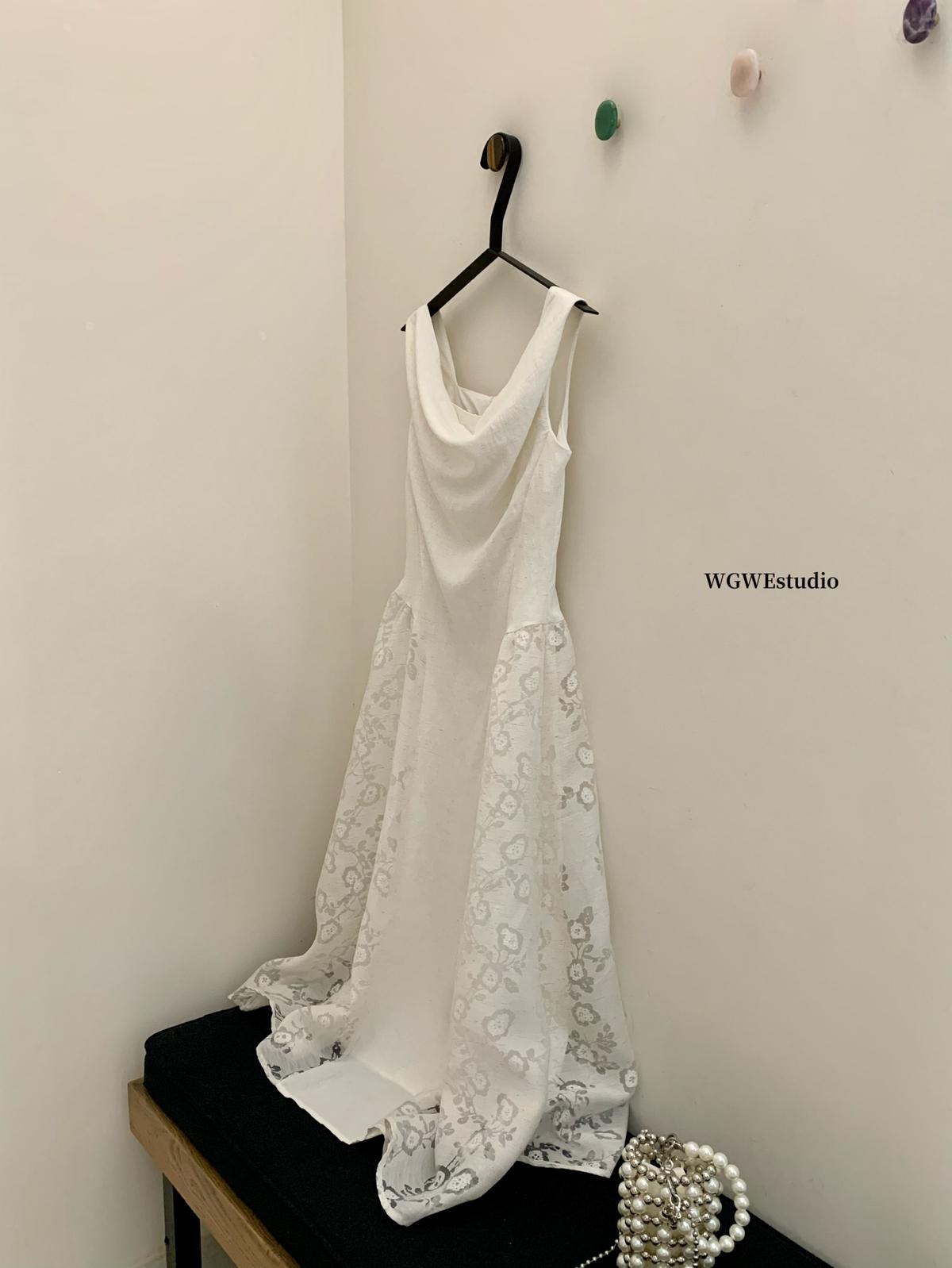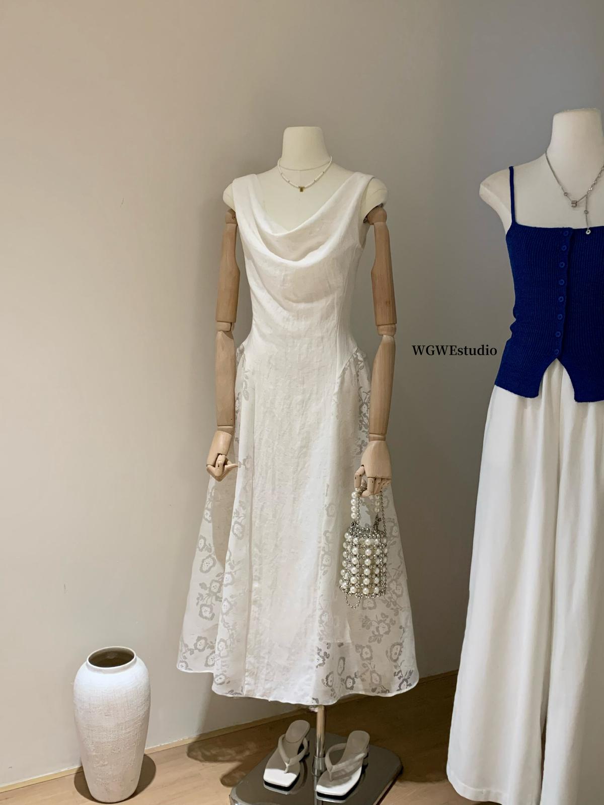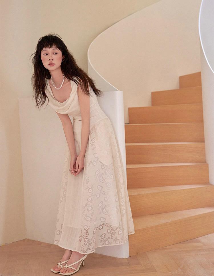 【C6446】2025年夏季白月光領證小白裙子復古小衆蕩領蕾連衣裙