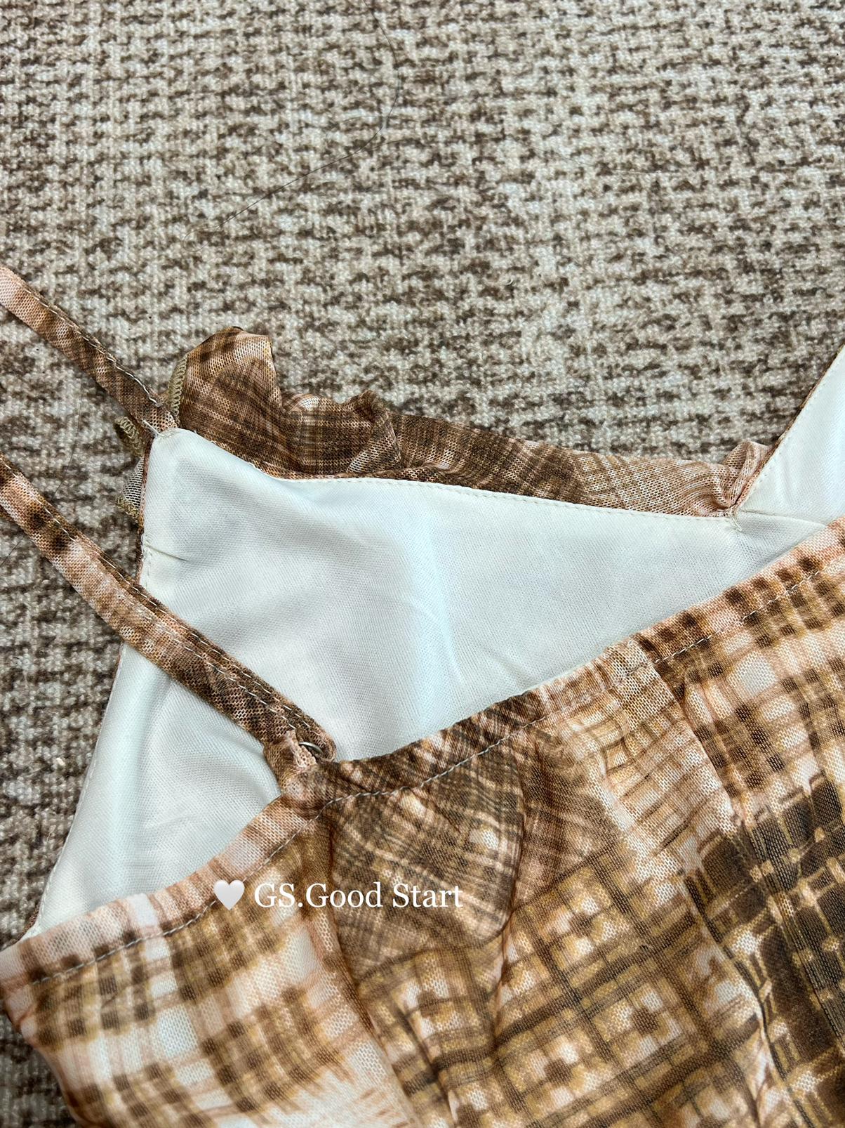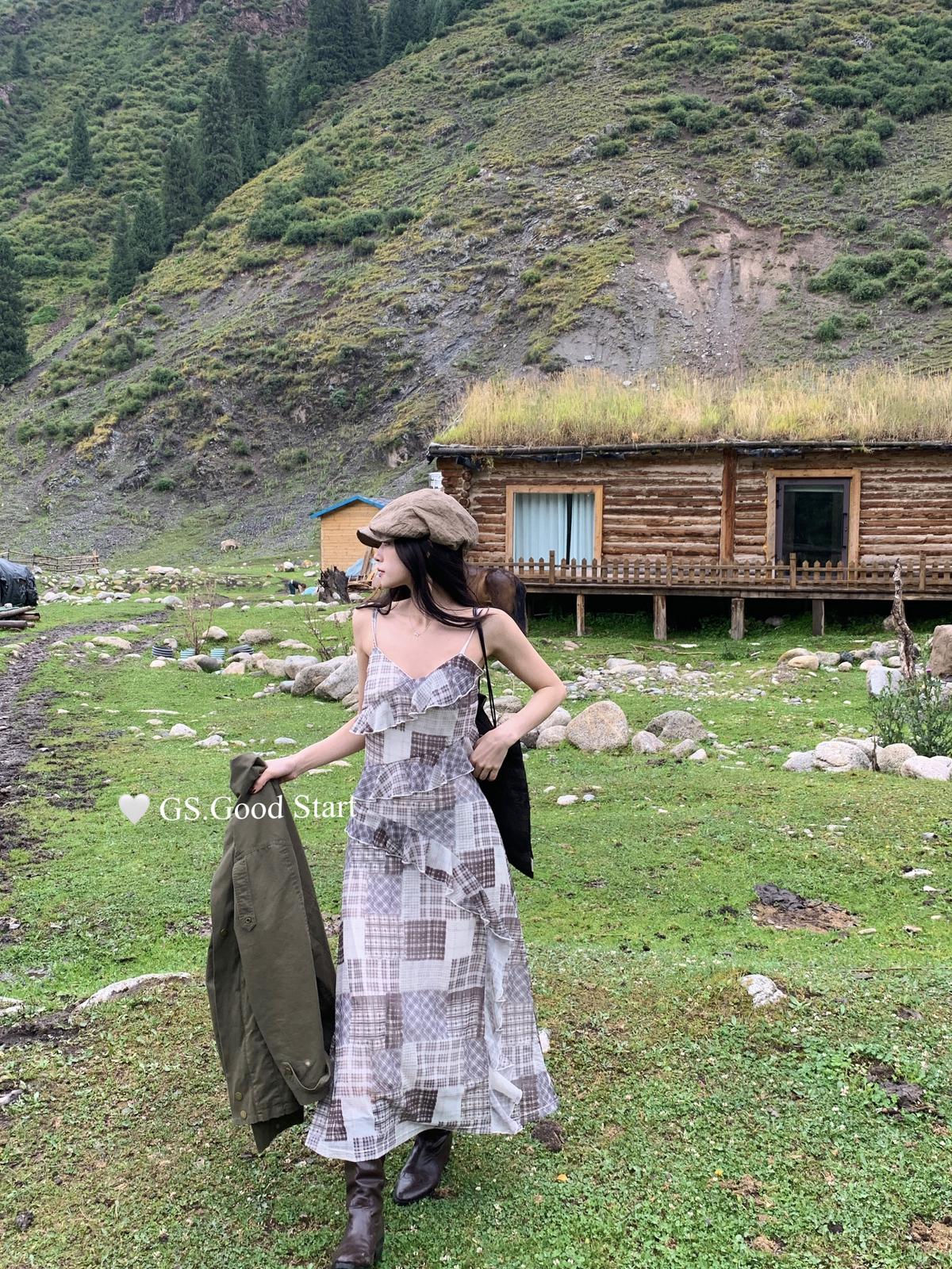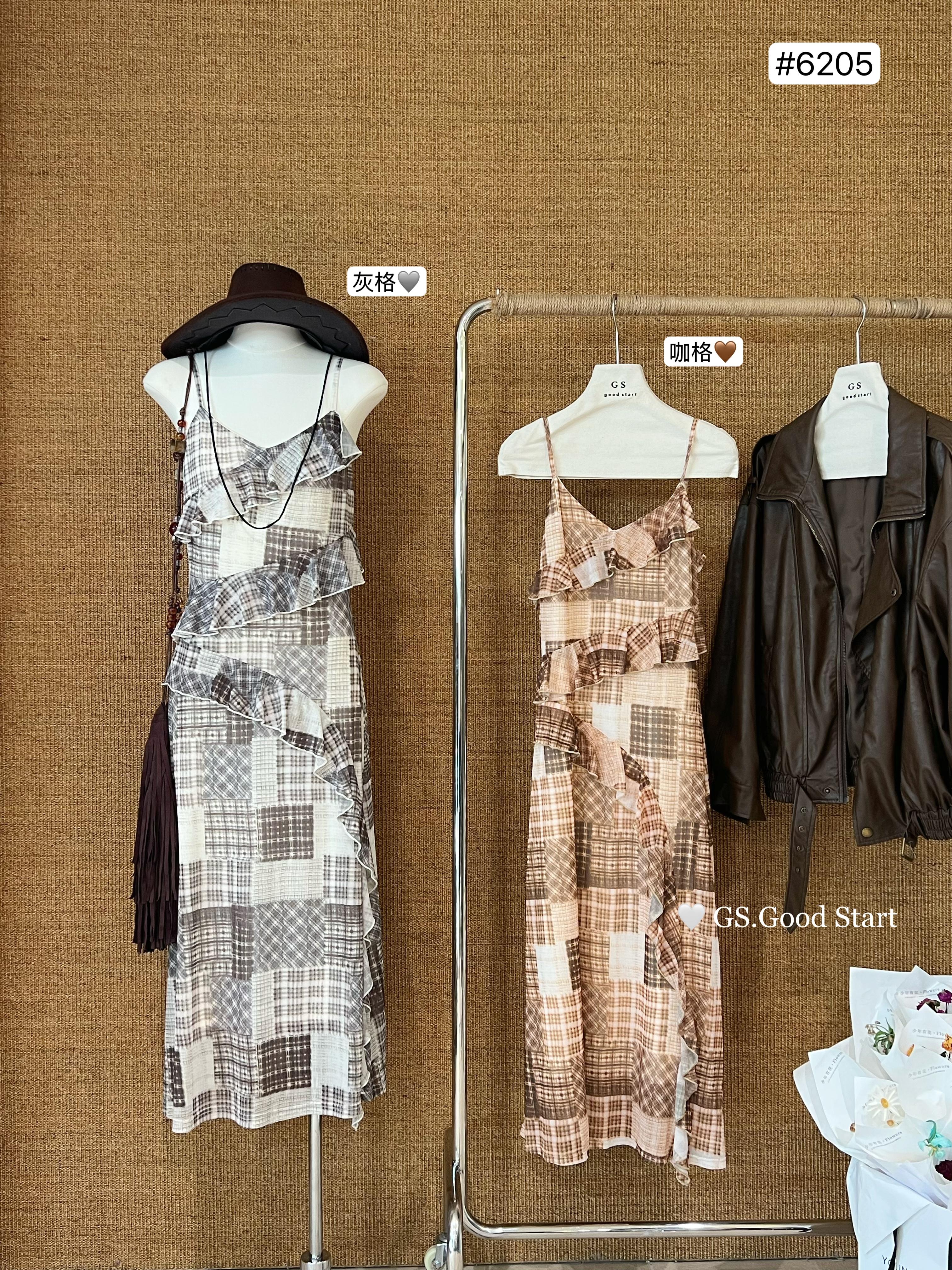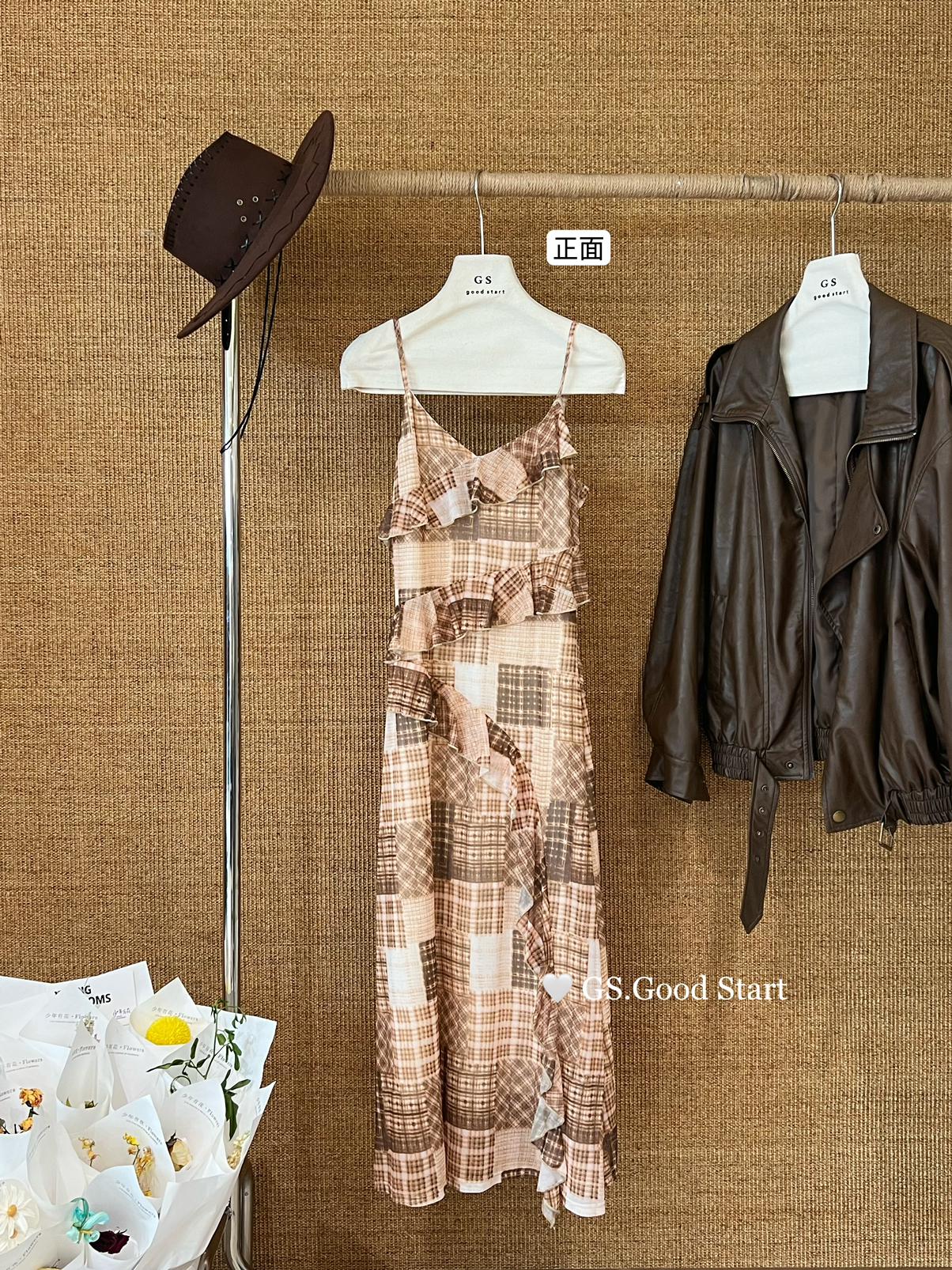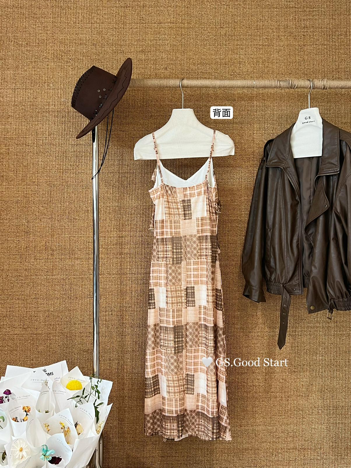 【C6577】自由流浪風~超有feel!秋上新時髦設計感格紋吊帶連衣裙