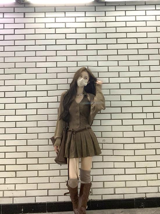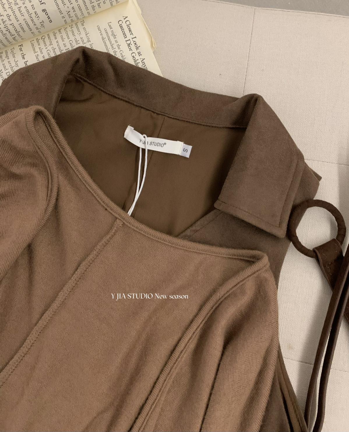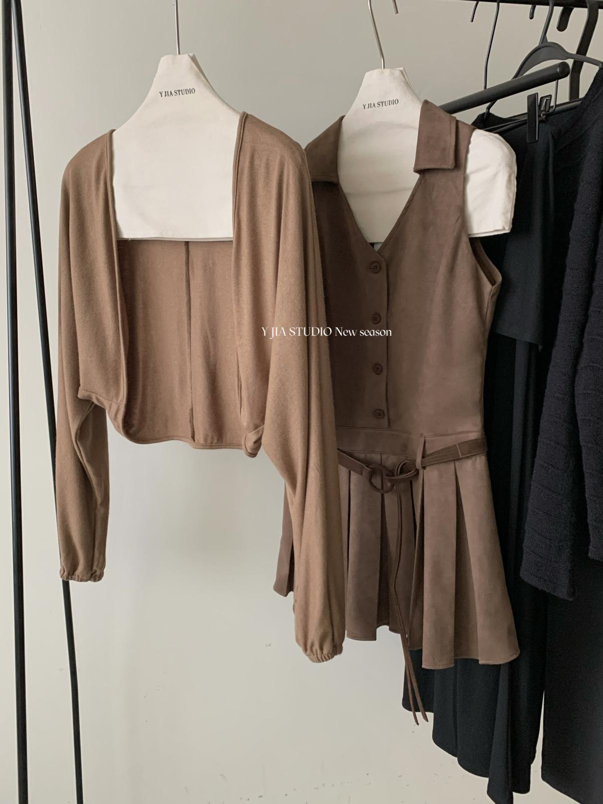 3. 【C7350】焦糖摩卡麂皮掛脖百褶顯瘦連衣裙+簡約百搭針織開衫套裝(配腰帶)