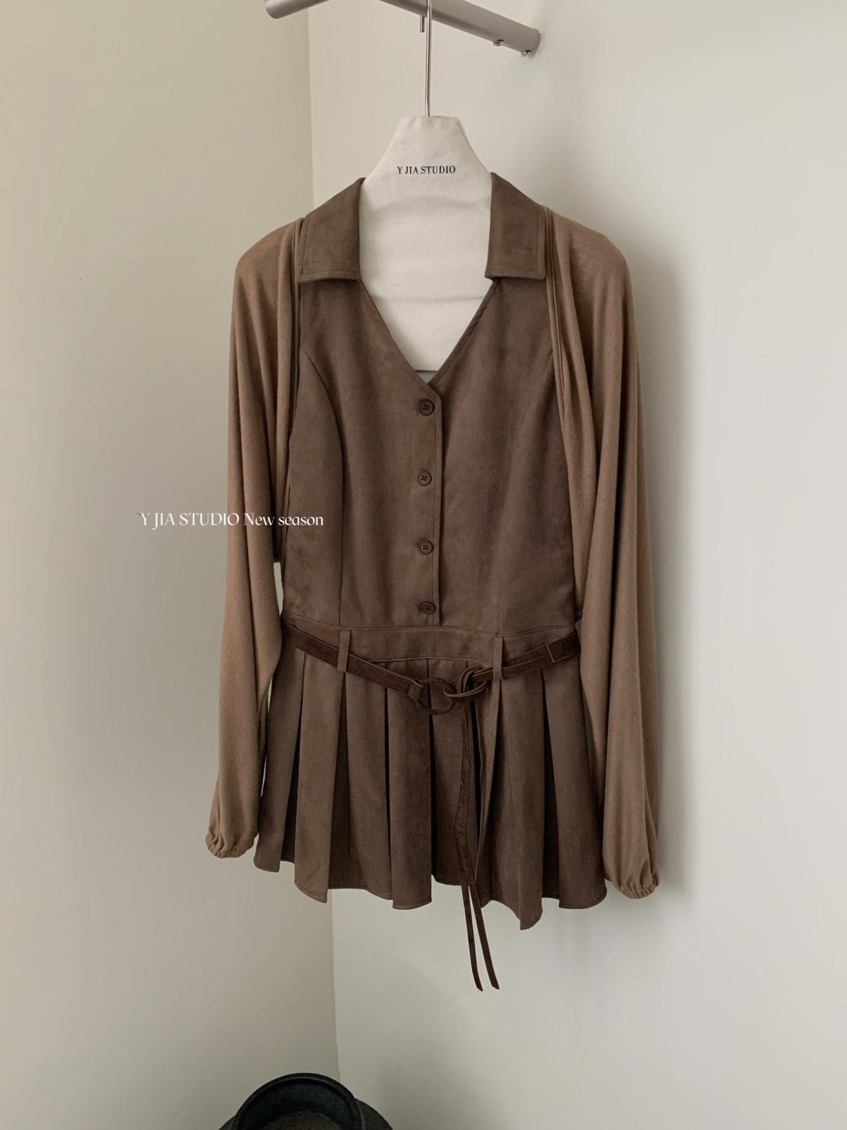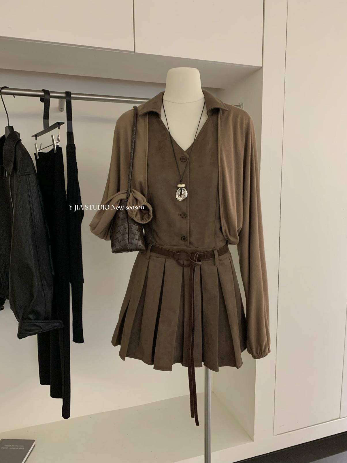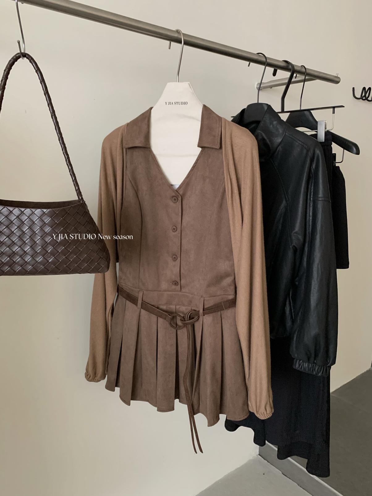 【C7350】焦糖摩卡麂皮掛脖百褶顯瘦連衣裙+簡約百搭針織開衫套裝(配腰帶)