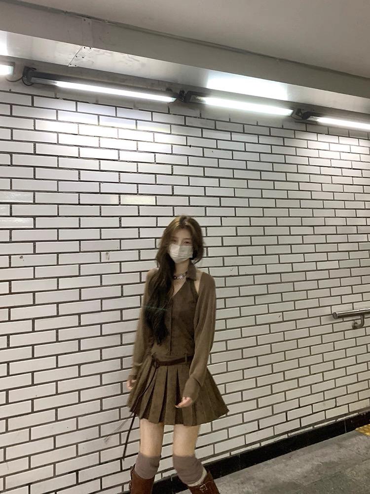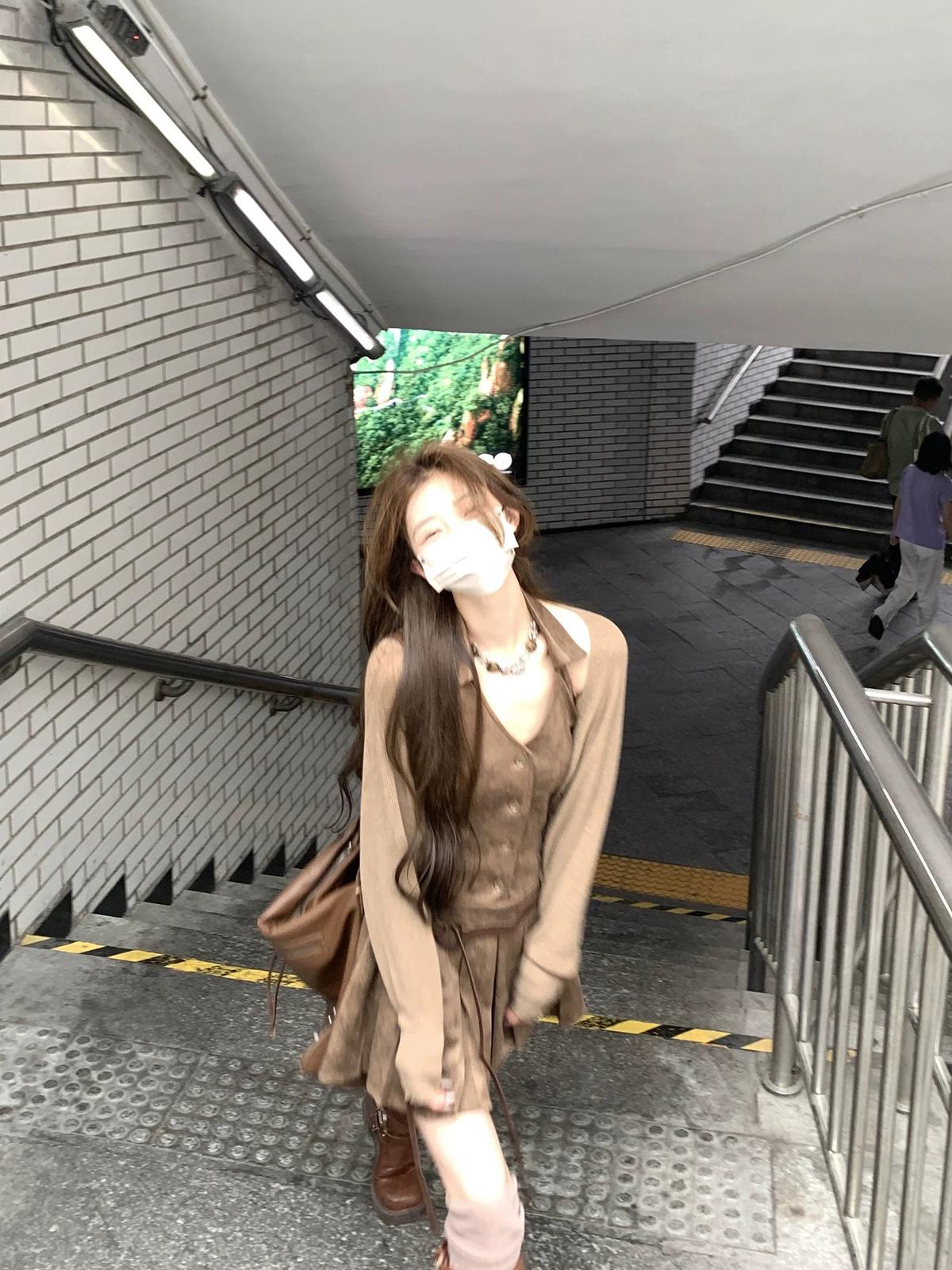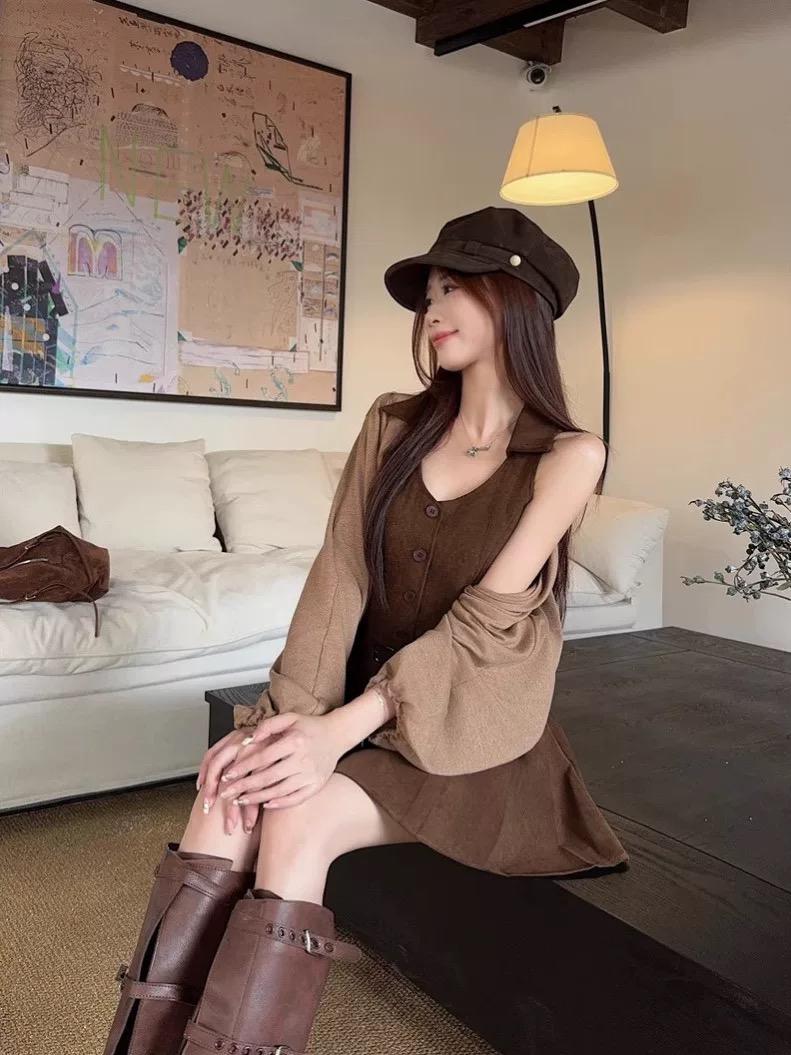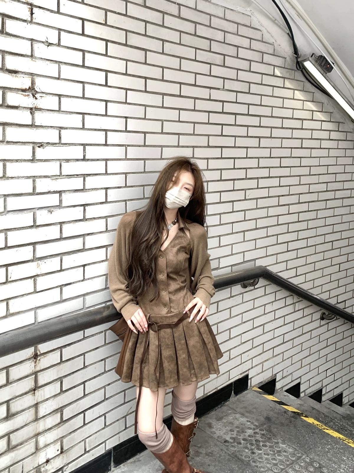 【C7350】焦糖摩卡麂皮掛脖百褶顯瘦連衣裙+簡約百搭針織開衫套裝(配腰帶)