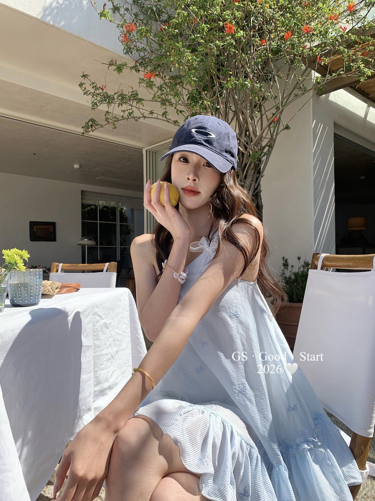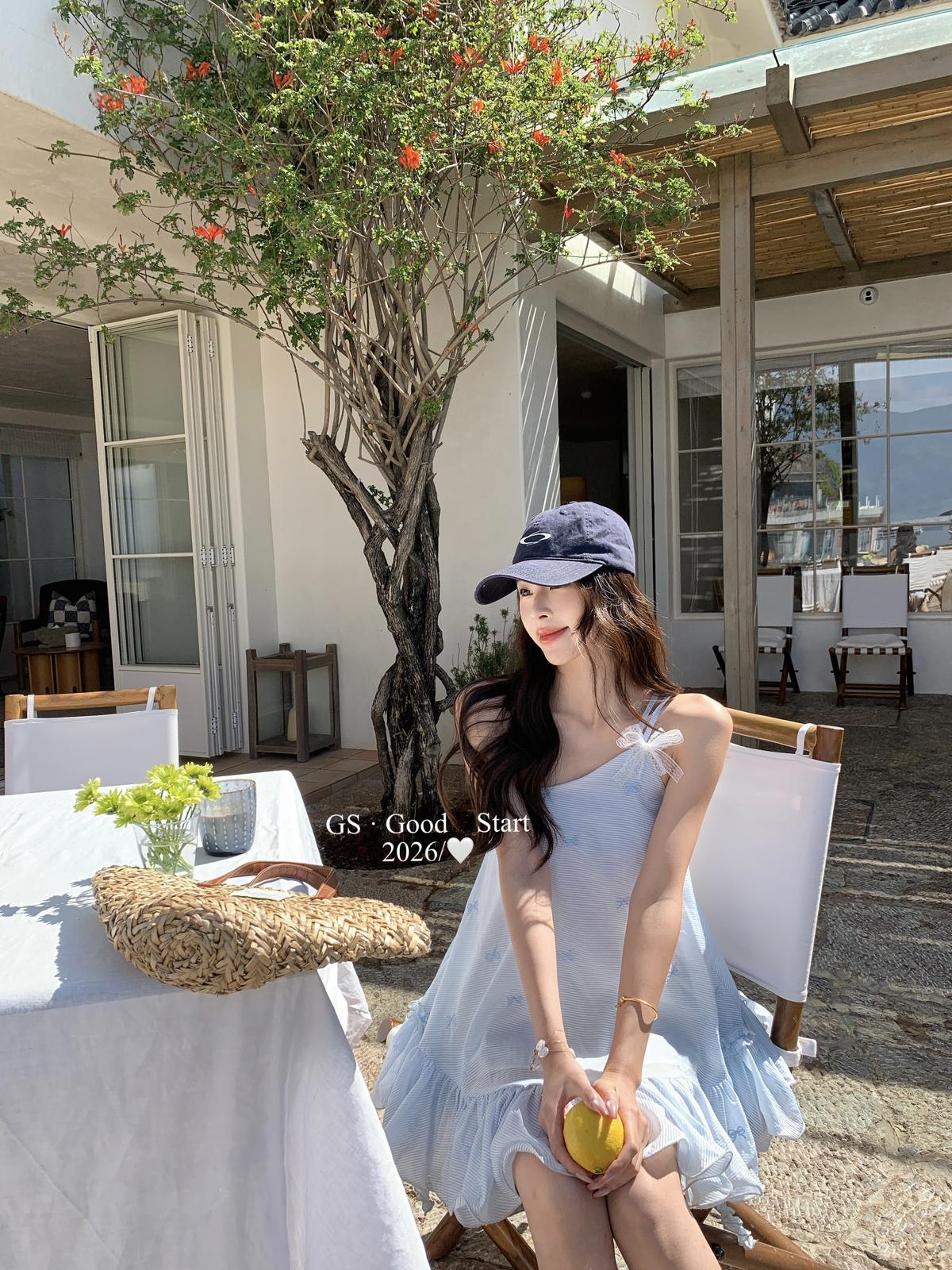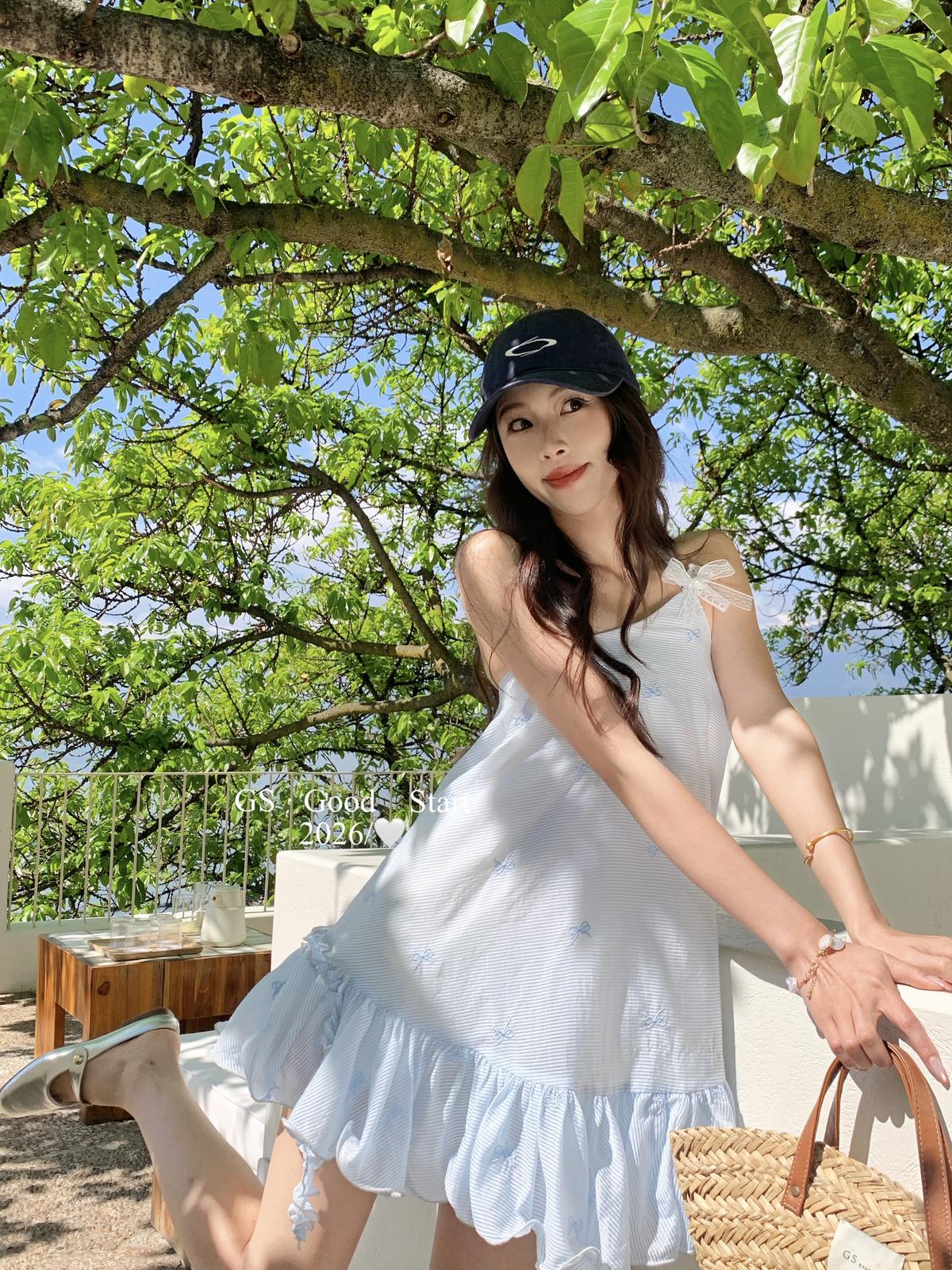 3. 【C9128】心動蝴蝶結*倍好看!嬌俏女友感up_夏甜美條紋刺繡設計感斜肩連衣裙
