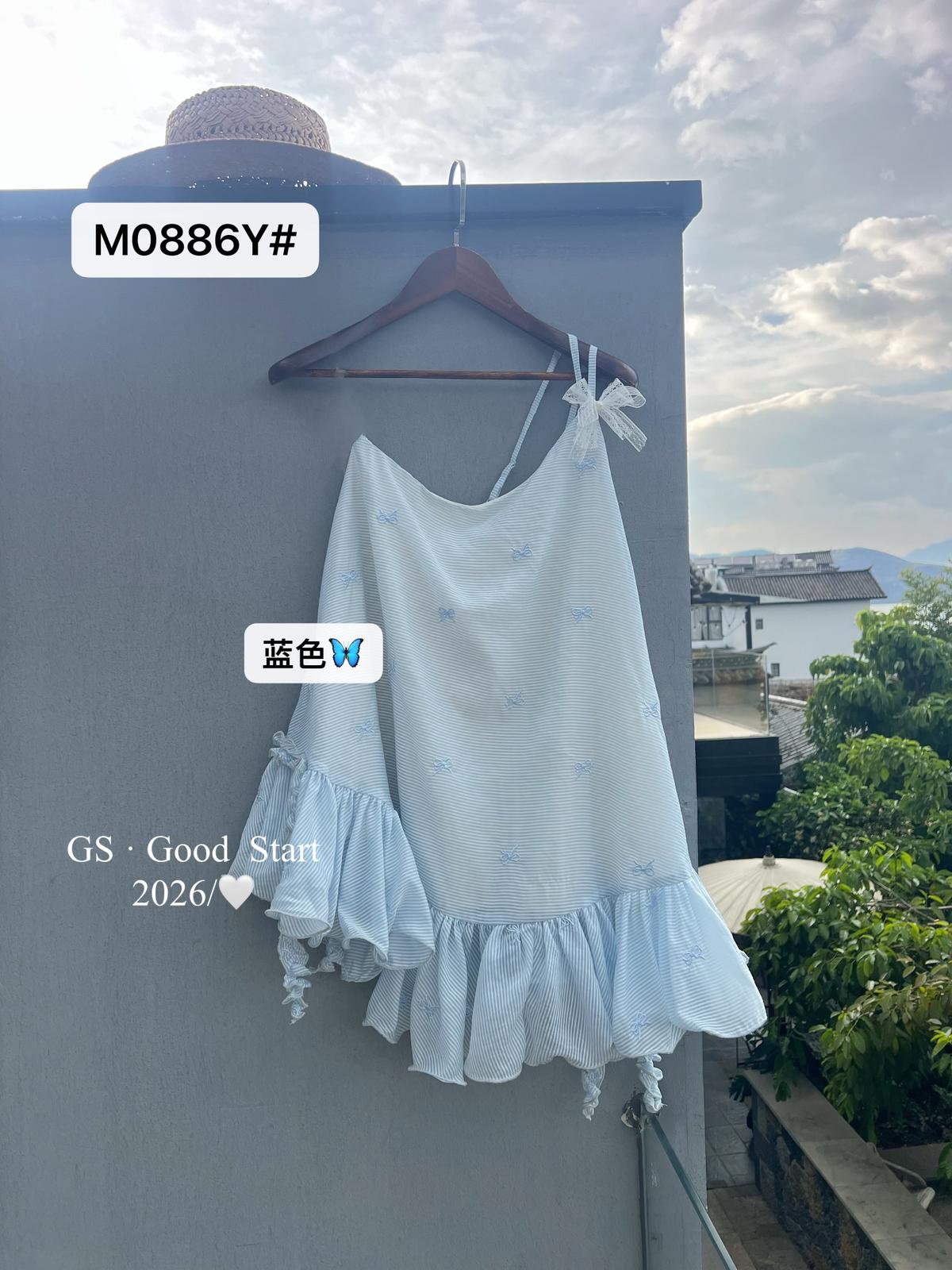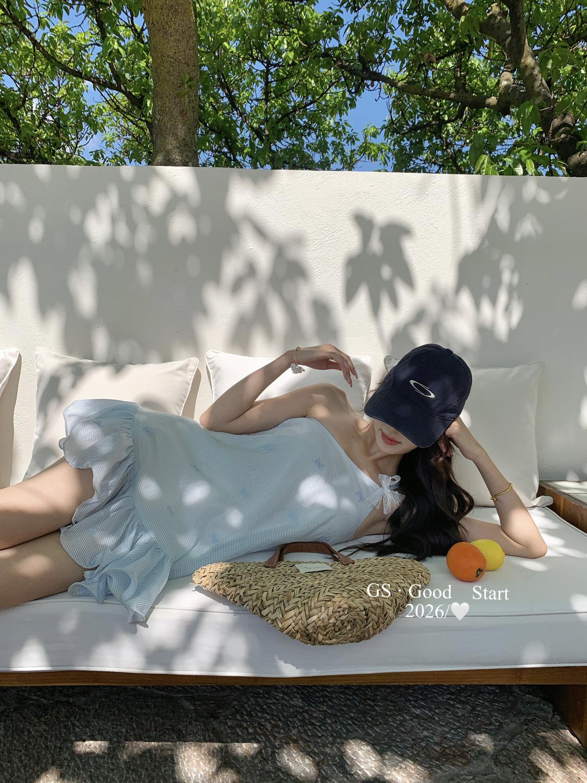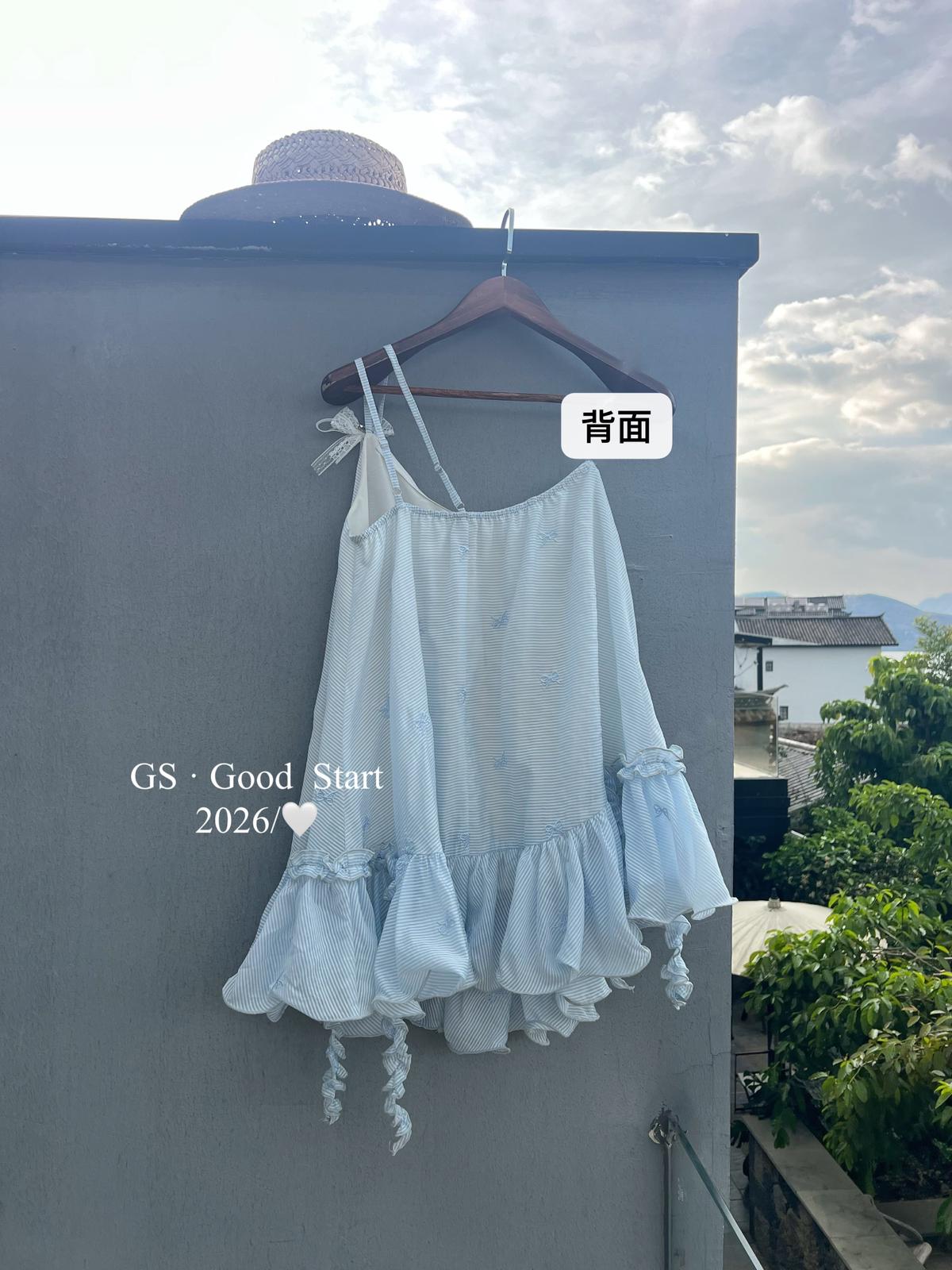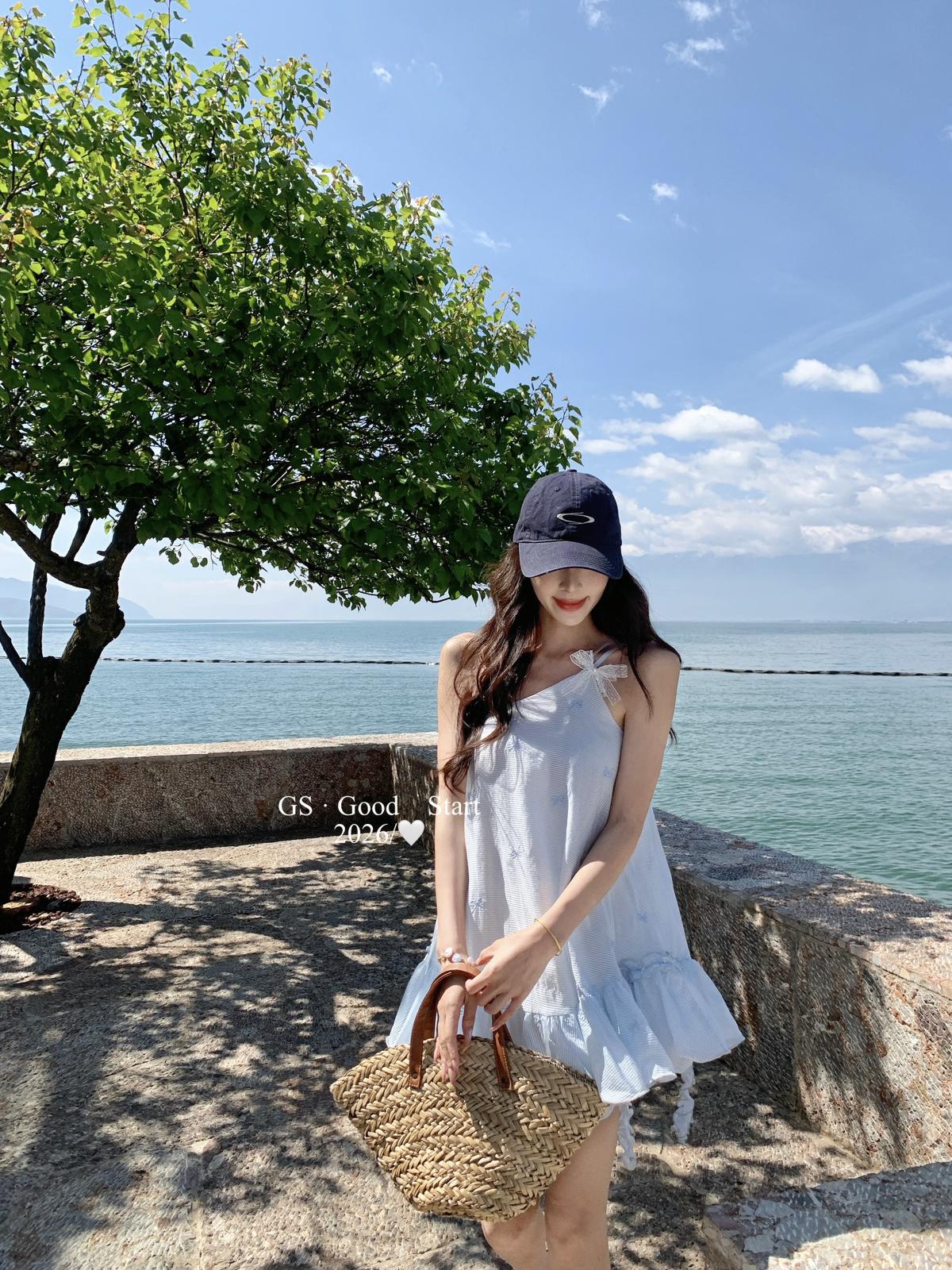 3. 【C9128】心動蝴蝶結*倍好看!嬌俏女友感up_夏甜美條紋刺繡設計感斜肩連衣裙