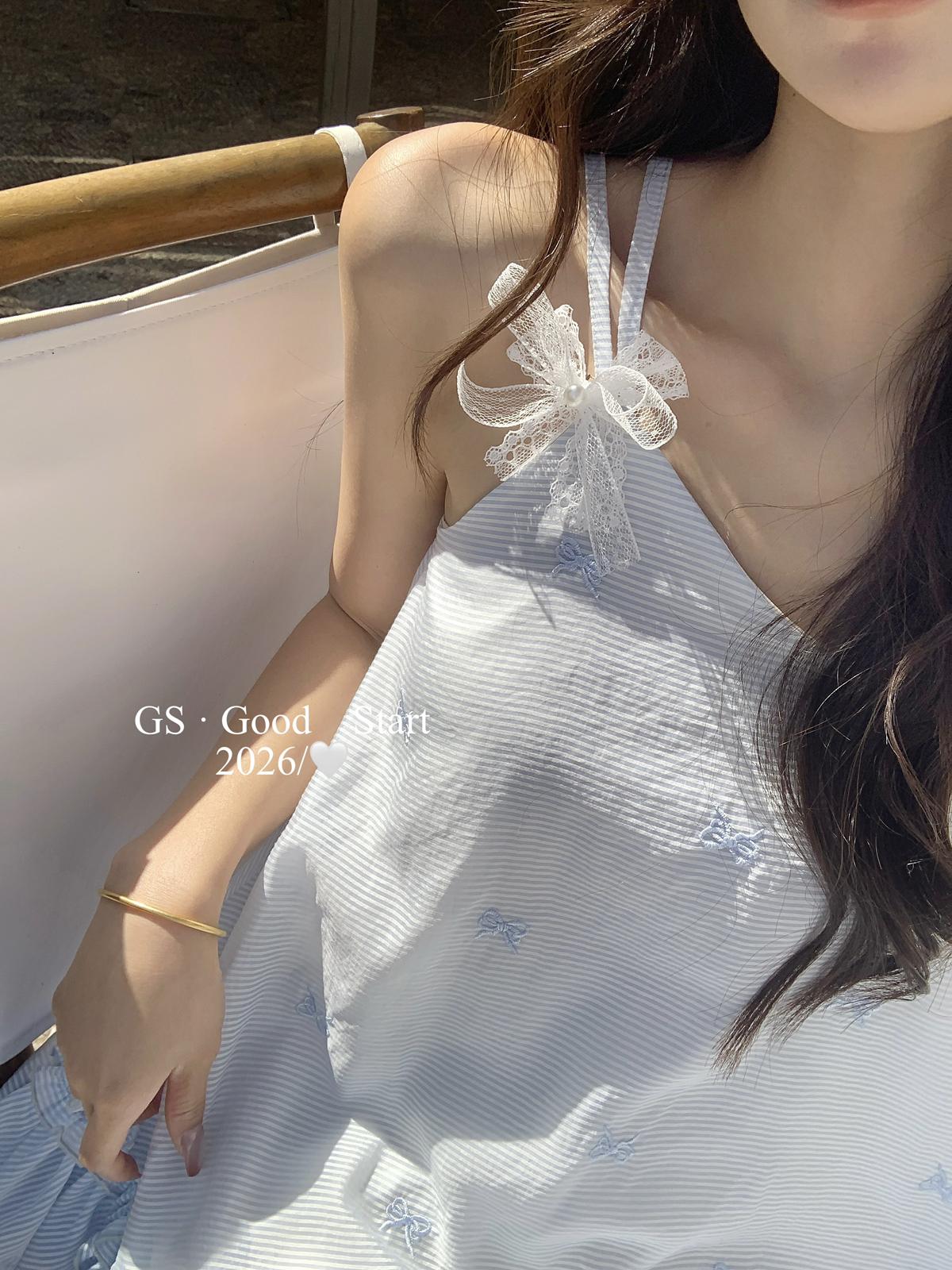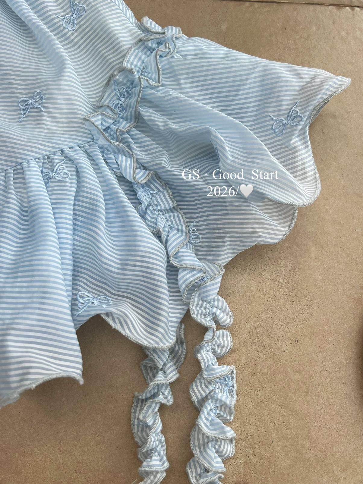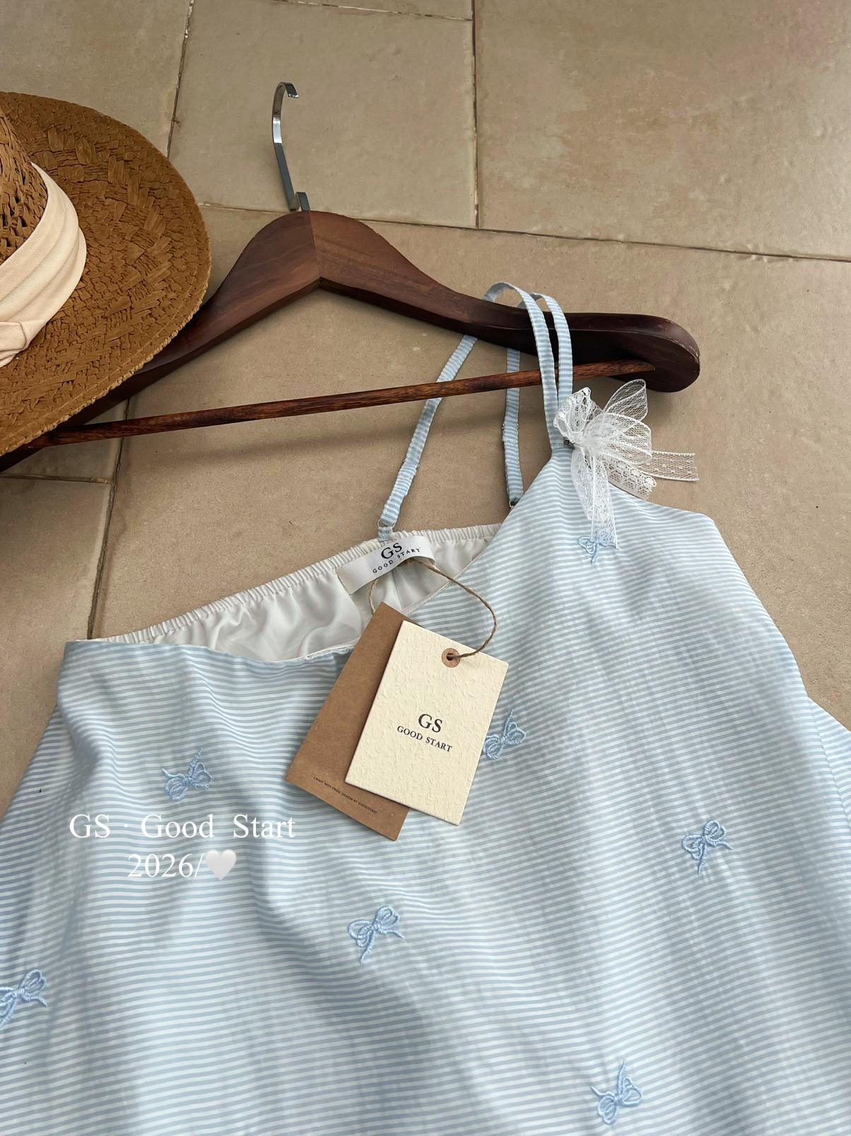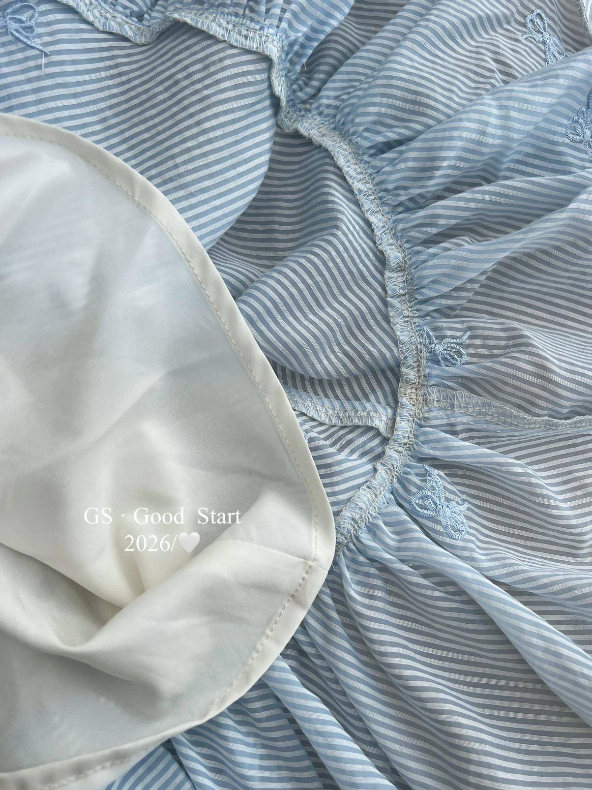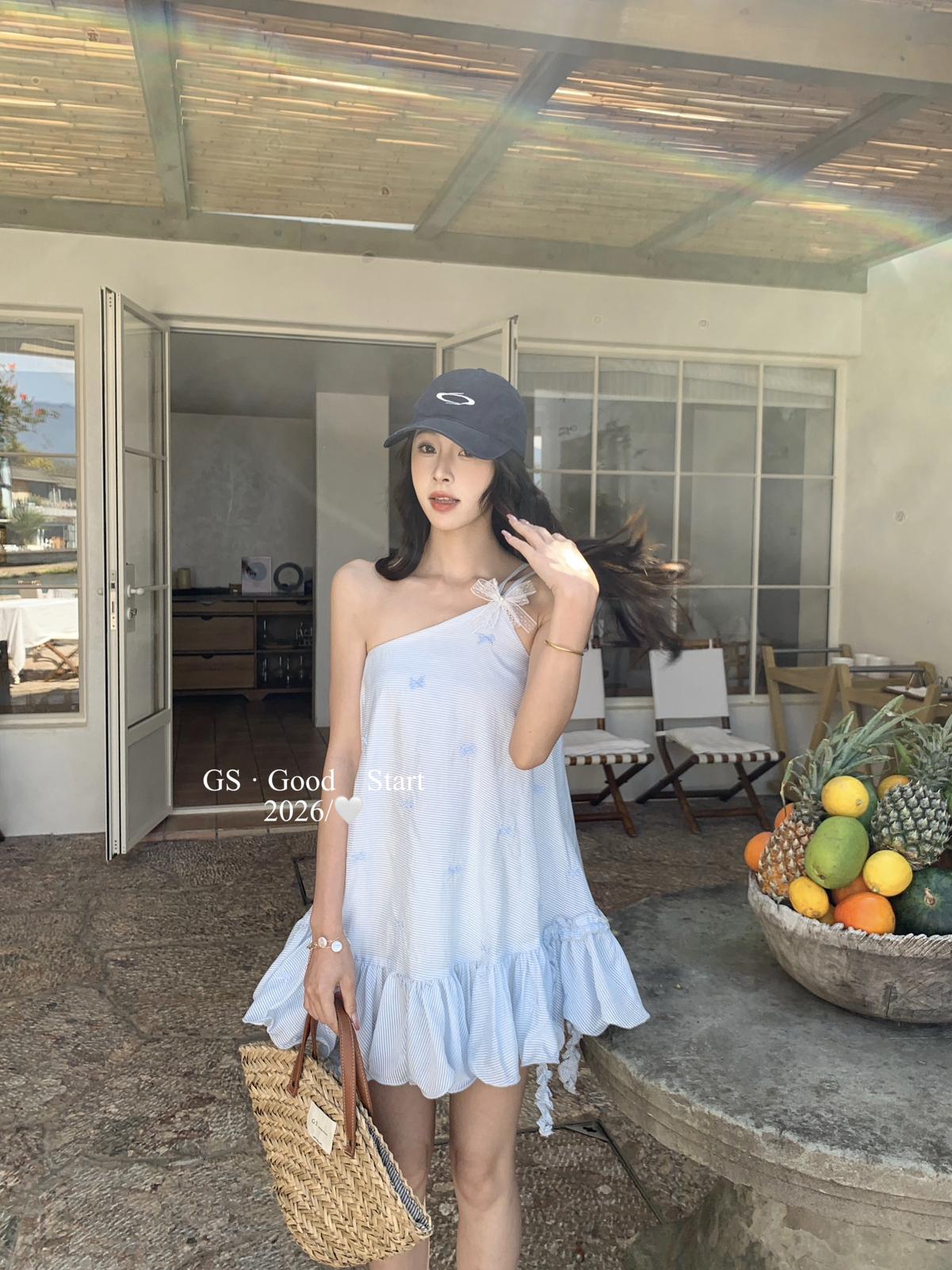 【C9128】心動蝴蝶結*倍好看!嬌俏女友感up_夏甜美條紋刺繡設計感斜肩連衣裙