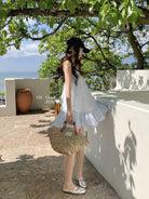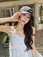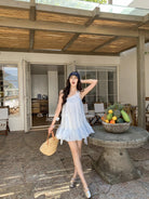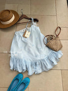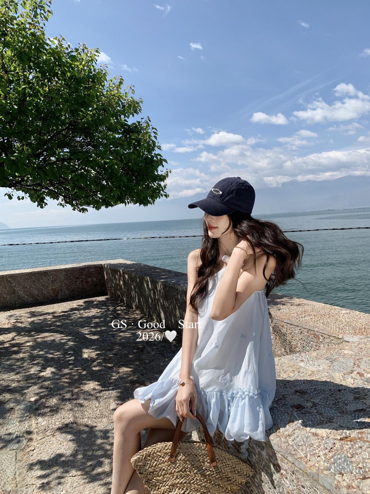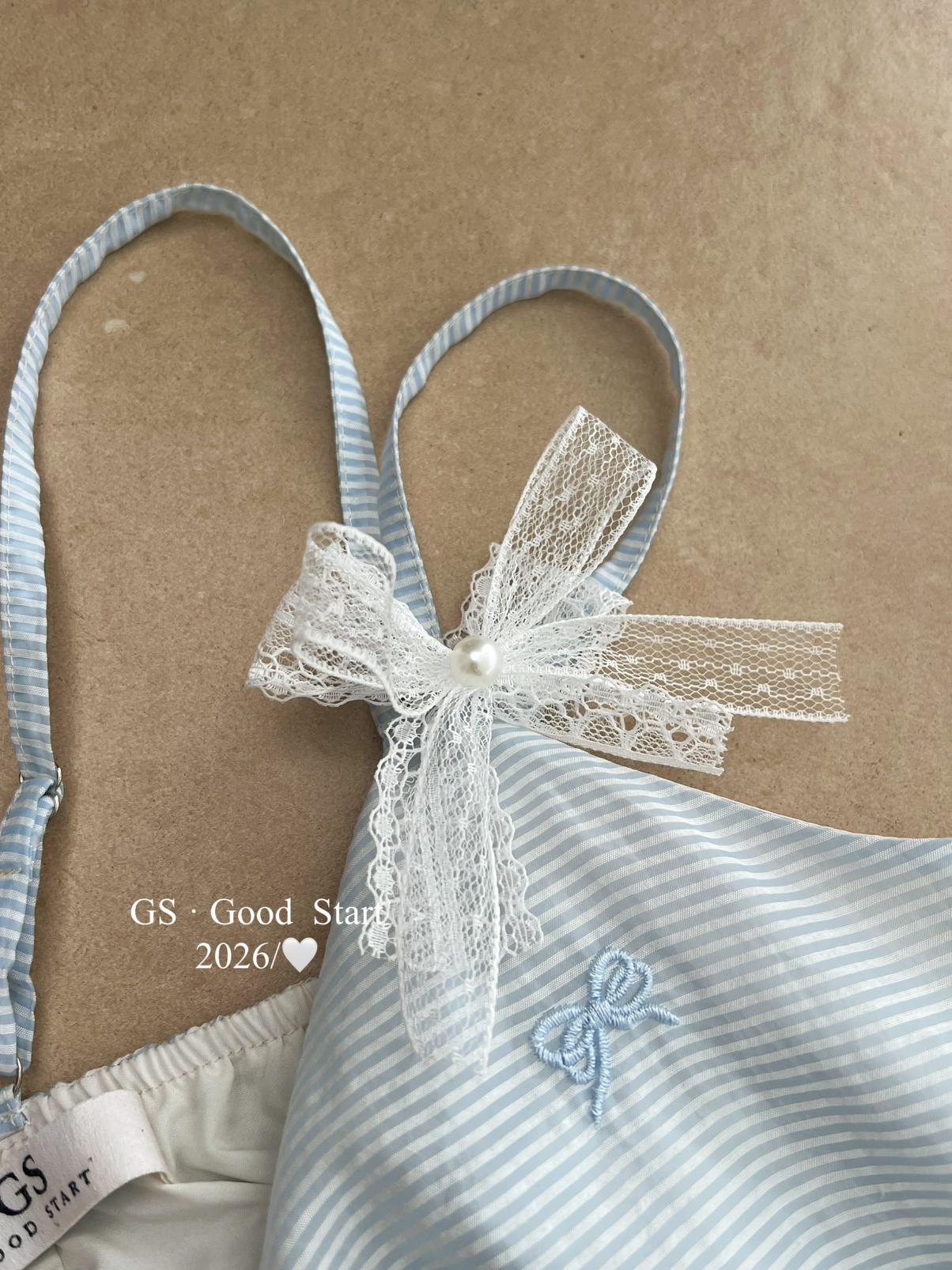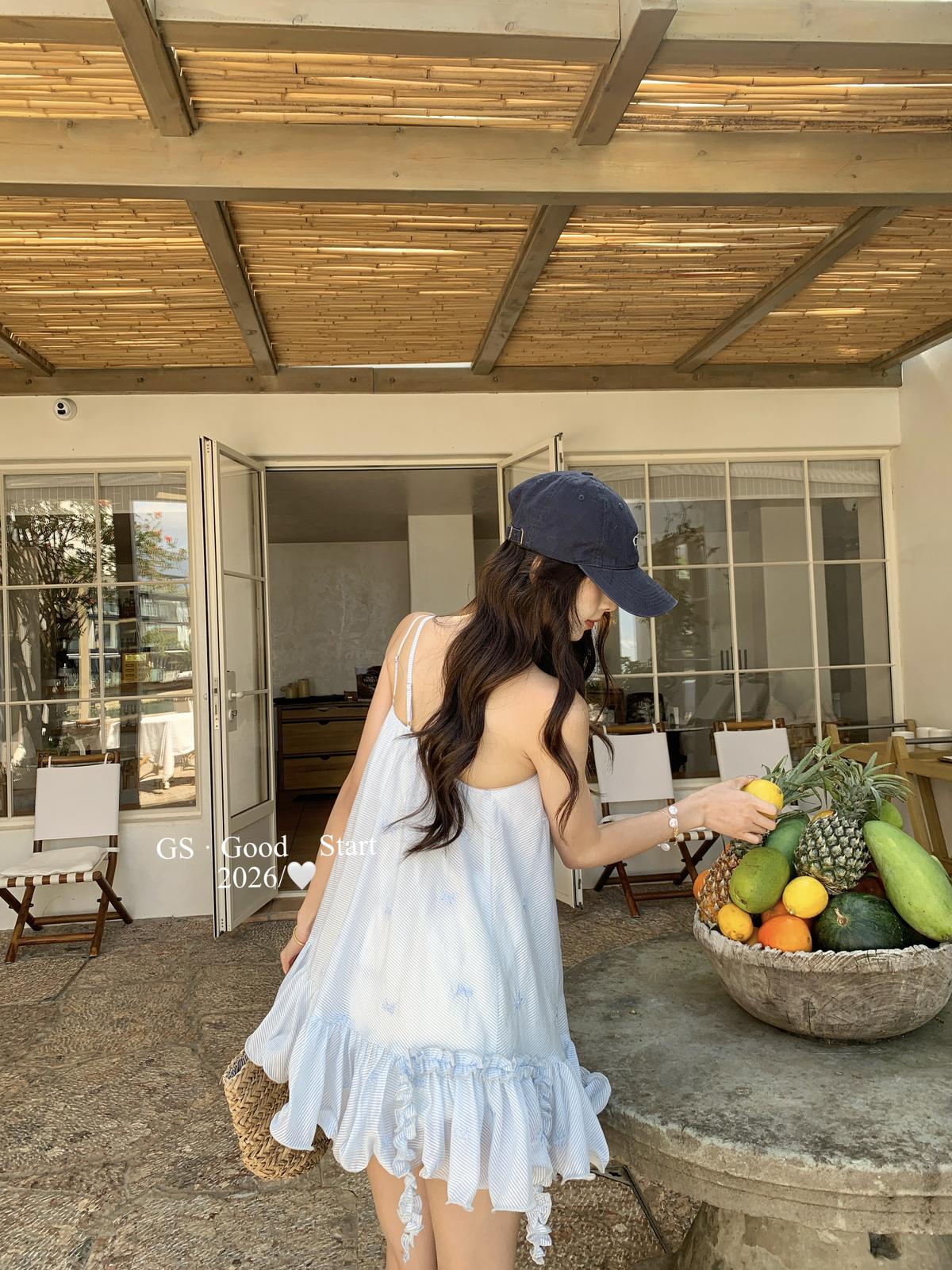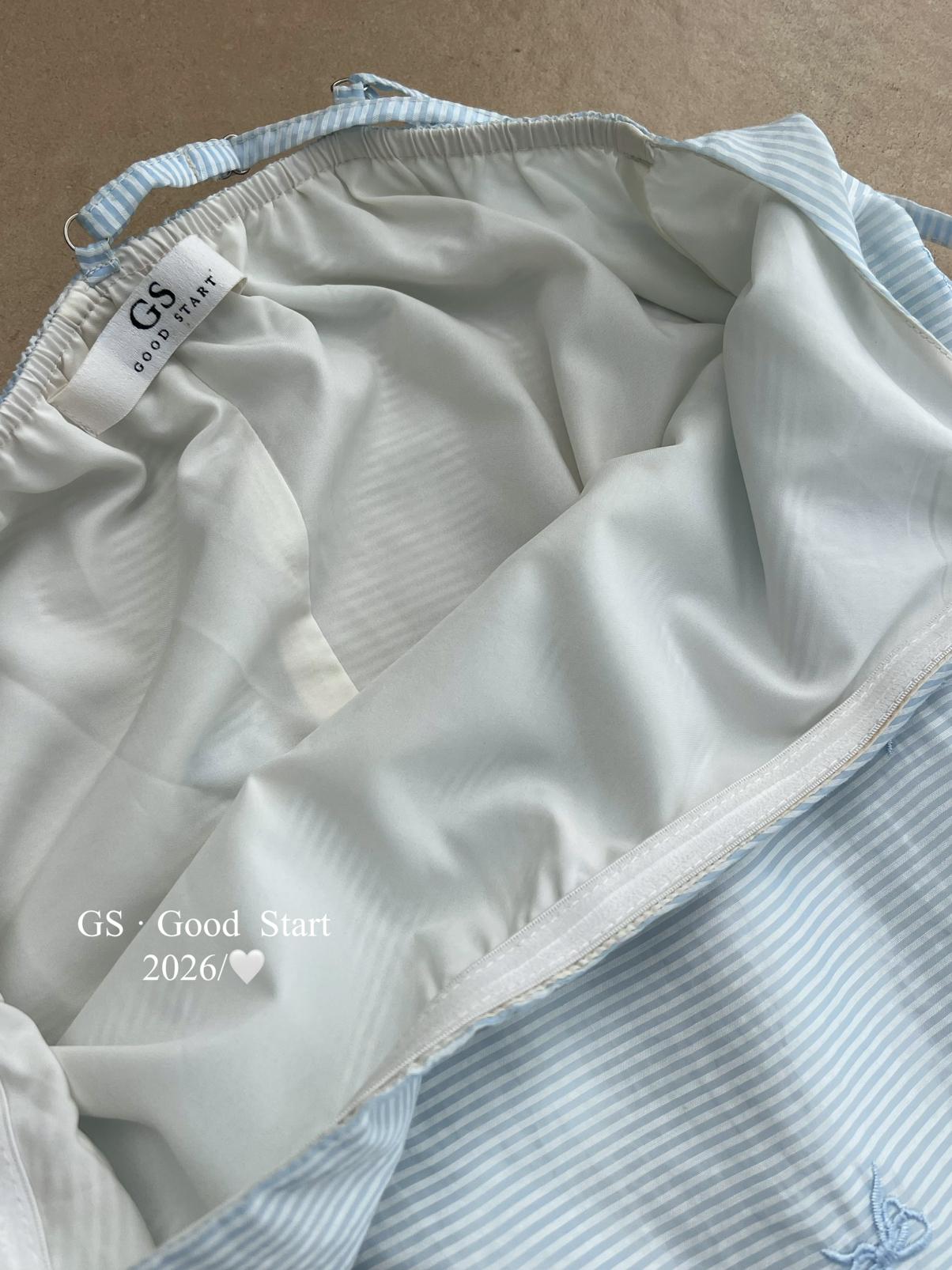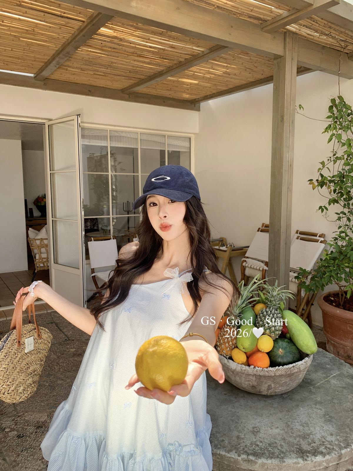 【C9128】心動蝴蝶結*倍好看!嬌俏女友感up_夏甜美條紋刺繡設計感斜肩連衣裙