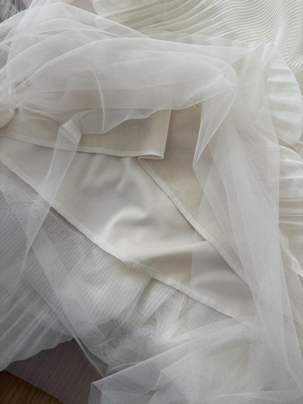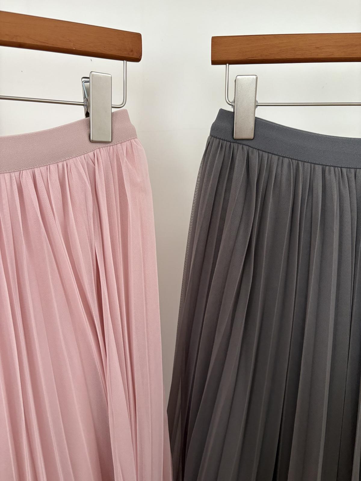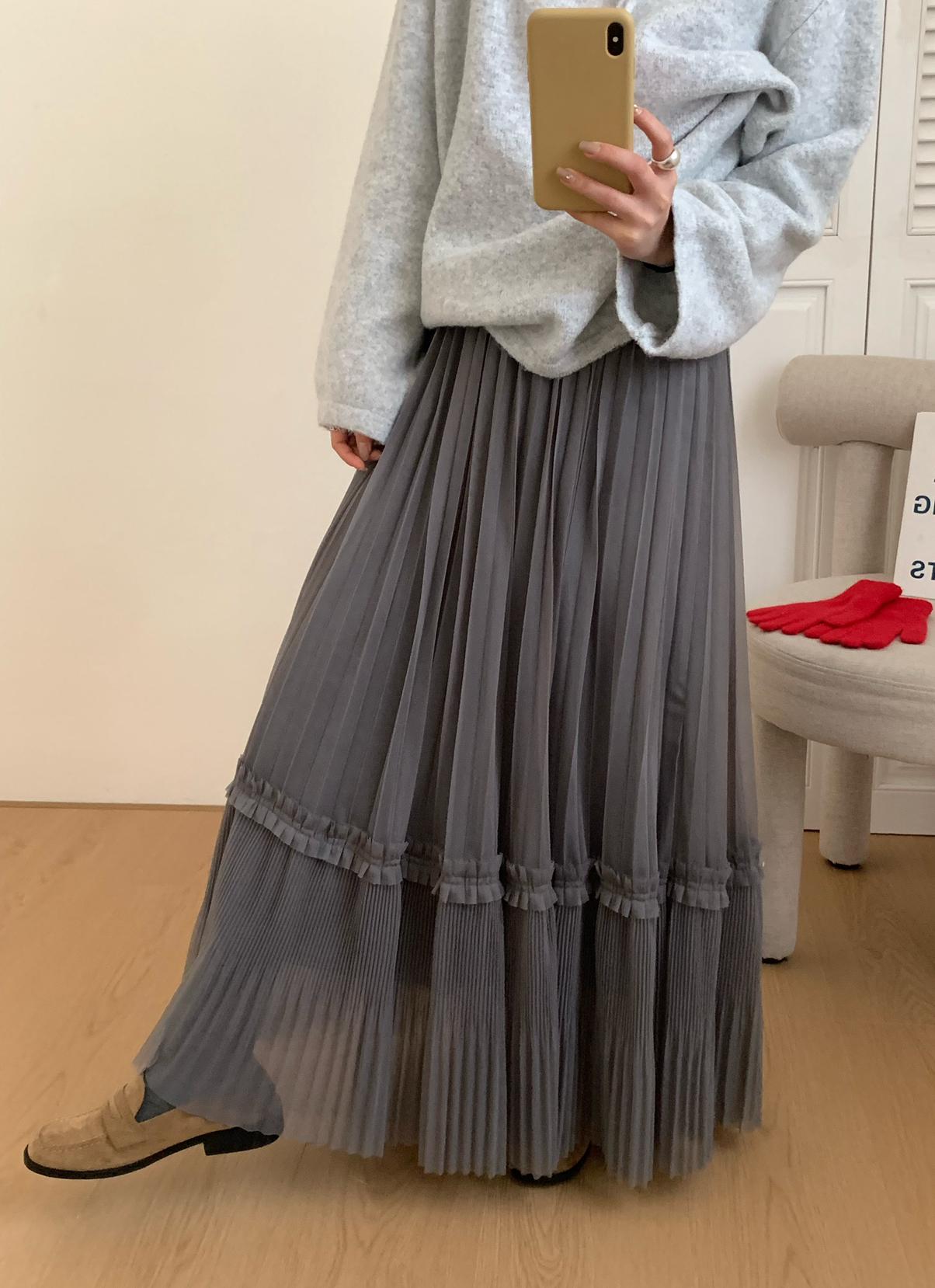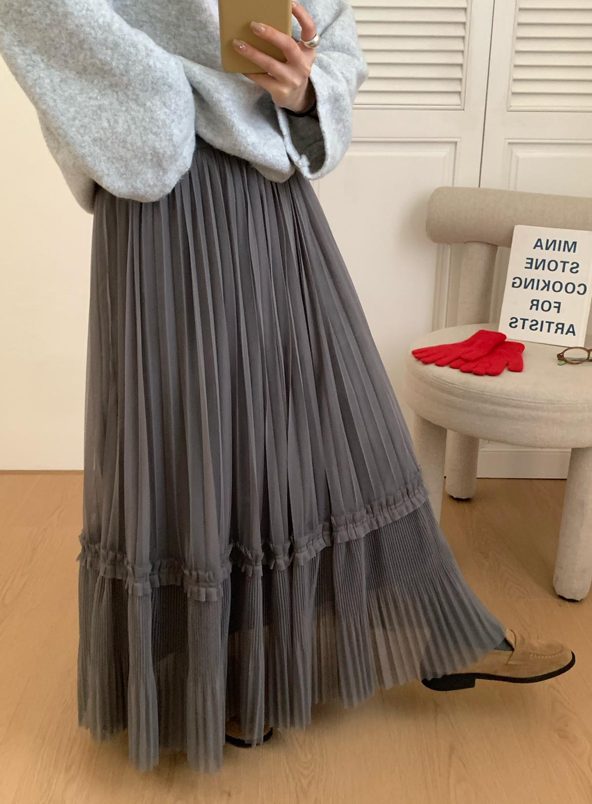 【C8302】極簡百搭純色高級感高腰抽褶A字寬鬆中長款網紗半身裙