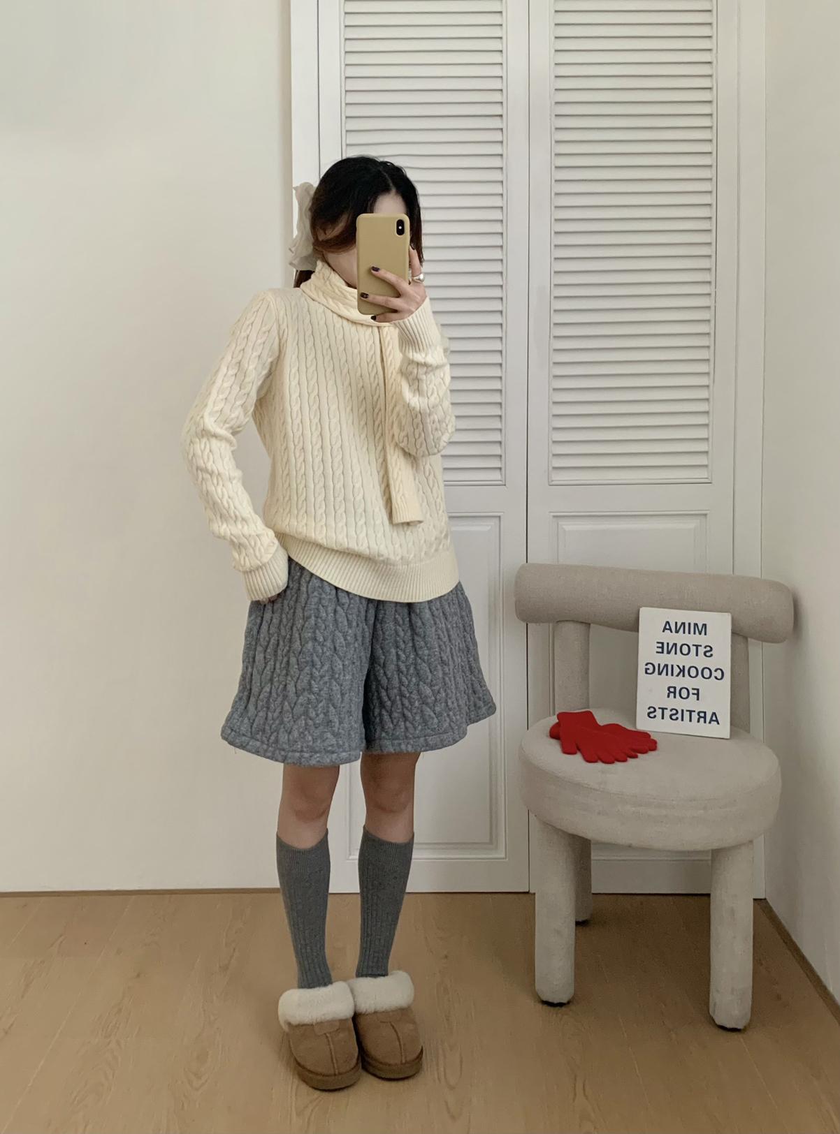 【C8266】洋氣v領撞色寬鬆大版毛衣+短褲加厚針織套裝(配圍巾)