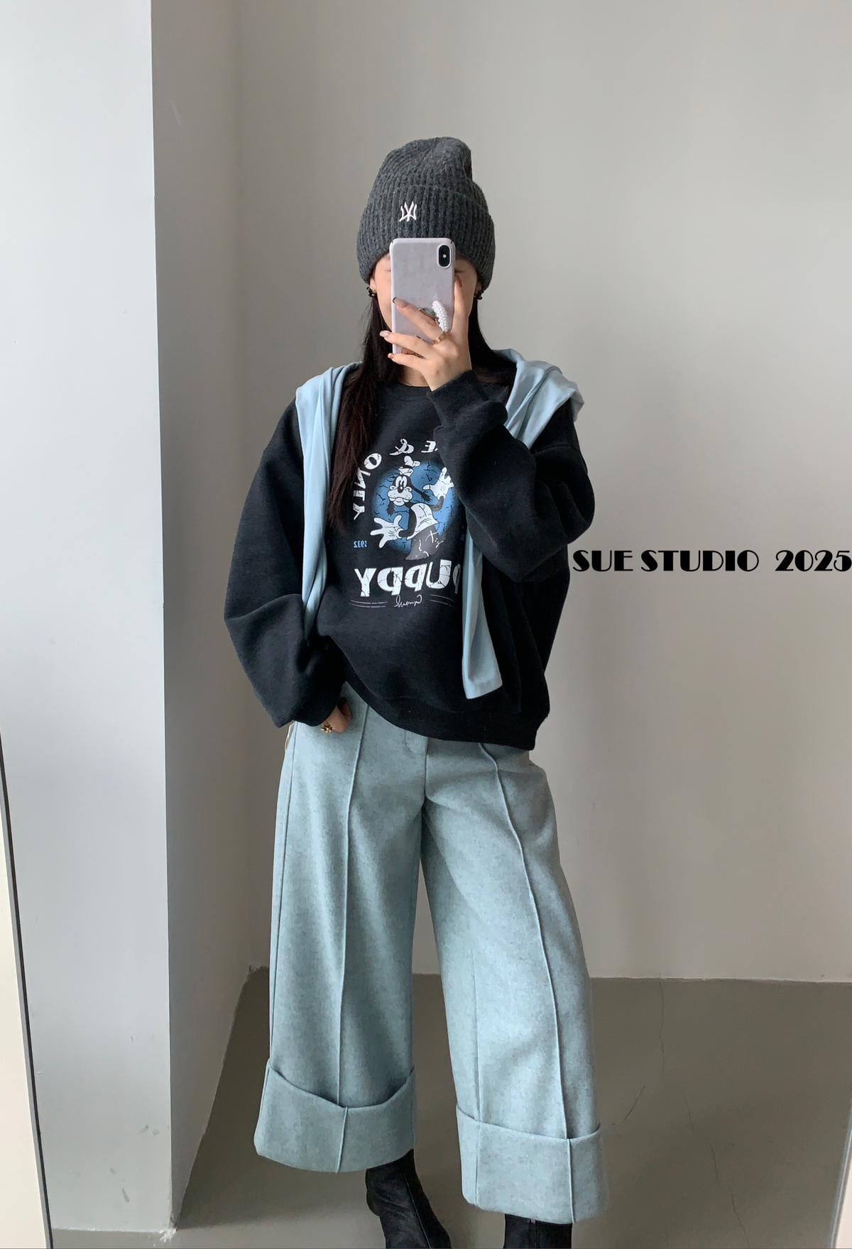 【C8230】加絨加厚簡約氣質百搭闊腿休閒褲