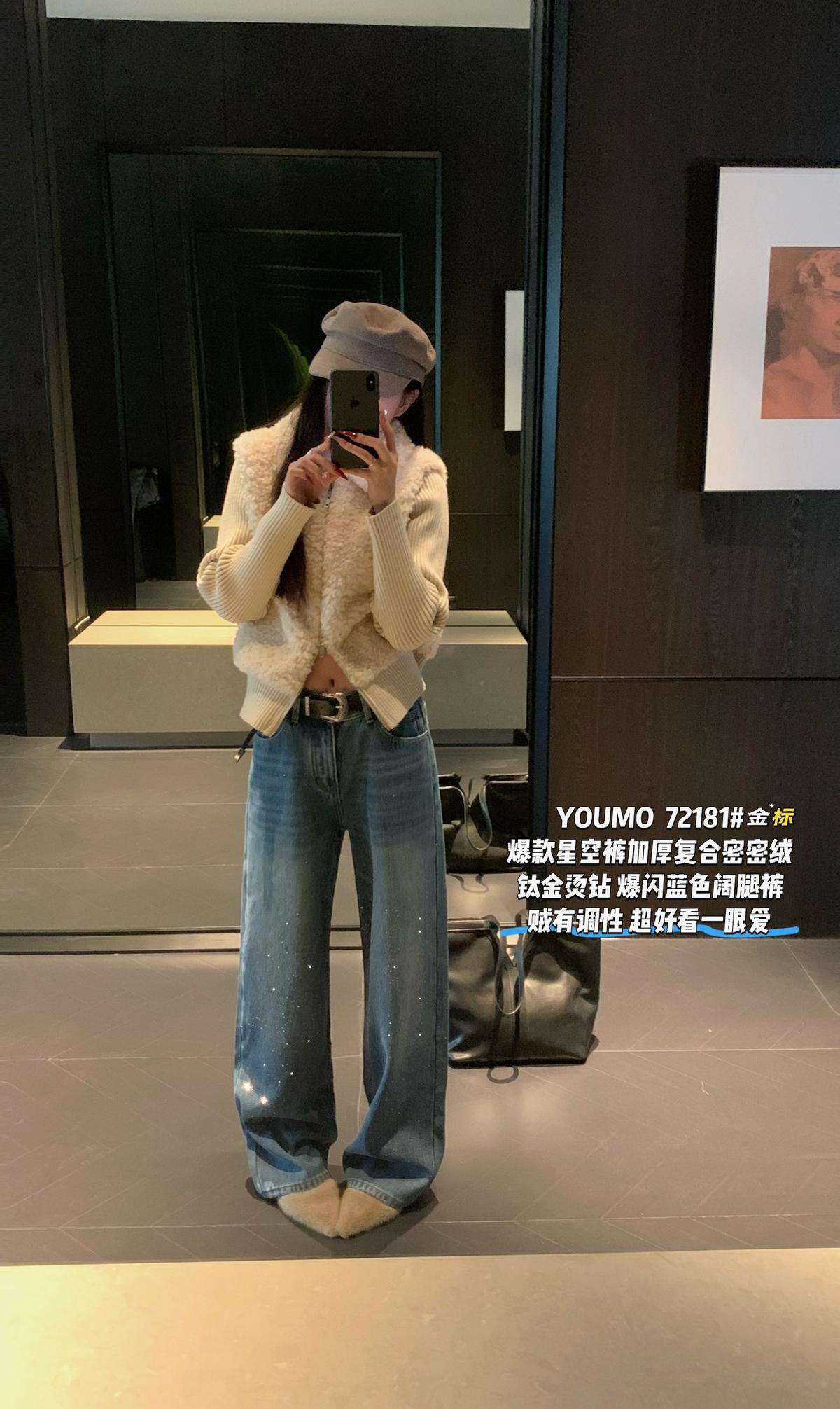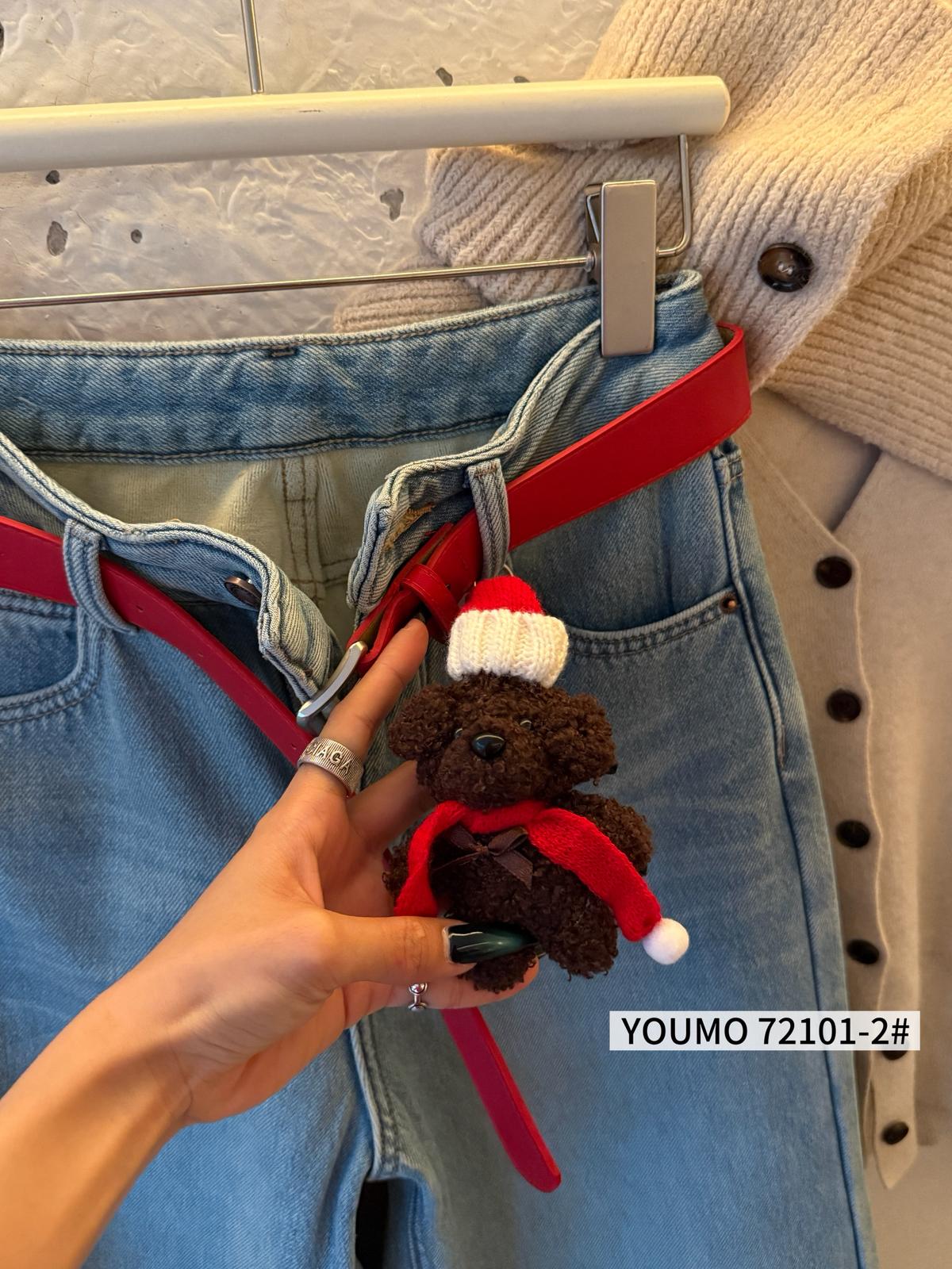 【C8146】複合絨百搭寬鬆闊腿褲牛仔褲(配腰帶、聖誕帽小熊掛件)