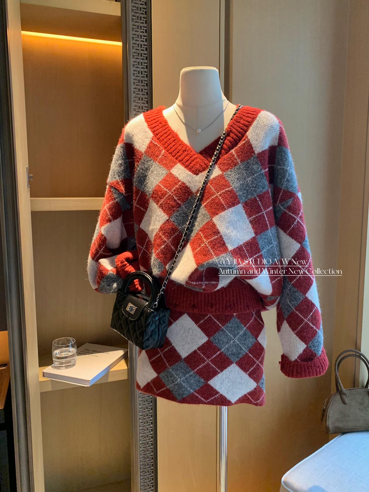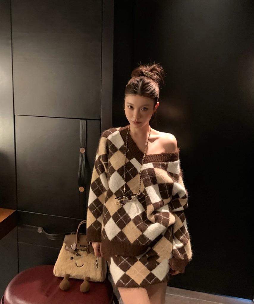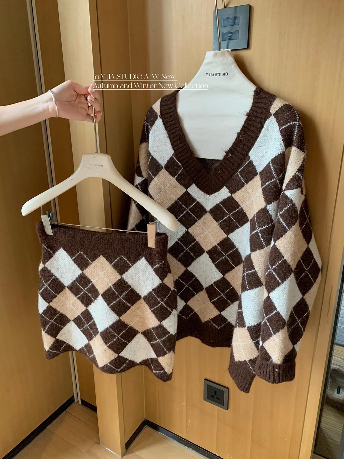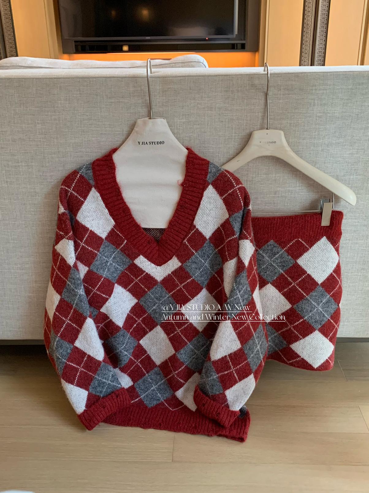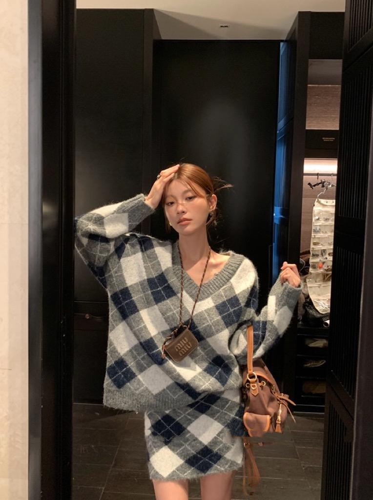 3. 【C8221】格菱布朗尼 撞色菱格V領毛衣+包臀半身裙套裝