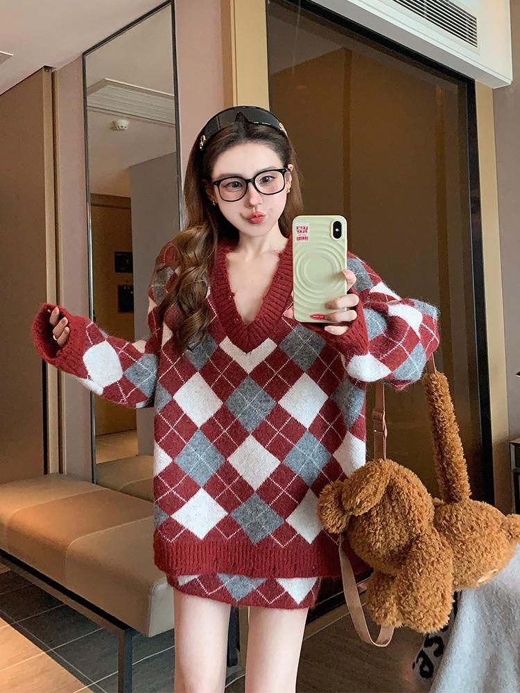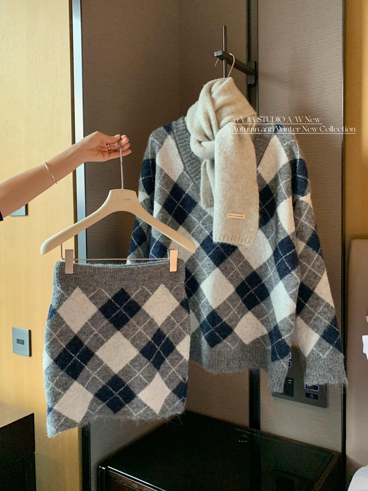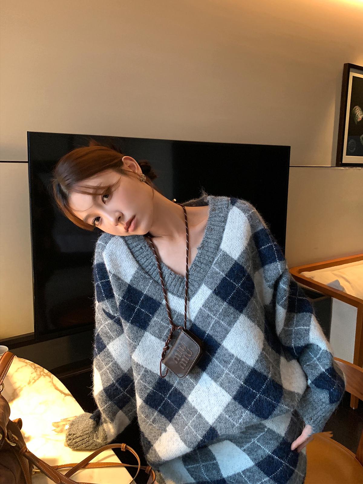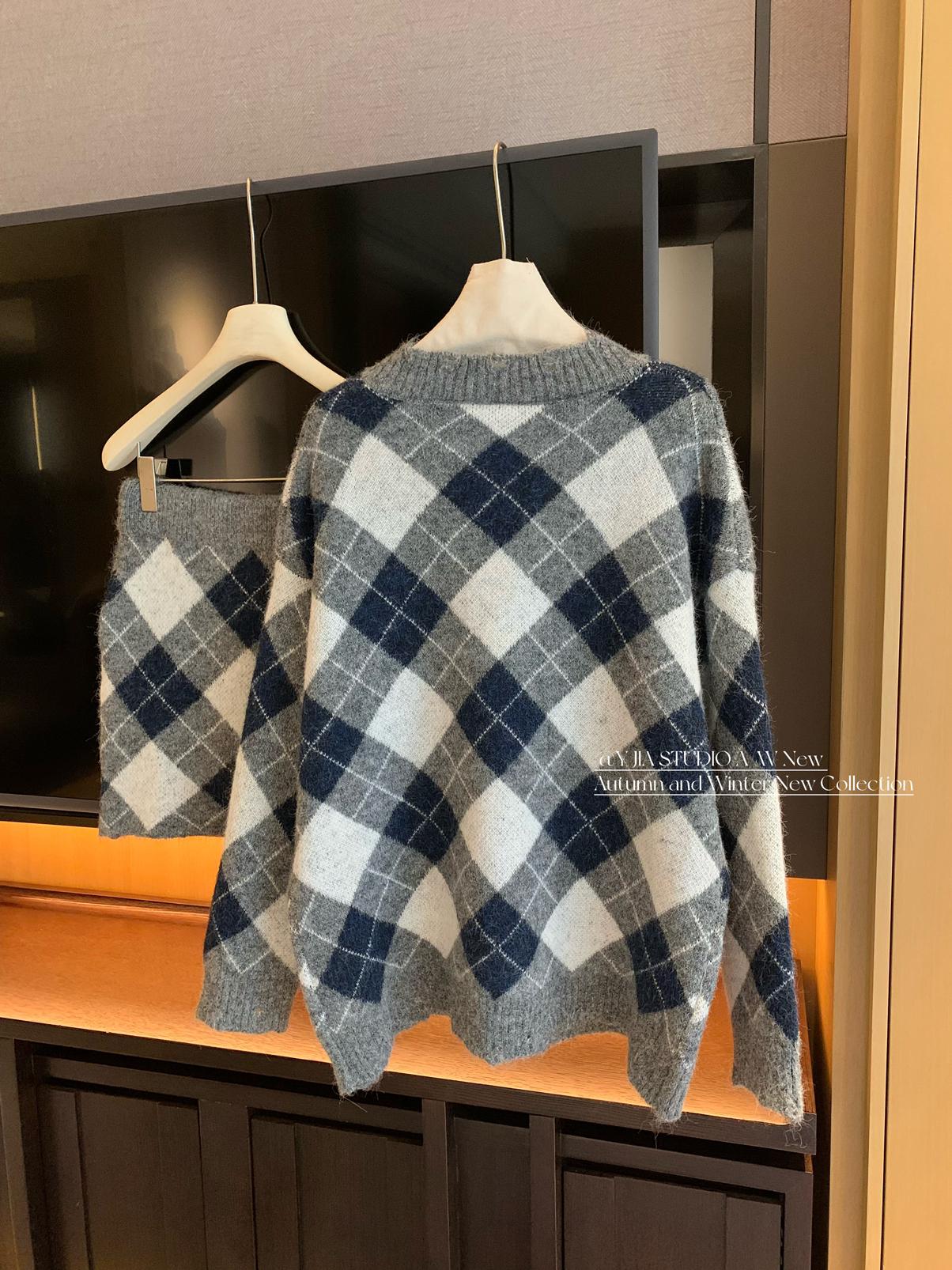 3. 【C8221】格菱布朗尼 撞色菱格V領毛衣+包臀半身裙套裝