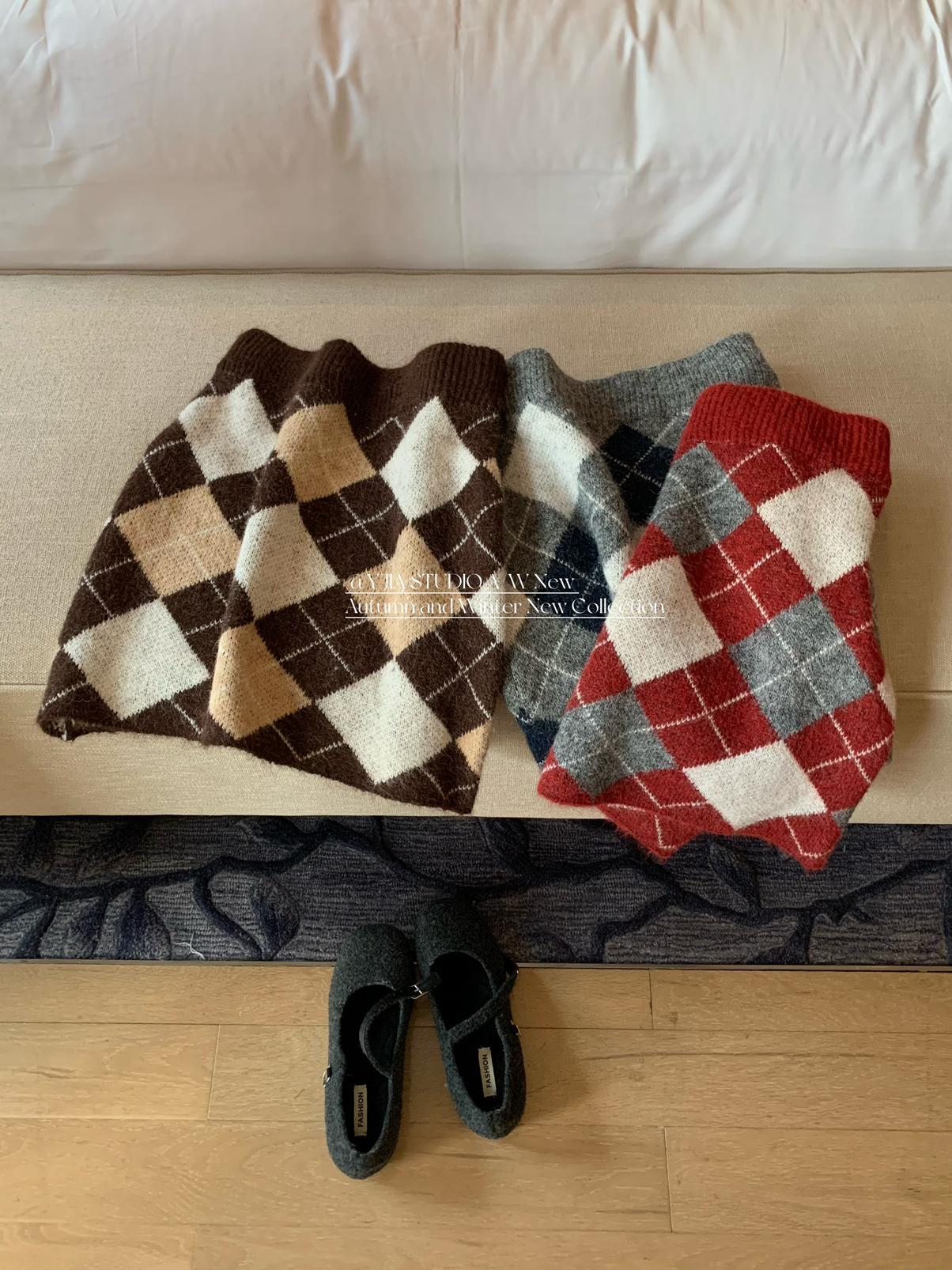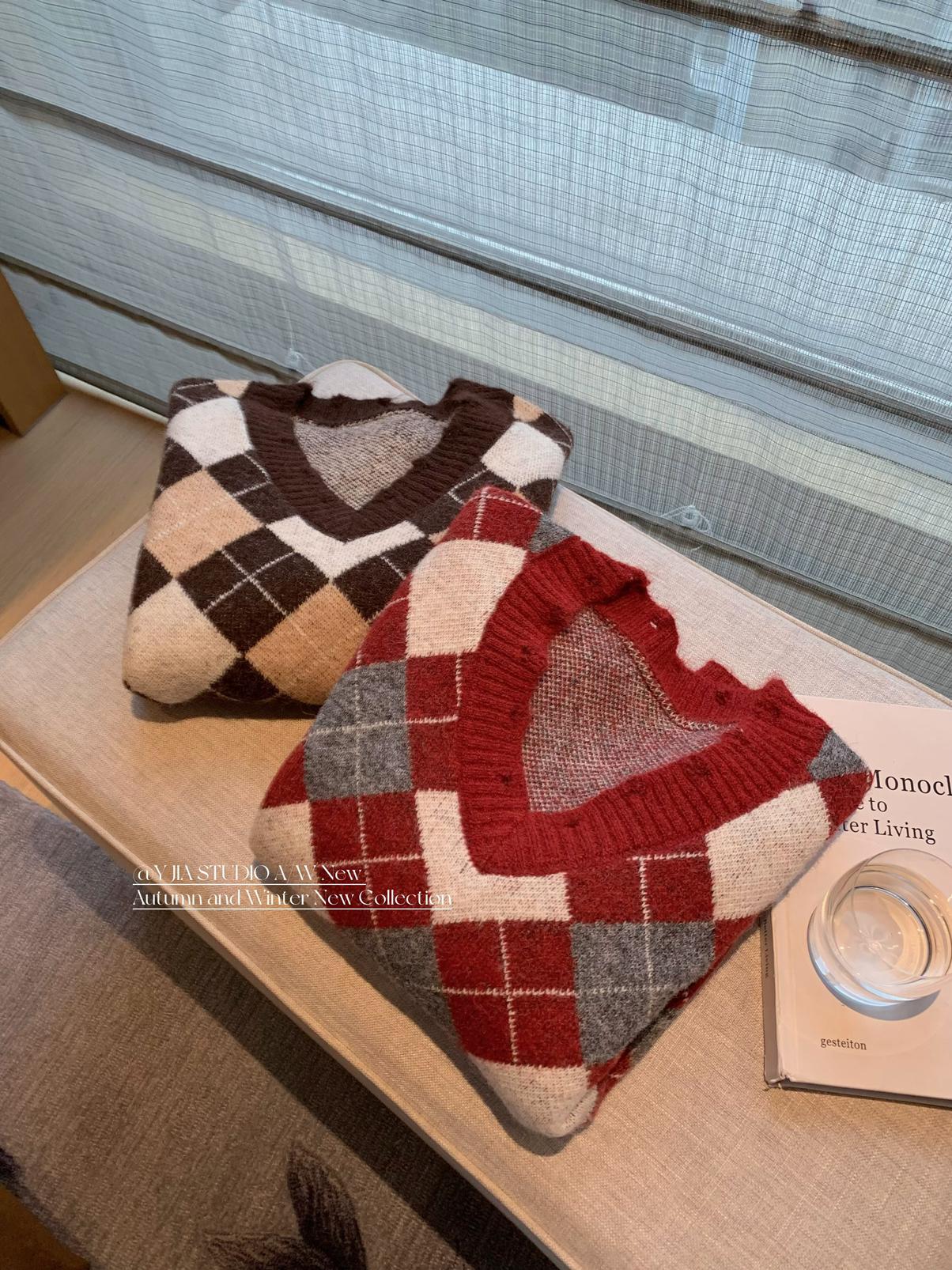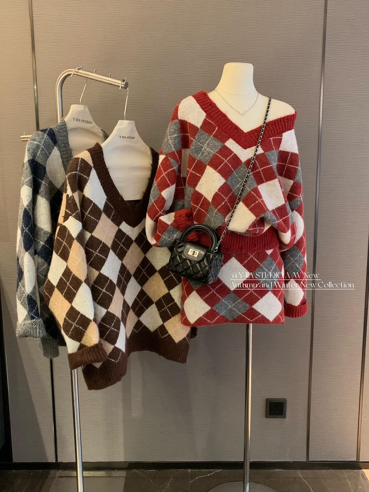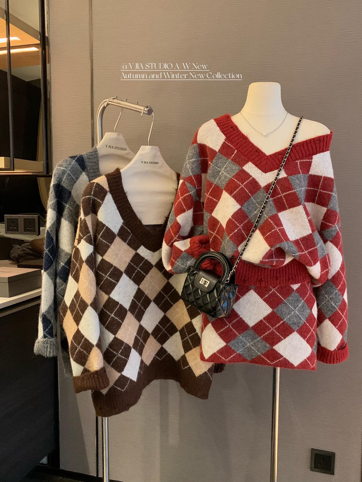 3. 【C8221】格菱布朗尼 撞色菱格V領毛衣+包臀半身裙套裝